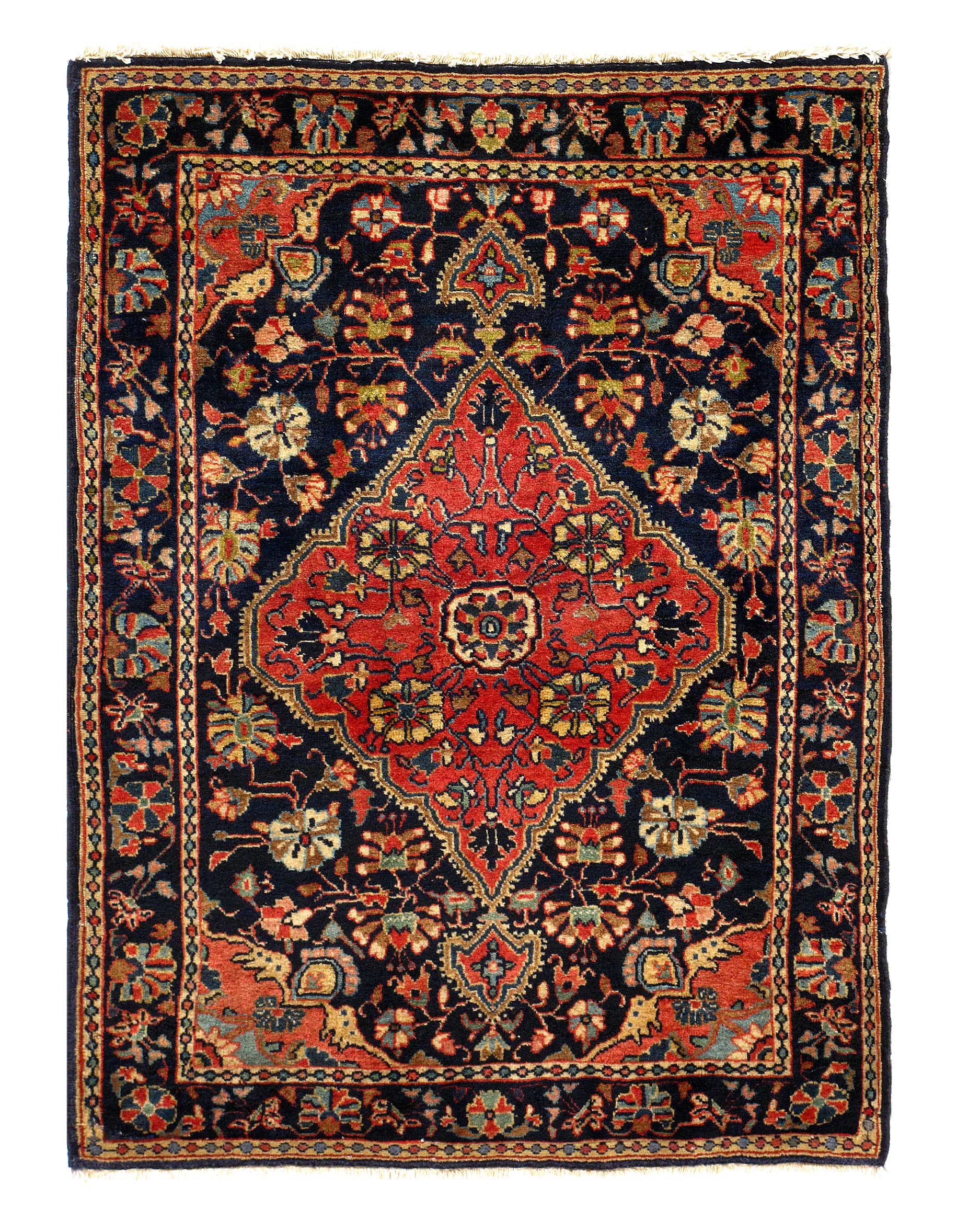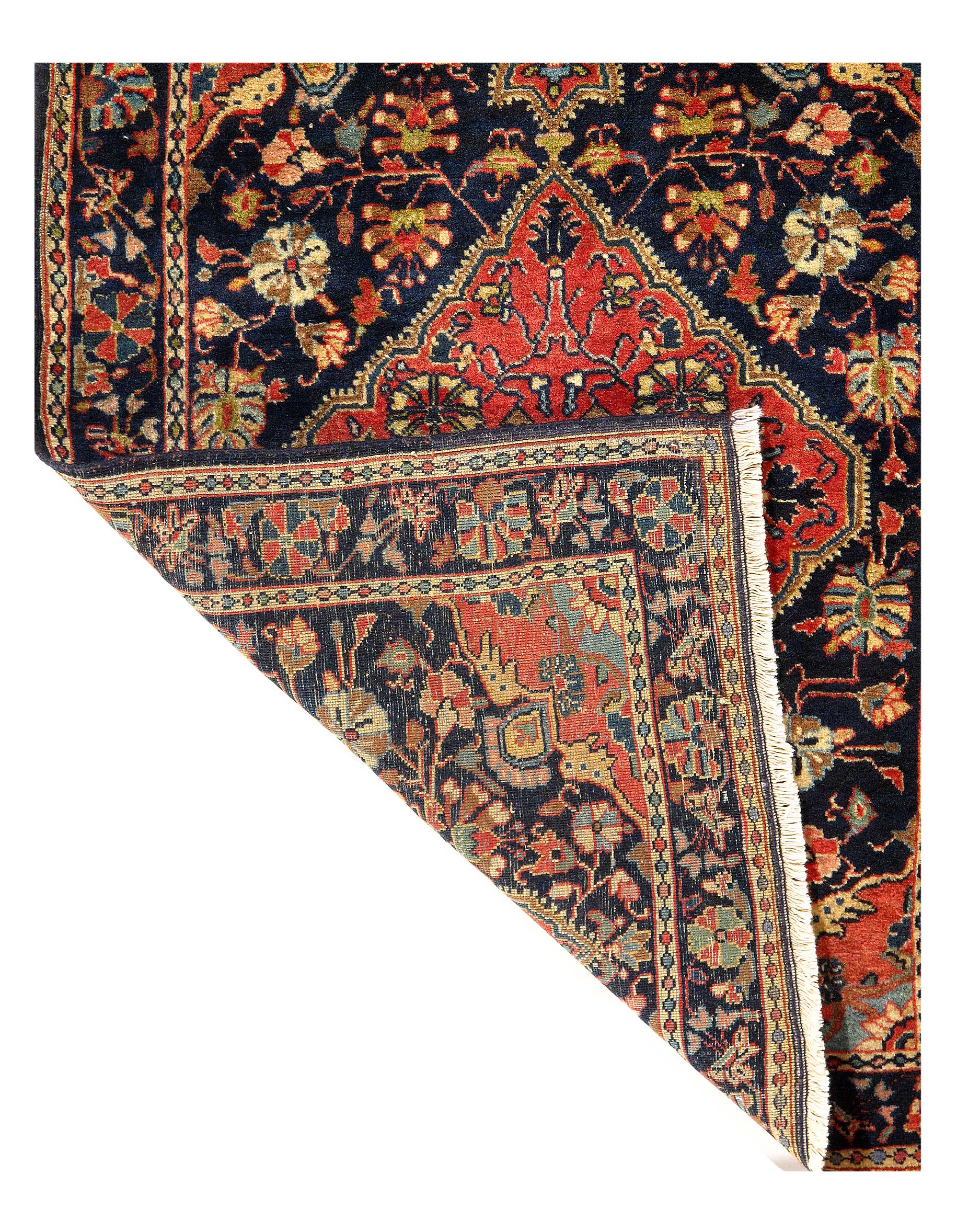 Magnificent Small Size and Finely Woven Antique Persian Sarouk Farahan Rug D09508, Country of Origin / Rug Type: Persian Rug, Circa Date: 1900 β This marvelous small size and finely woven antique Persian Sarouk Farahan rug is a masterpiece of enigmatic beauty. Rich tones of brick red, navy blue, create a mysteriously captivating aura. The cream colored outlines contrast beautifully with this darker backdrop, highlighting its rich contrasts even more. Delicate and somewhat primitive vine scrolls and floral decorations are added to this breathtaking Persian rug for a natural idyllic touch.