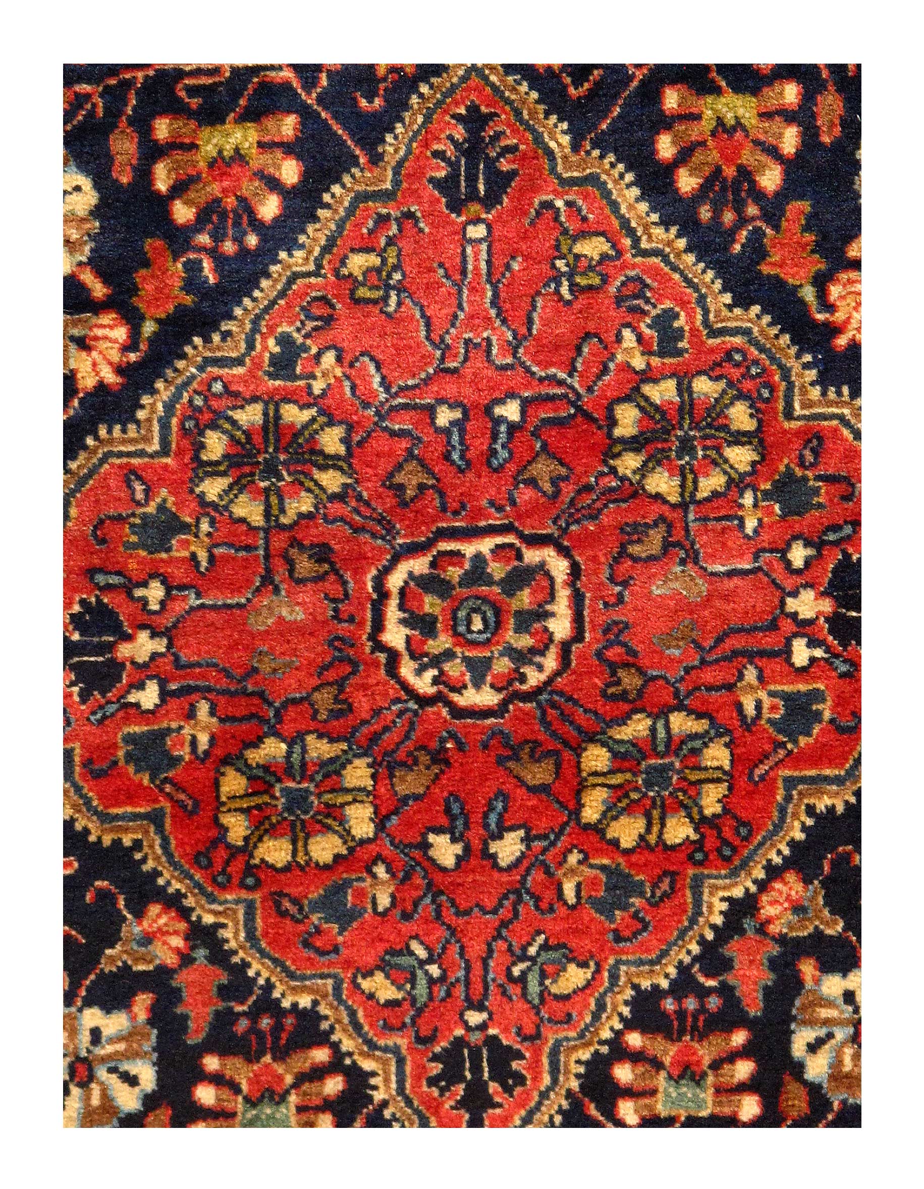 The rich brick red colored central medallion is set against the light creamy white color of central field. This creates a magnificently exciting juxtaposition which also helps to showcase the beautiful intricacy of the design patterns.