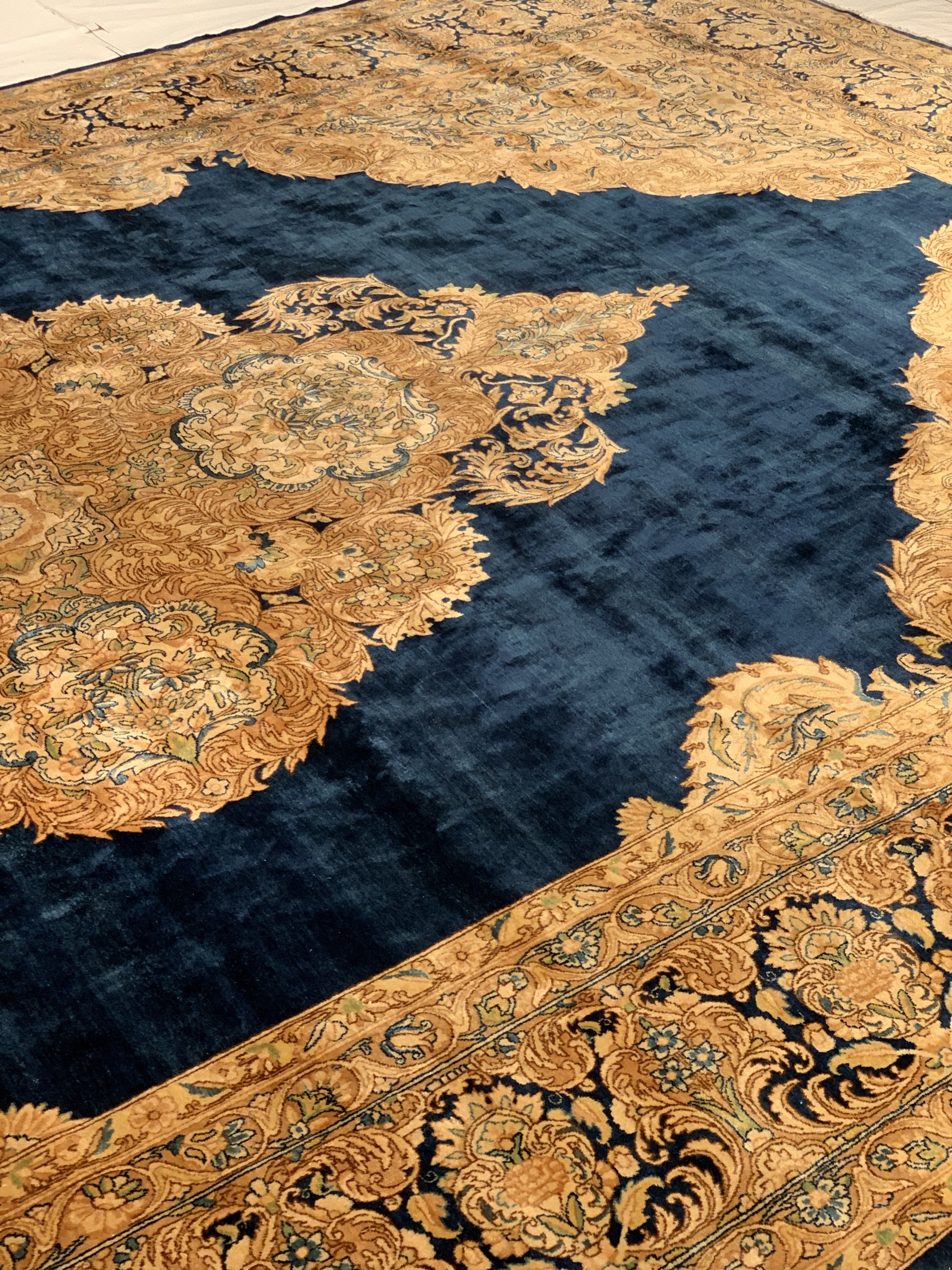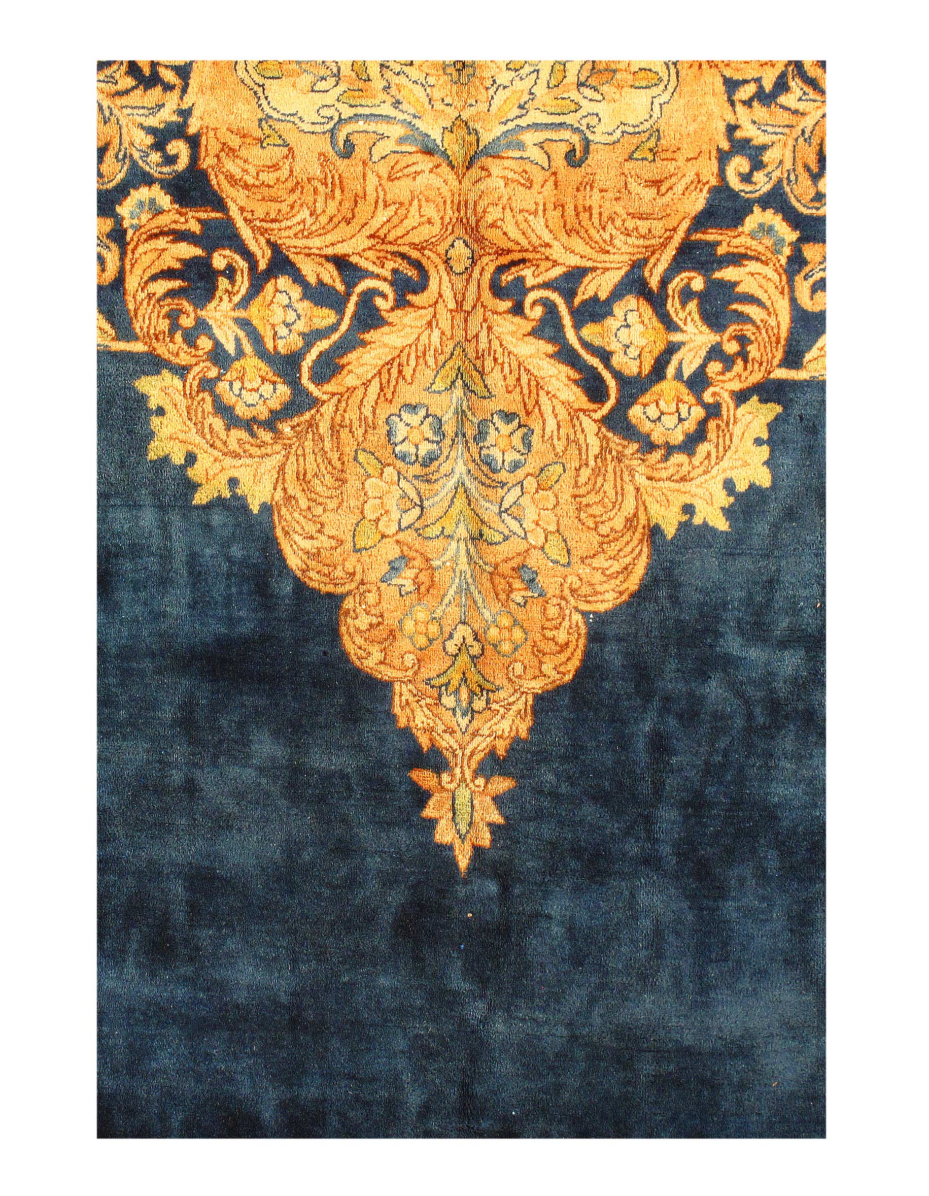 The expansive central field design has large circular palmetts are refined and elegant. These somewhat abstract large scale patterns are all interconnected by meandering floral vine scroll patterns that seem to flow seamlessly into and out of one another.