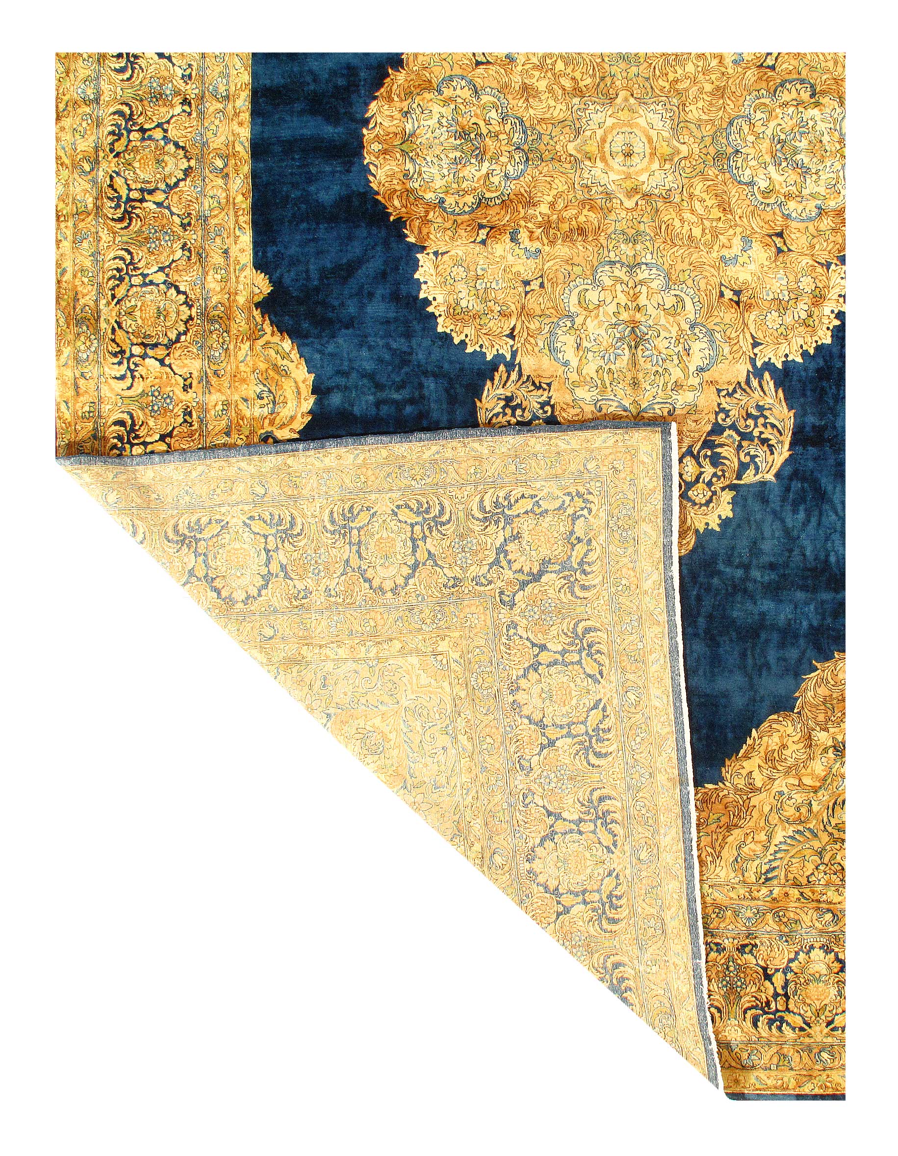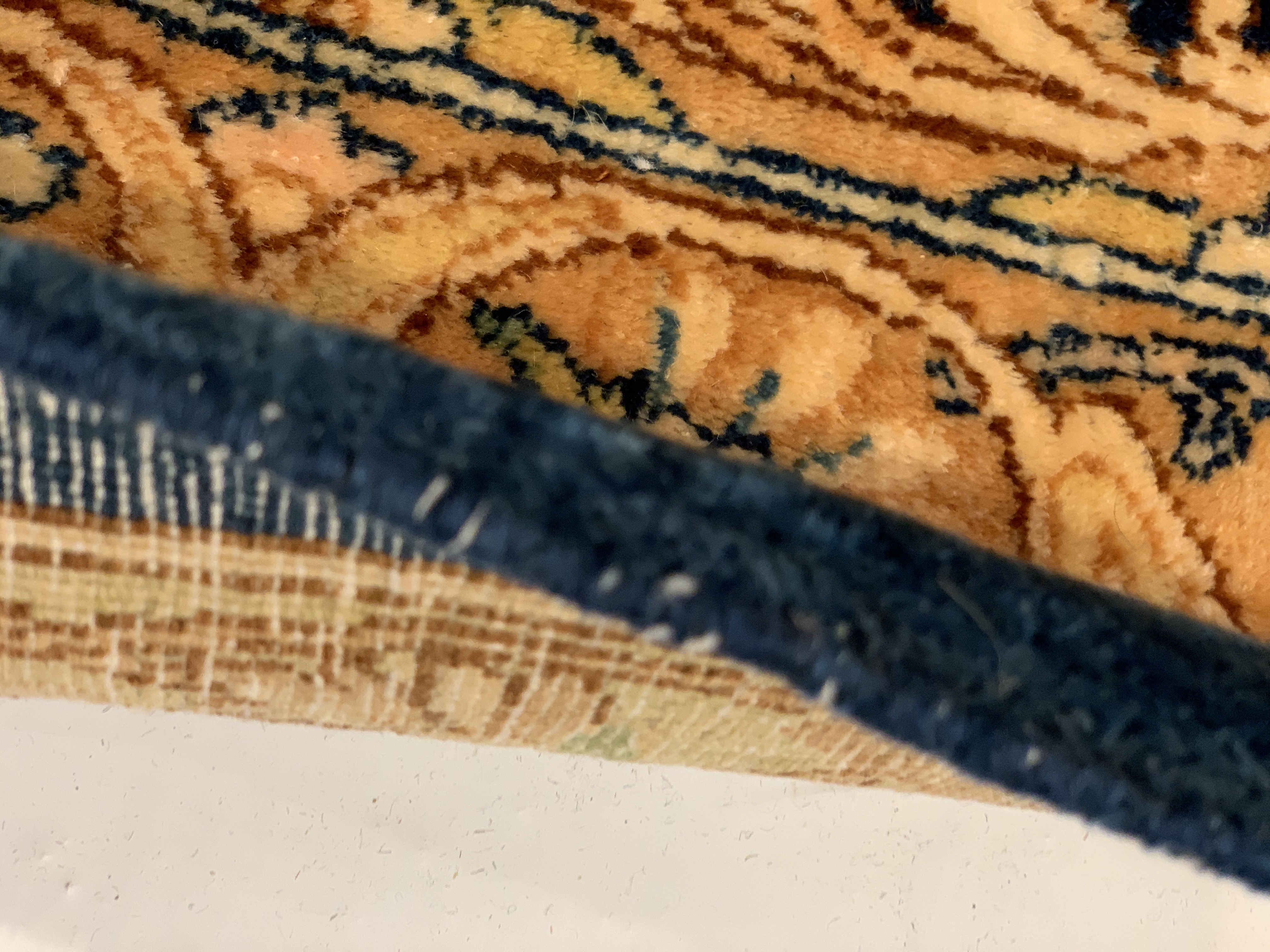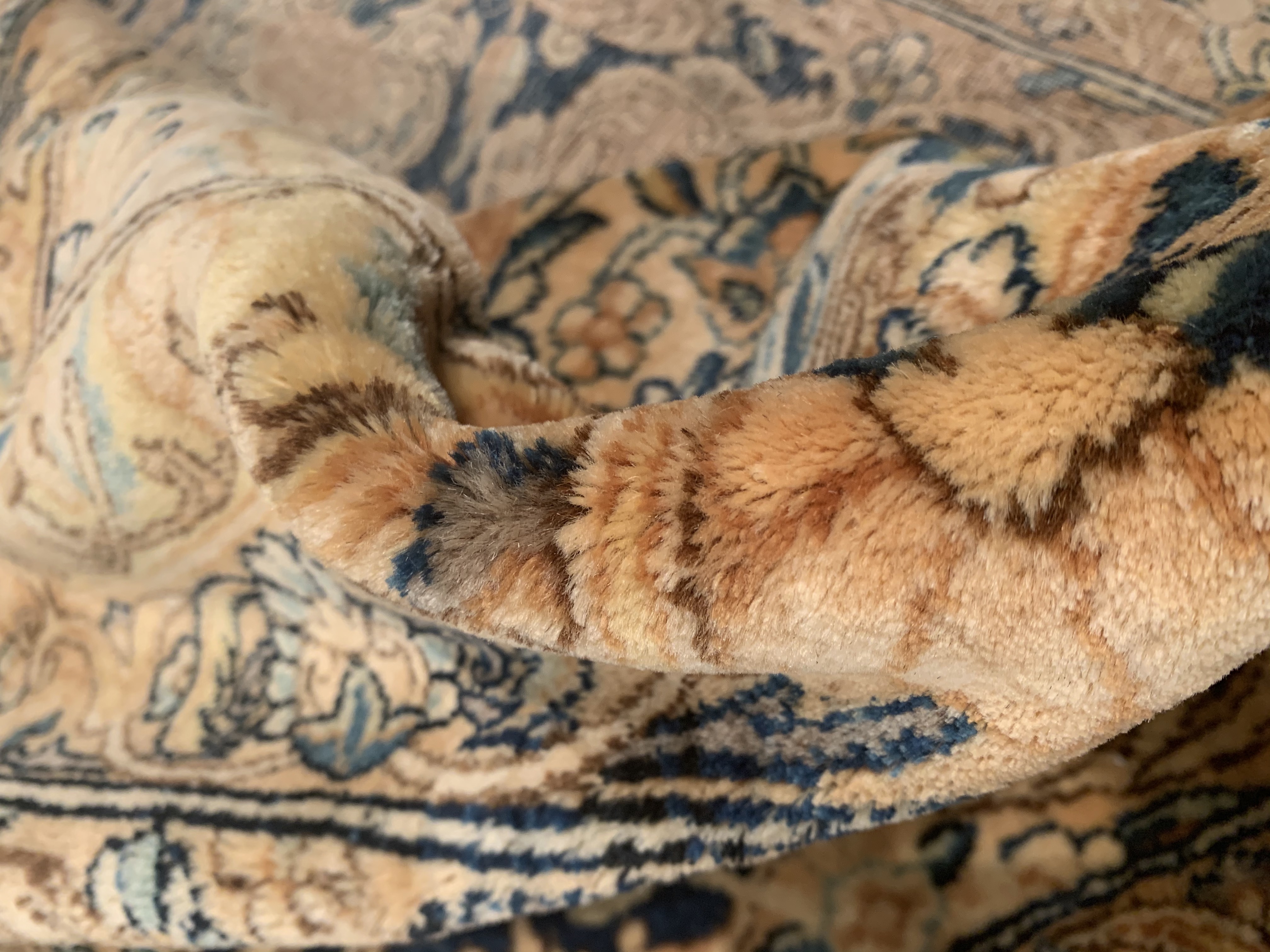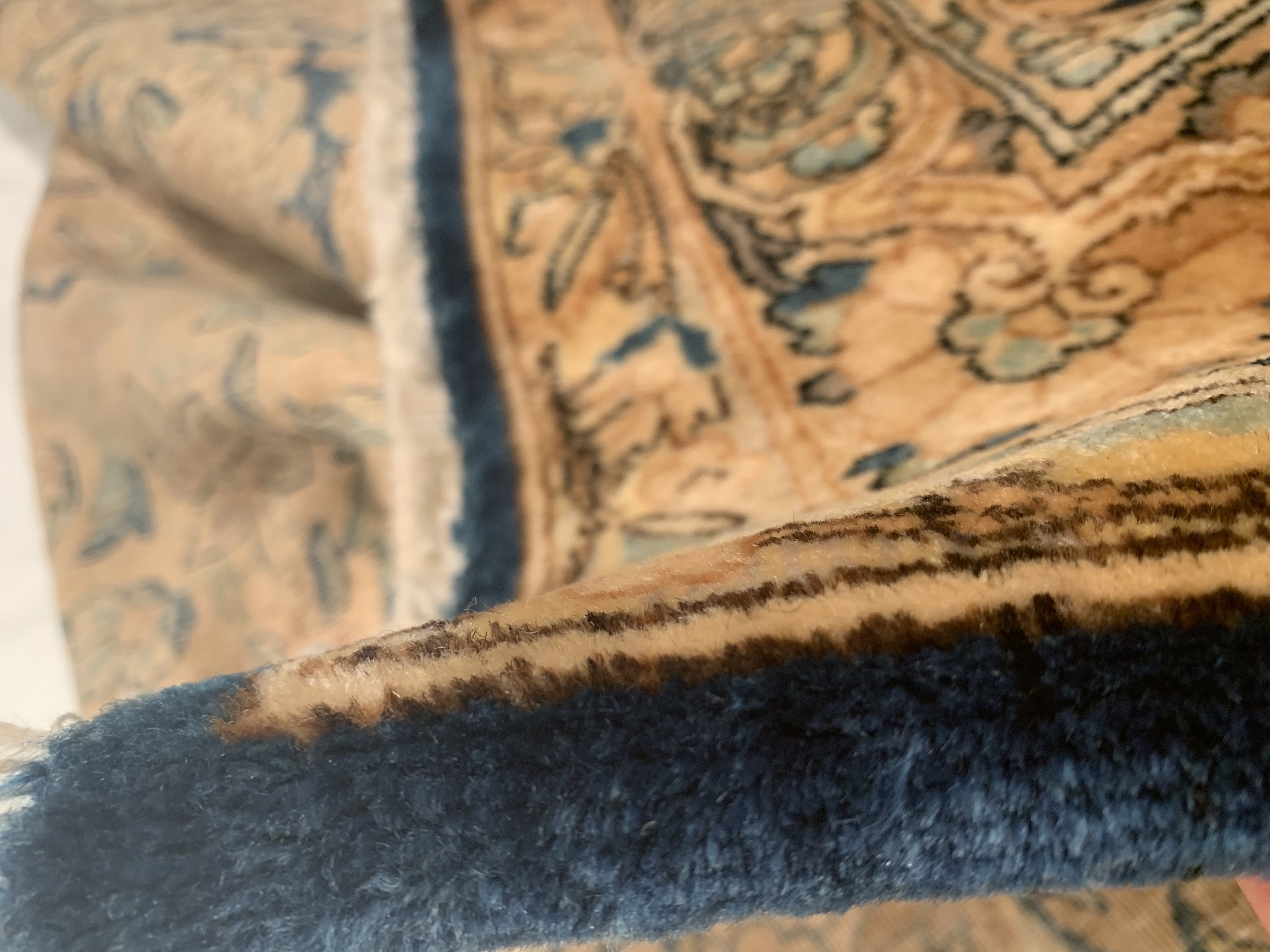 The outer most borders both feature refined floral patterns that are interconnected through a long vine scroll. The first guard border features a tan background and mostly blue line work. This plays off the other narrow guard border beautifully which features a light blue background and mostly brown line work as well as the main border which is an amalgam of both. This play on alternating colors and symmetry creates such a magnificent flow and soothing artistic impact.