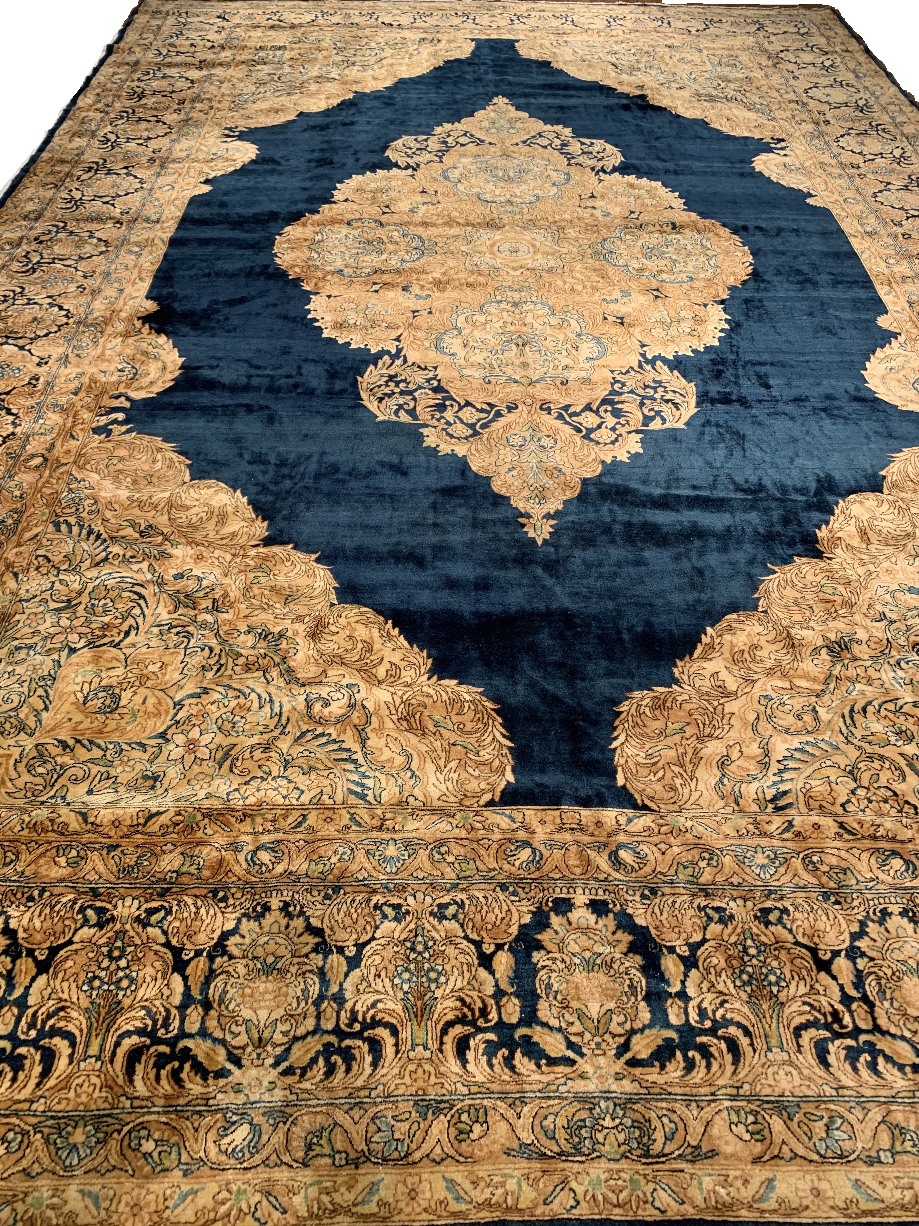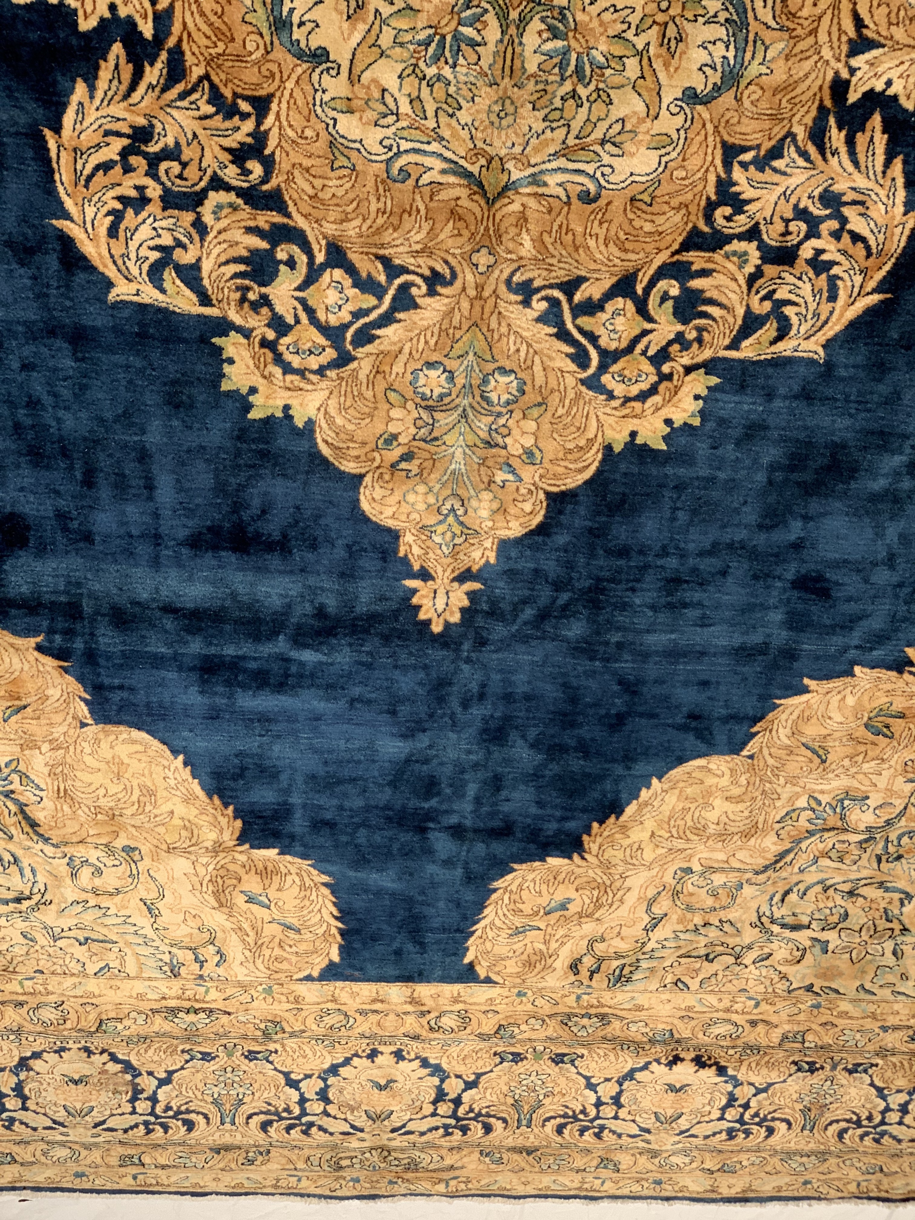 In the foreground of the central inner design, many shades of brow, blue, and beige are used. These soft and soothing colors all subtly add to the overall complexity and beauty of this jaw dropping antique Persian Kerman carpet.