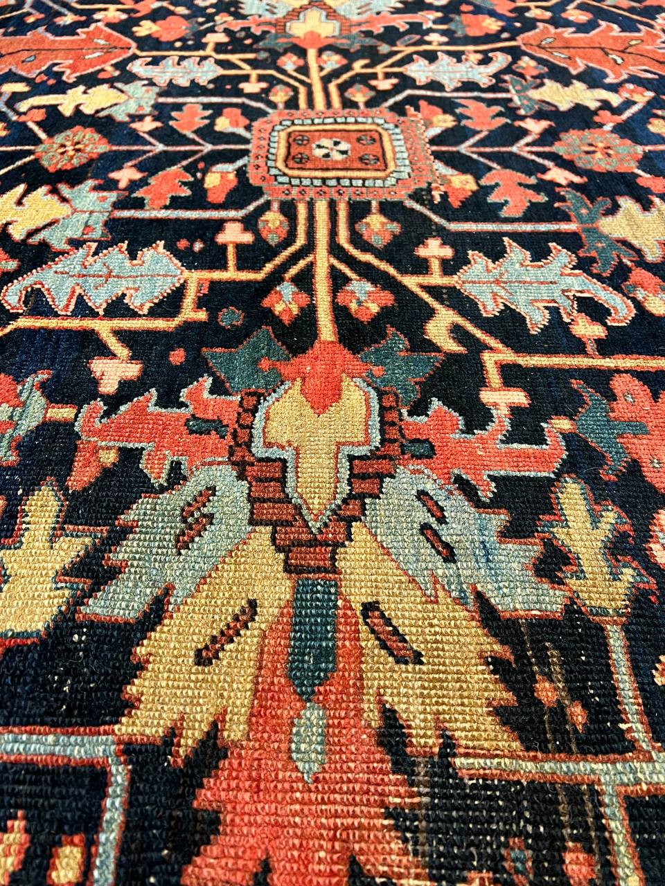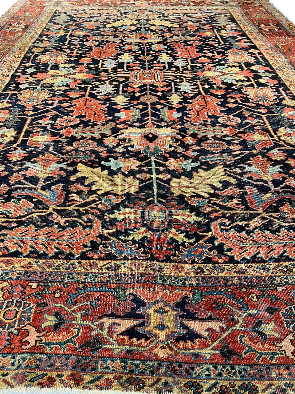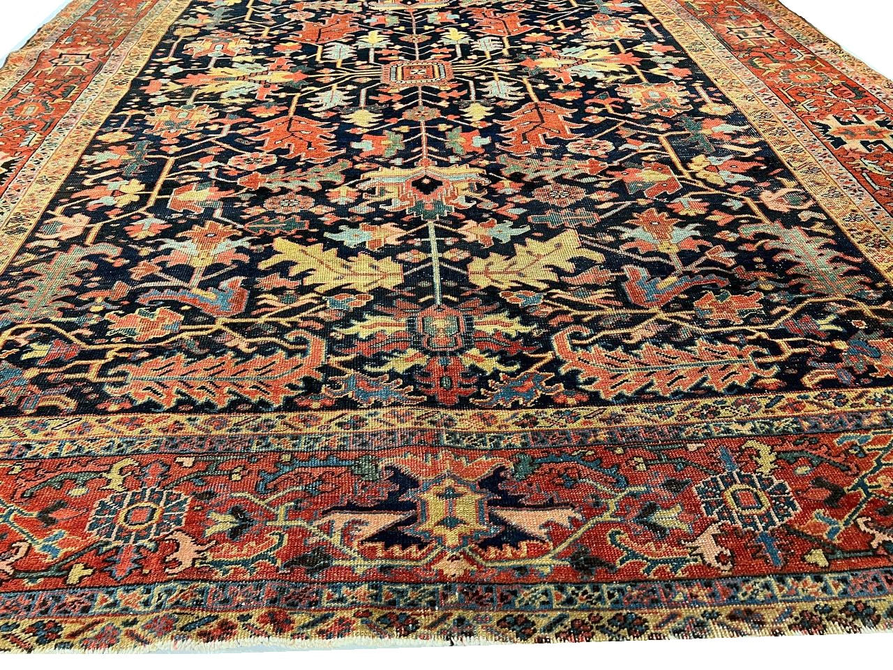 Beautiful antique Heriz Serapi hand-knotted wool rug with a blue field. This Heriz rug has an orange-rust designed frame and multi-color accents in a gorgeous all-over floral design.
