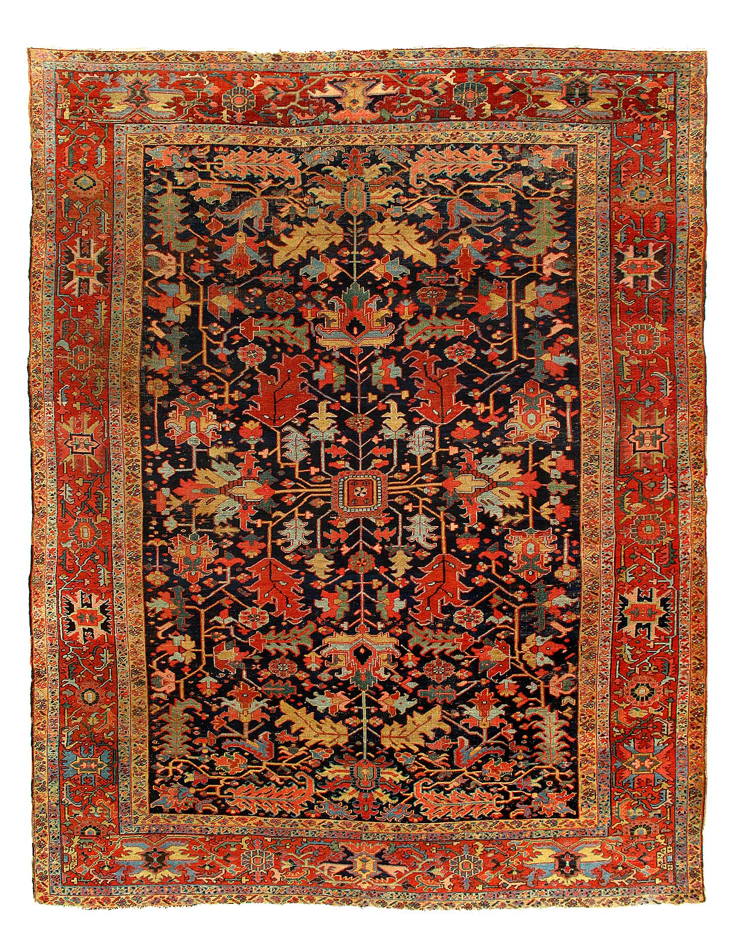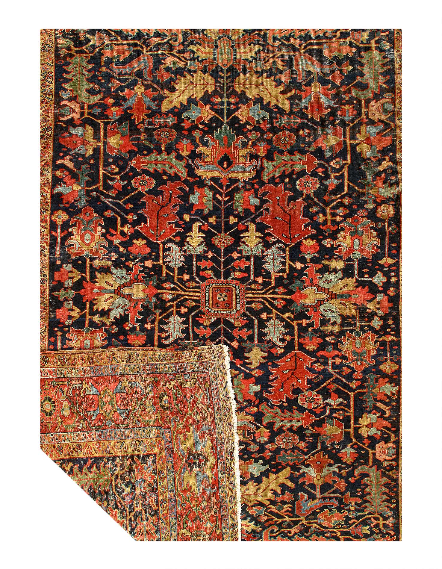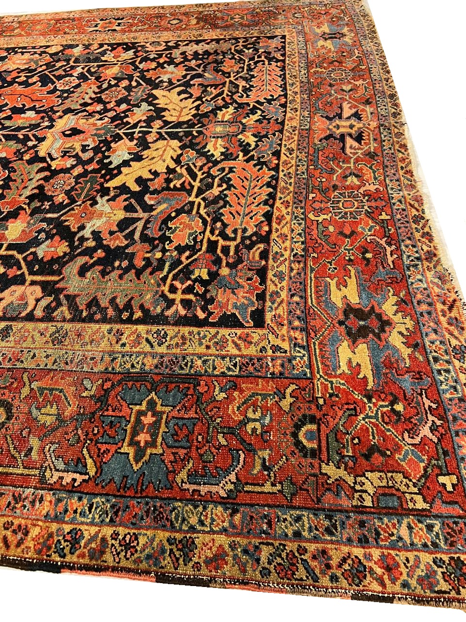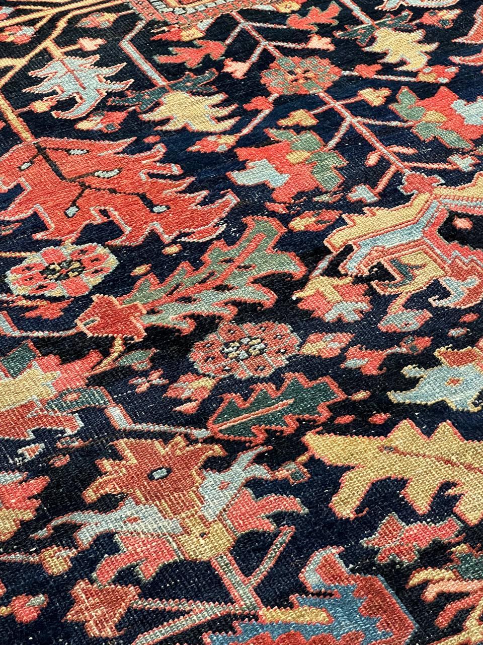Beautiful antique Heriz Serapi hand-knotted wool rug with a blue field. This Heriz rug has an orange-rust designed frame and multi-color accents in a gorgeous all-over floral design.