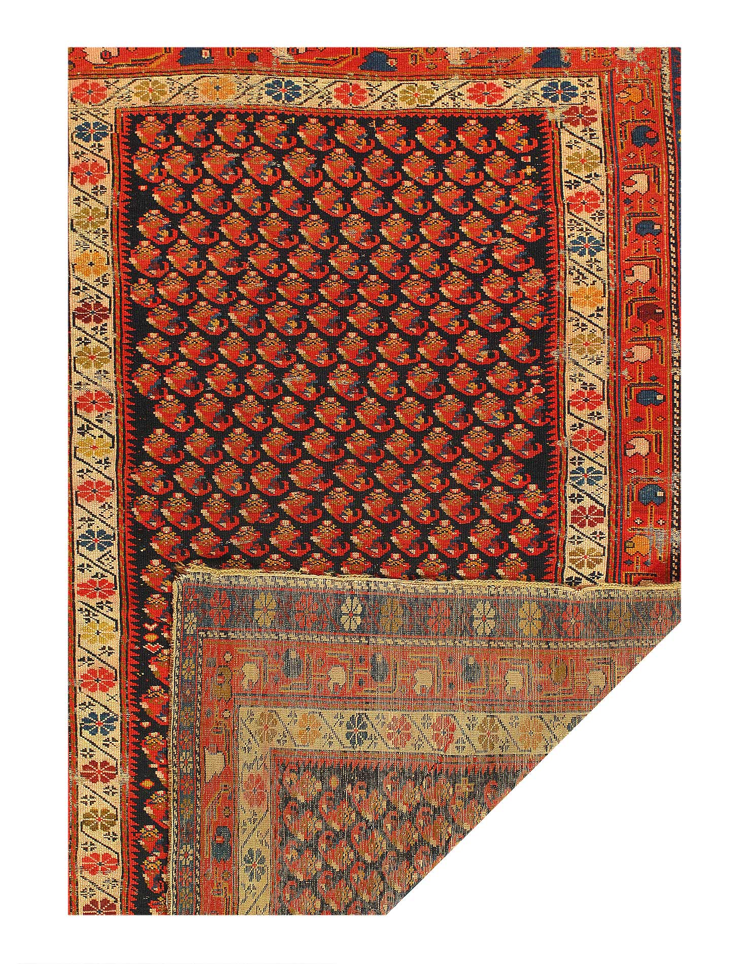 One example of this is the little animal tucked into the left-hand edge of the boteh band. You will also notice that several of the dots in the center of the band are not dots but appear to be letters or writing. These little nuances are what give Shirvan rugs their character and are one of the reasons for their popularity.
