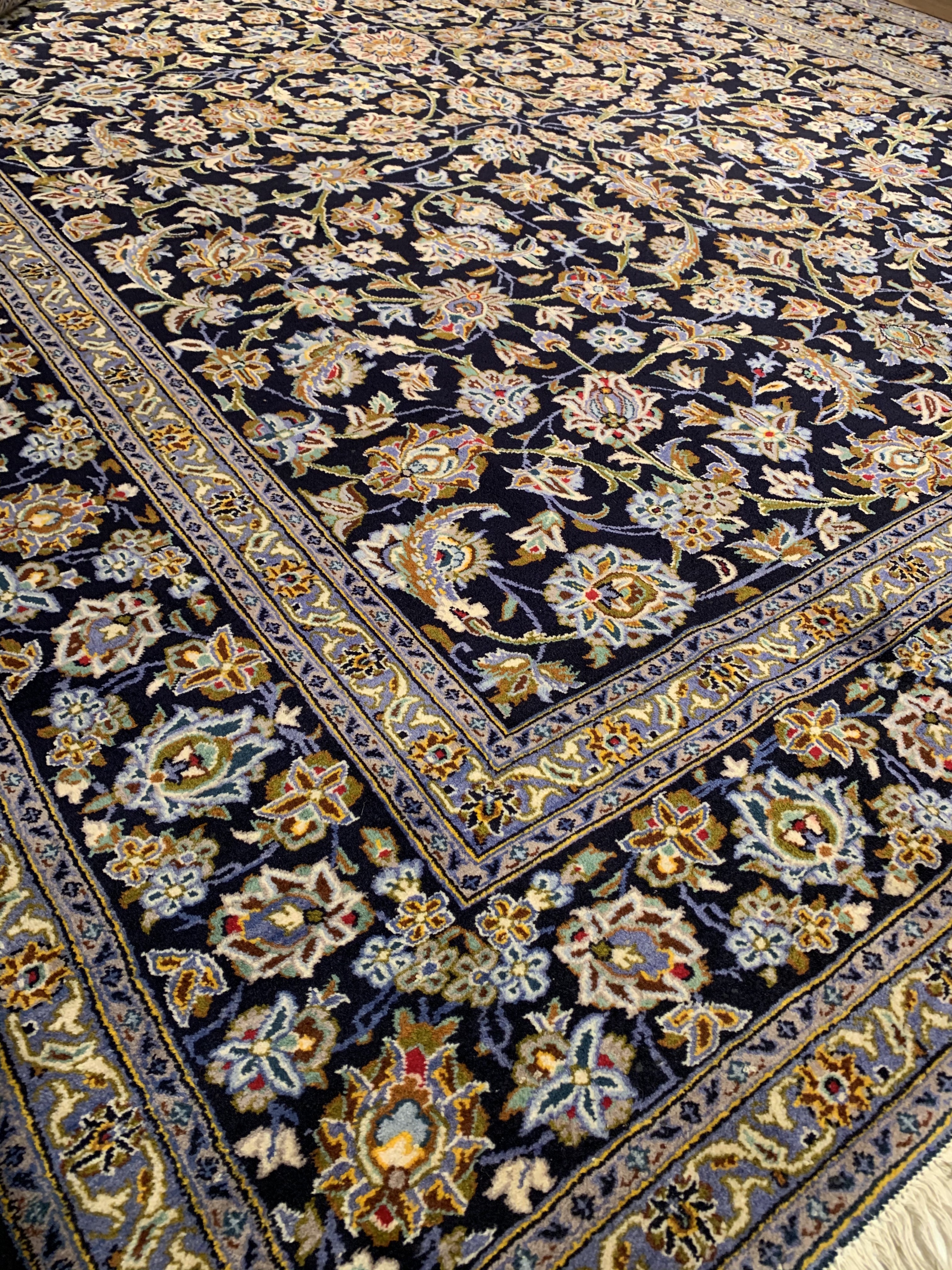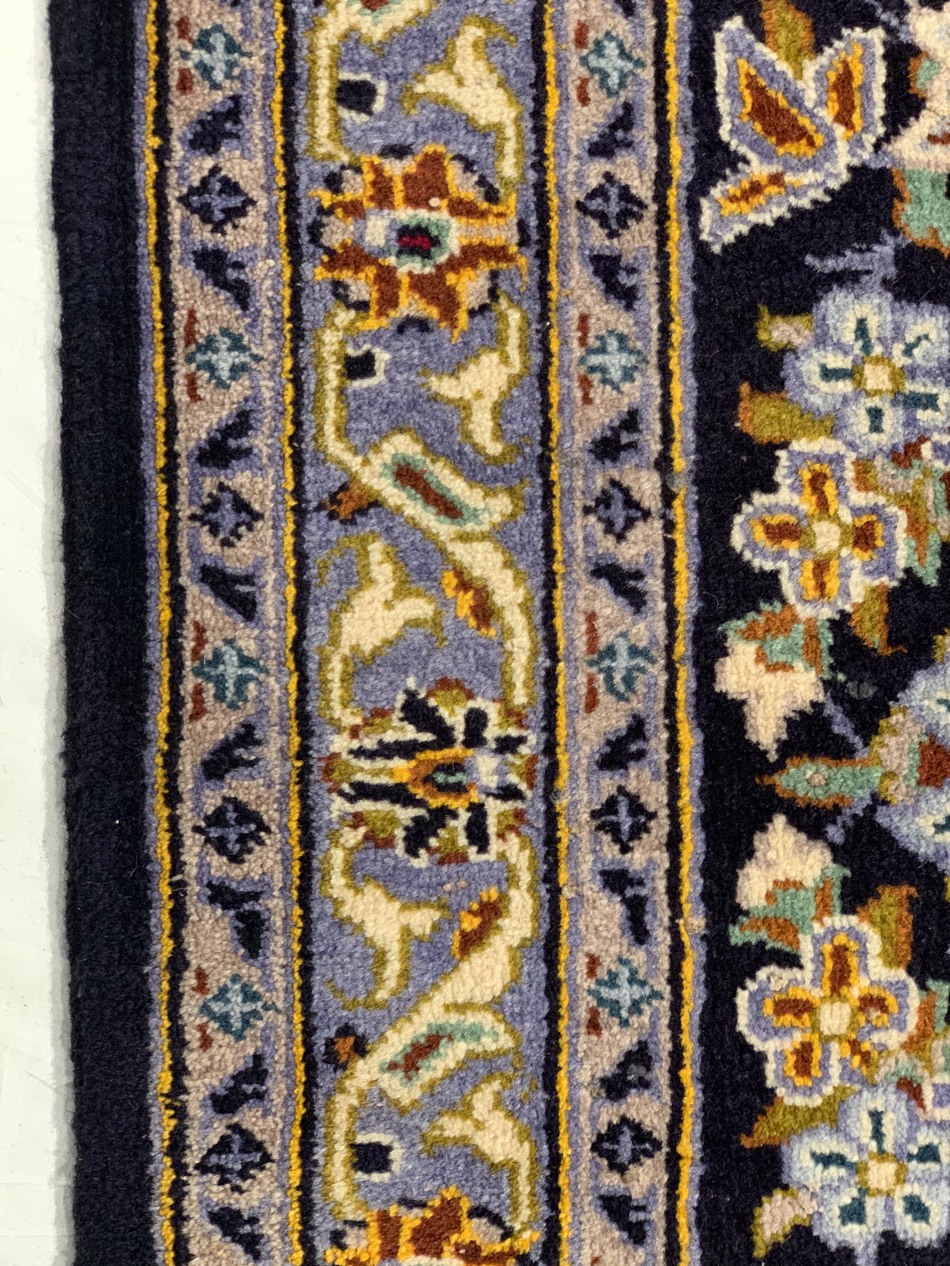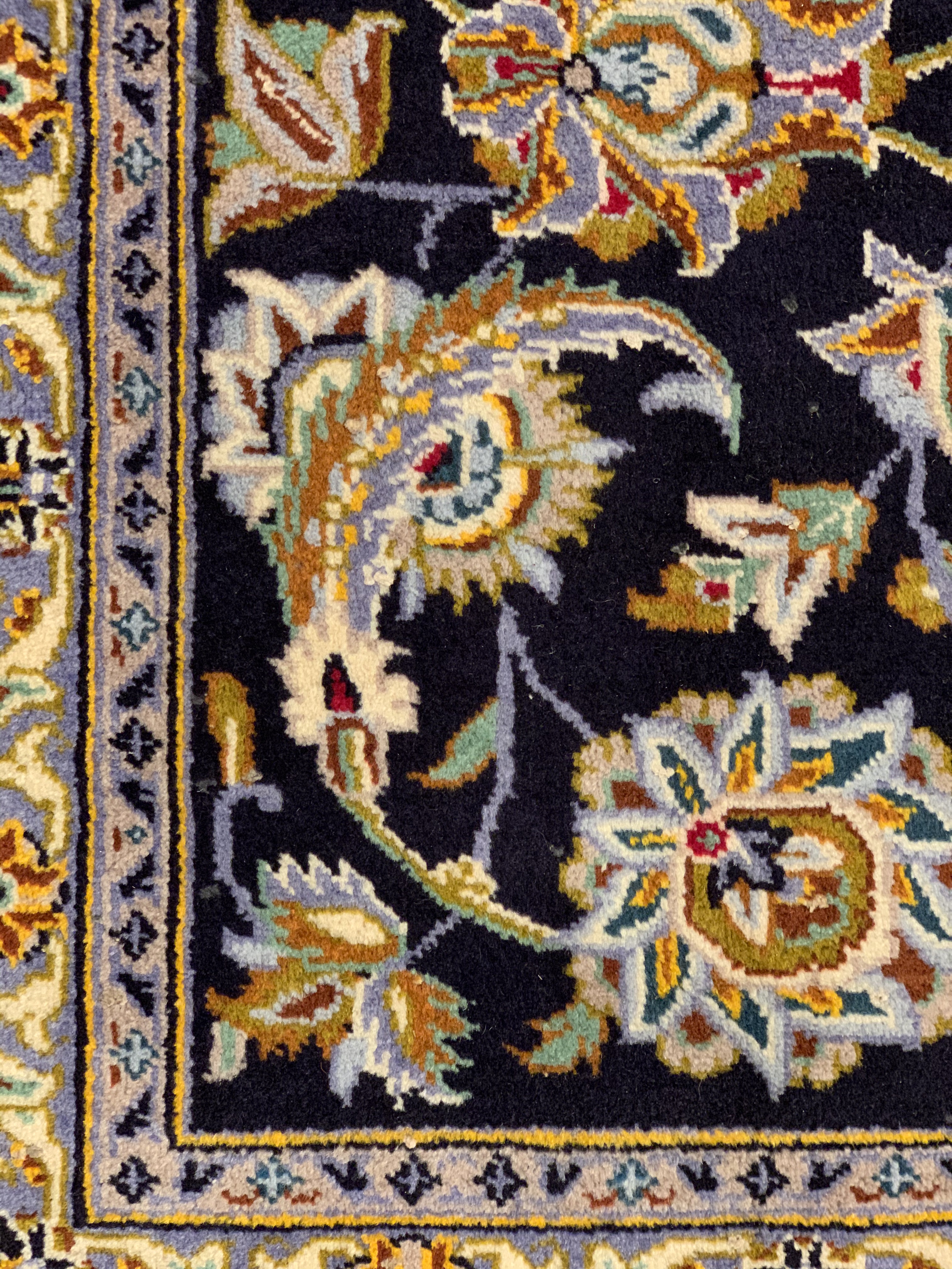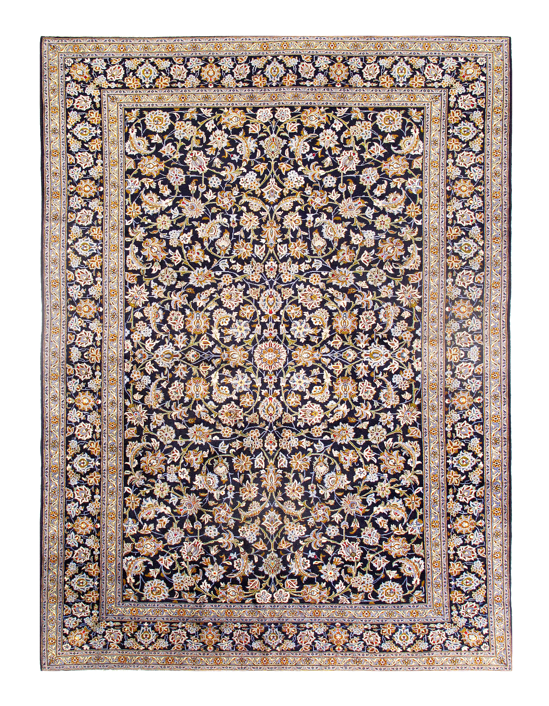 This magnificent antique Persian Kashan has a striking allover design of spiraled vinescrolls. The patterning is cleverly arranged so that the vines seem to suggest a latent circular or crown-shaped medallions. A palmette vinescroll makes up the main border, set against a red ground that contrasts with the deep navy ground of the field, reinforcing a framing of effect for the entire composition. The saturated brilliance of the color is matched by the lustrous velvety quality of the wool pile in the classic Kashan tradition.