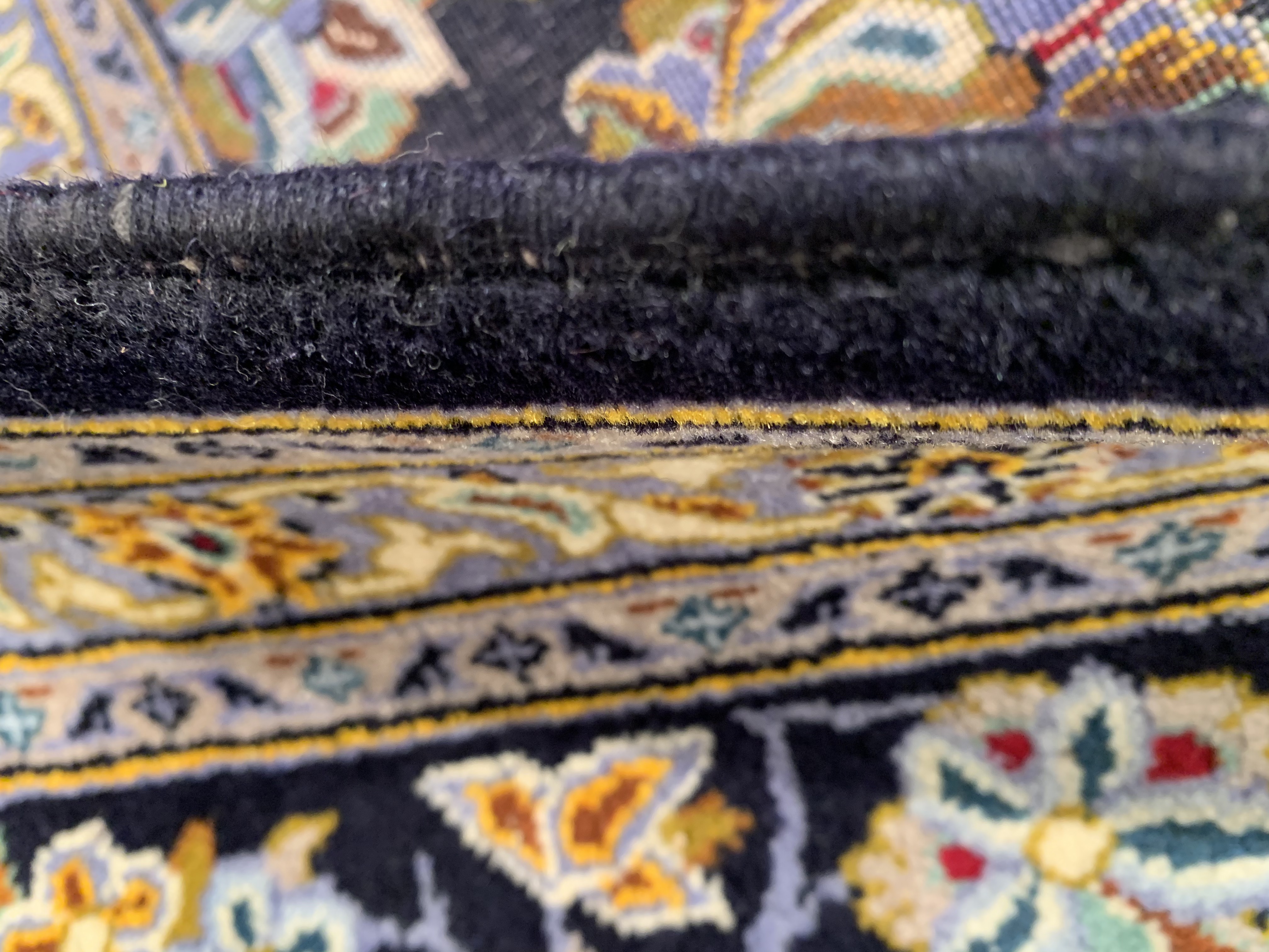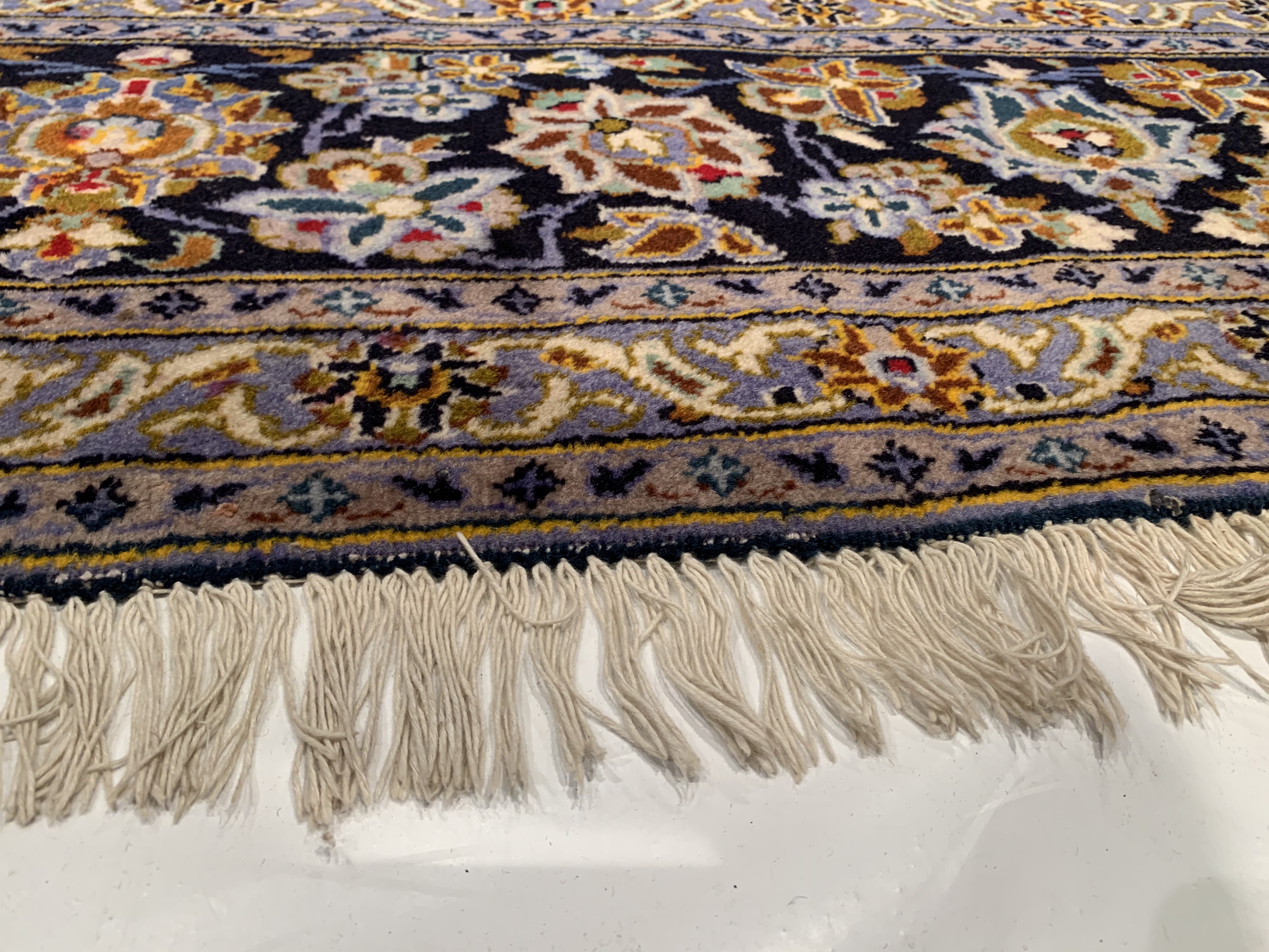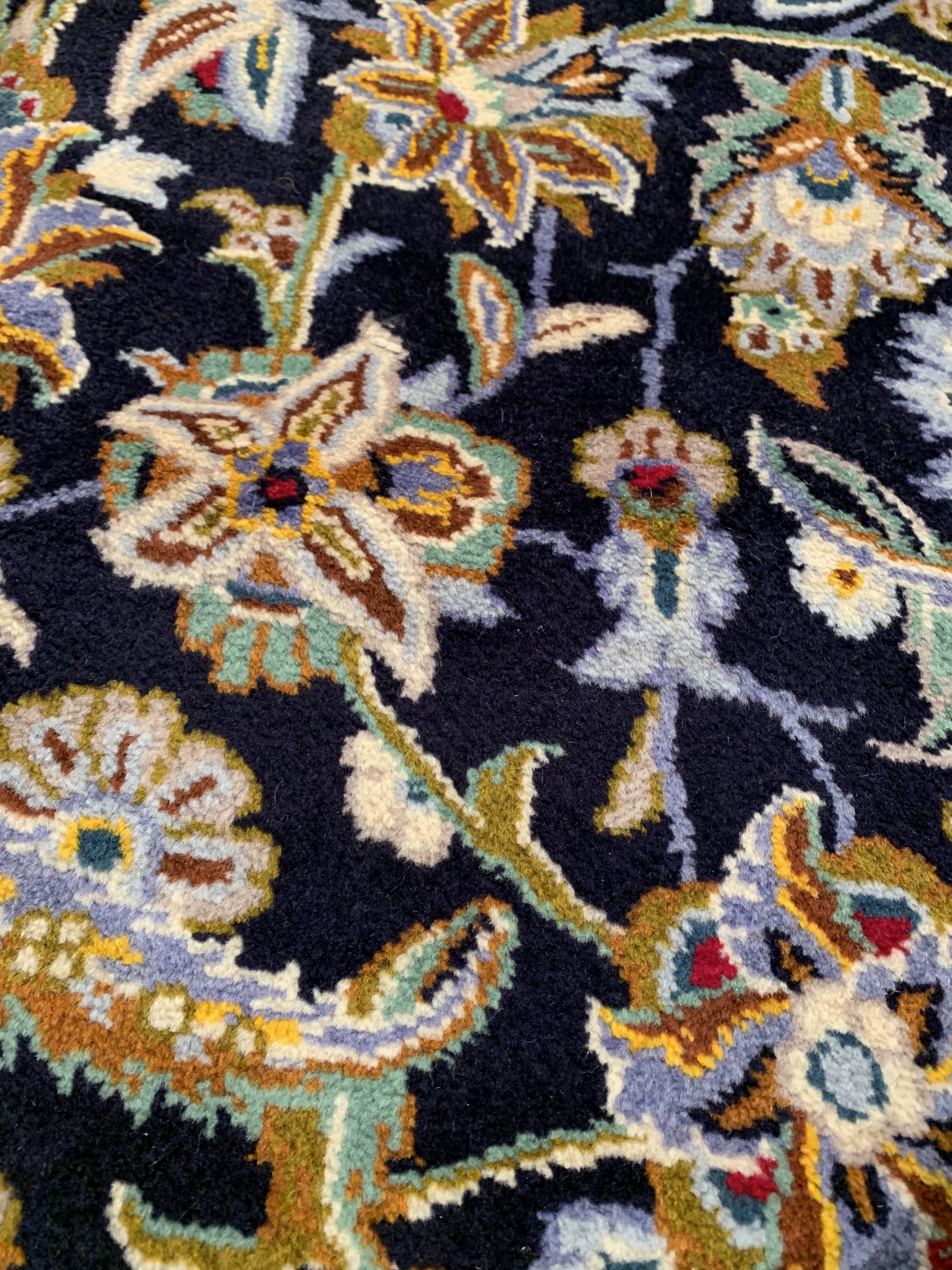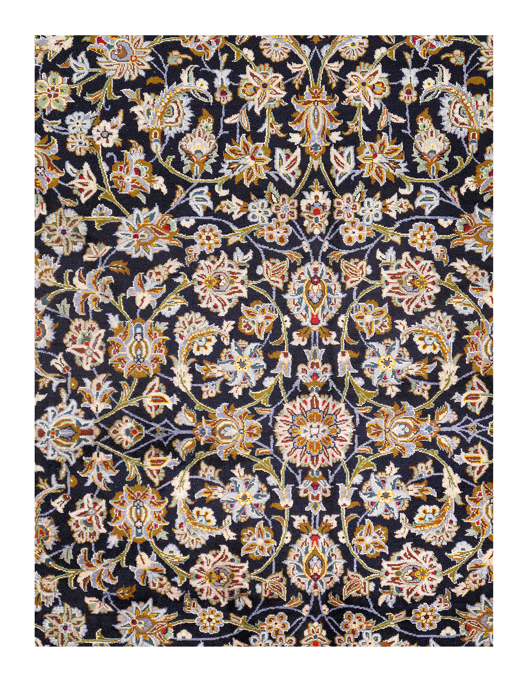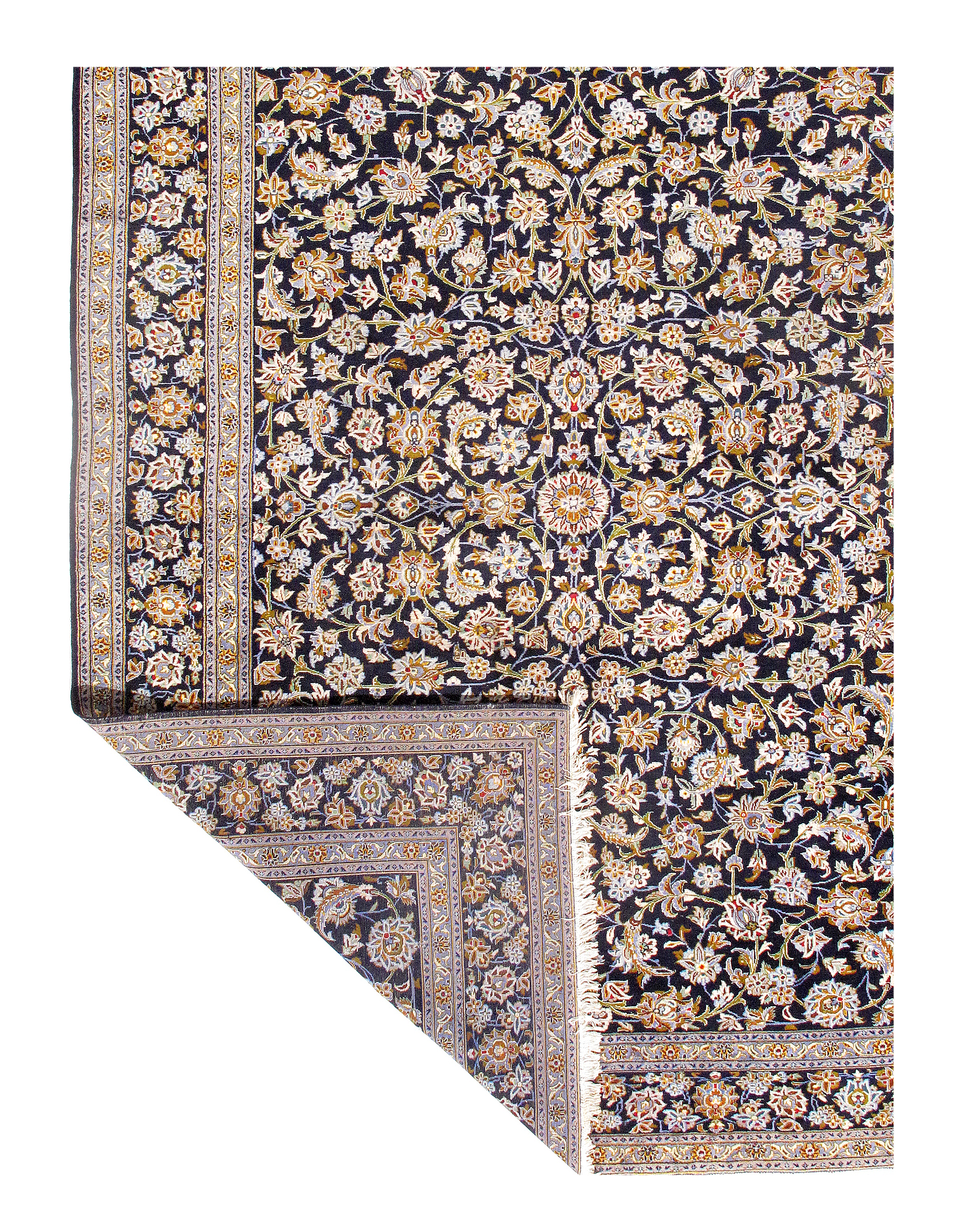 This magnificent antique Persian Kashan has a striking allover design of spiraled vinescrolls. The patterning is cleverly arranged so that the vines seem to suggest a latent circular or crown-shaped medallions. A palmette vinescroll makes up the main border, set against a red ground that contrasts with the deep navy ground of the field, reinforcing a framing of effect for the entire composition. The saturated brilliance of the color is matched by the lustrous velvety quality of the wool pile in the classic Kashan tradition.