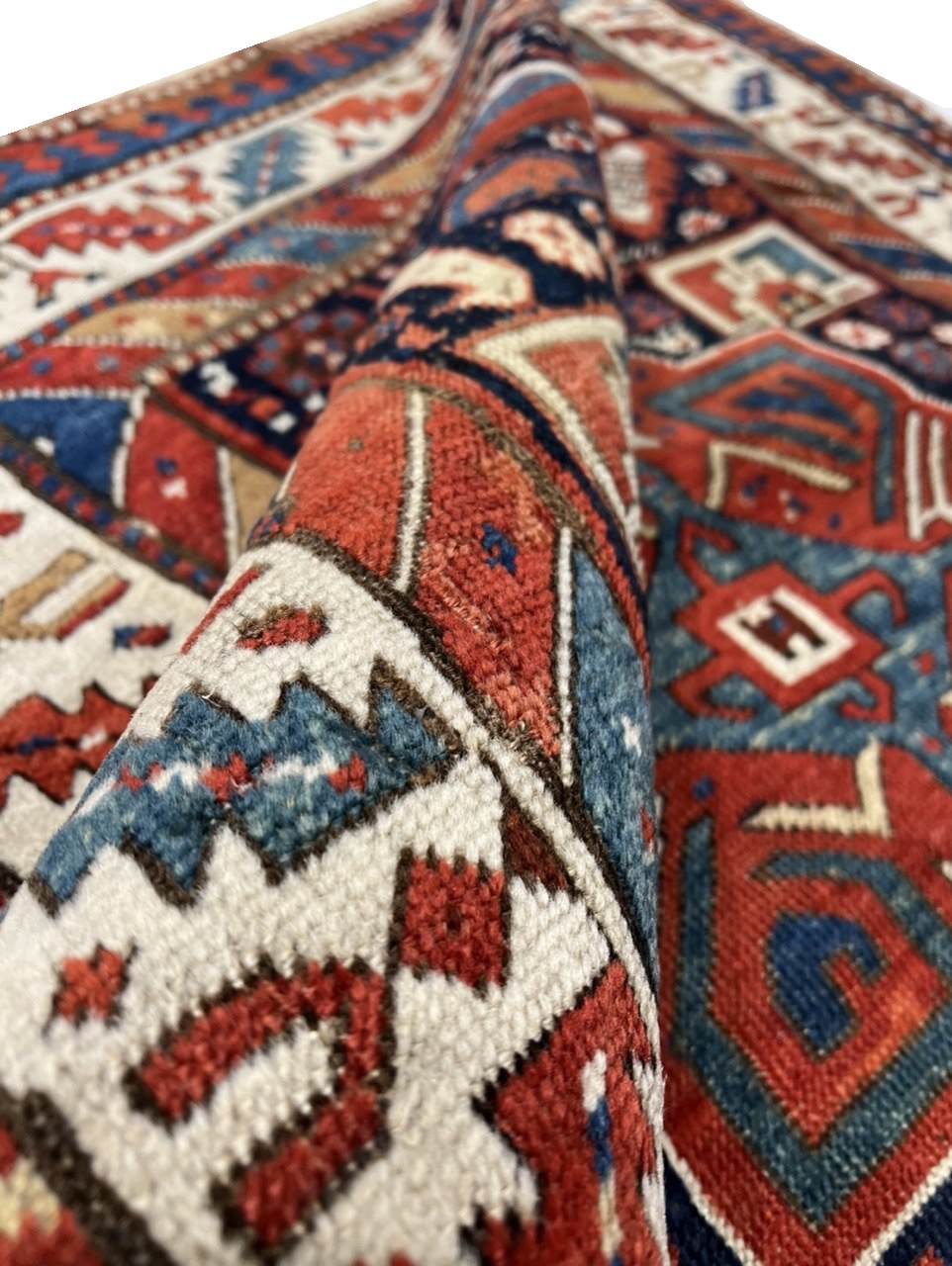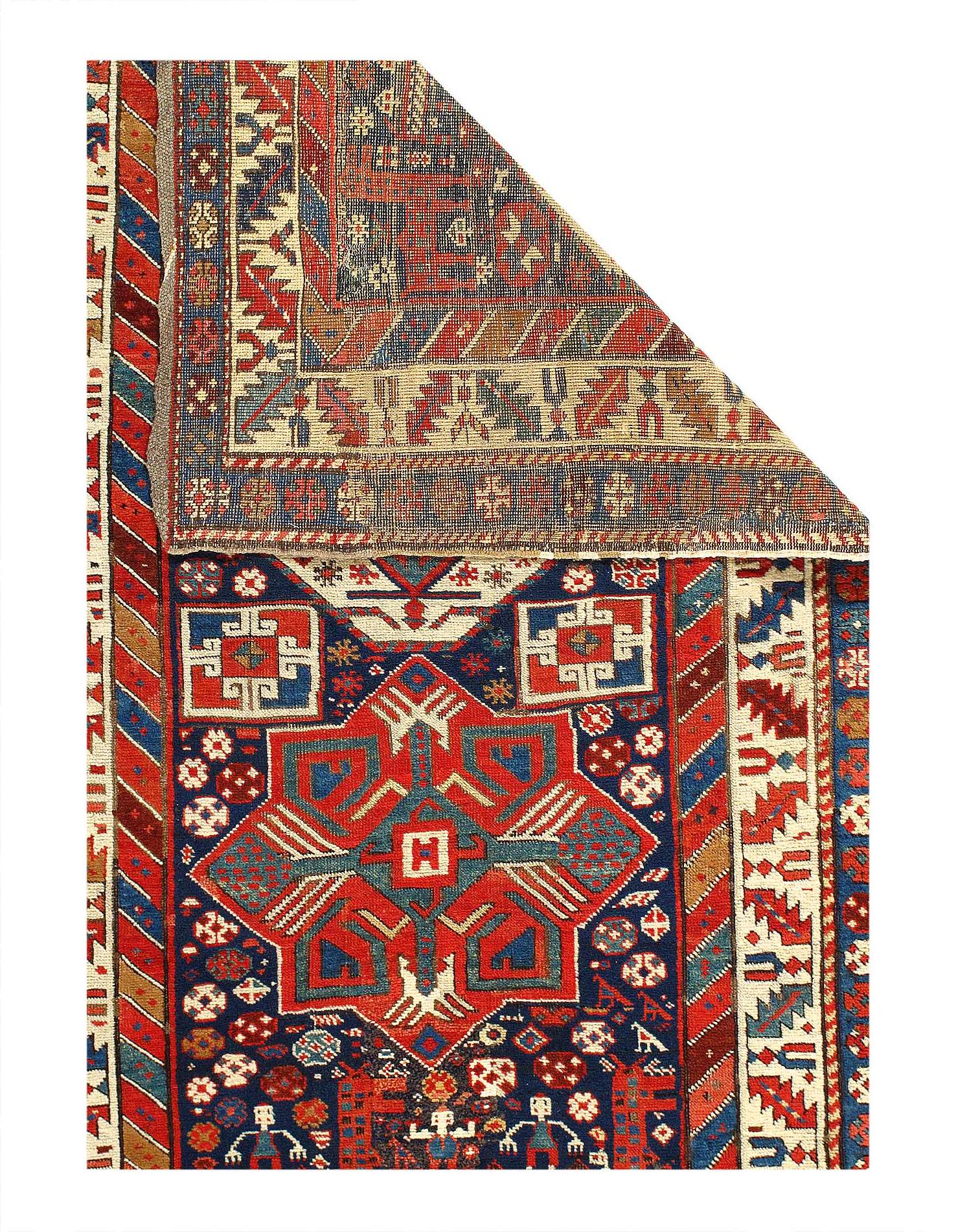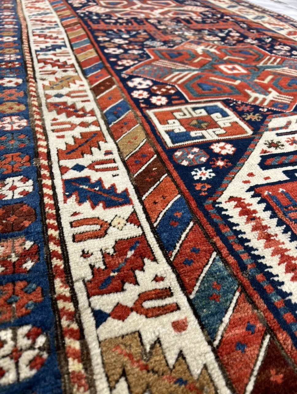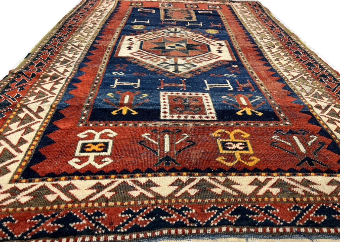 Kazak is old Caucasian rugs which strictly adheres to traditional design elements of the Caucasus. It has elements such as the stepped hooked polygons, geometrical medallions and rosettes, presented in more stylized manner and with a new dimension. Natural dyes produce soft luminous shades and abrashes causing a beautiful sheen. Hand spun wool yarn is normally used in the variety of vibrant warm colors.
