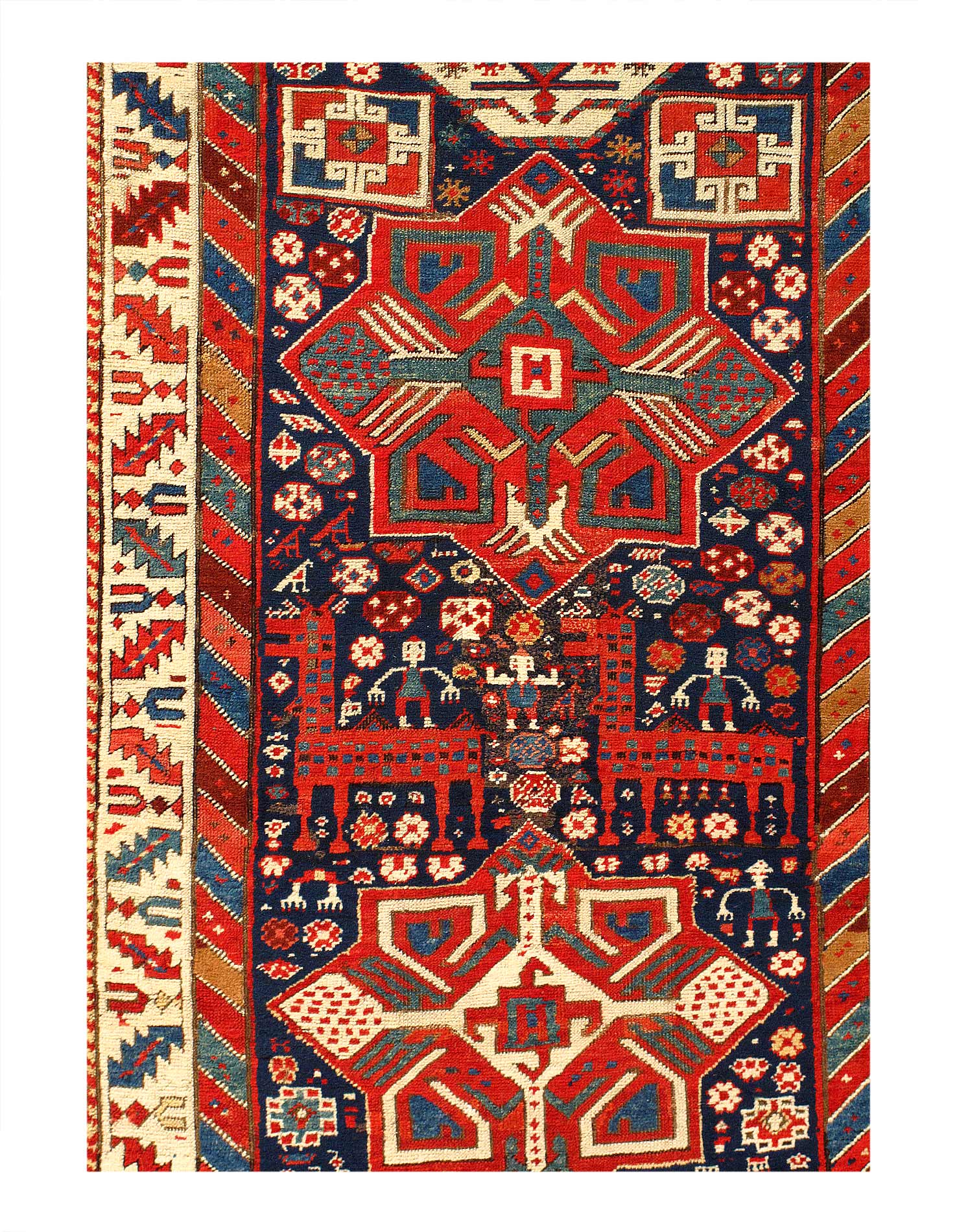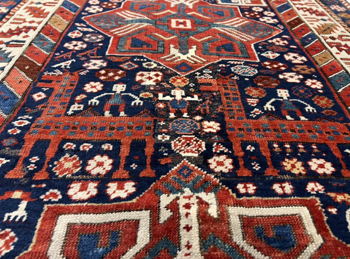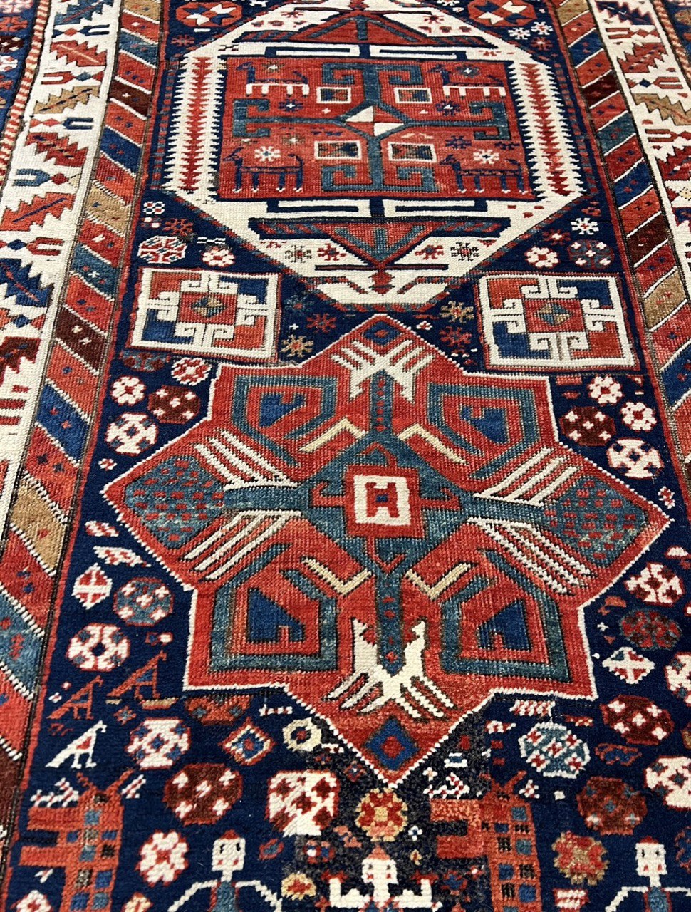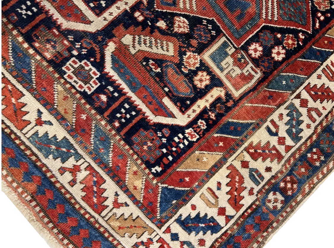 Kazak is old Caucasian rugs which strictly adheres to traditional design elements of the Caucasus. It has elements such as the stepped hooked polygons, geometrical medallions and rosettes, presented in more stylized manner and with a new dimension. Natural dyes produce soft luminous shades and abrashes causing a beautiful sheen. Hand spun wool yarn is normally used in the variety of vibrant warm colors.
