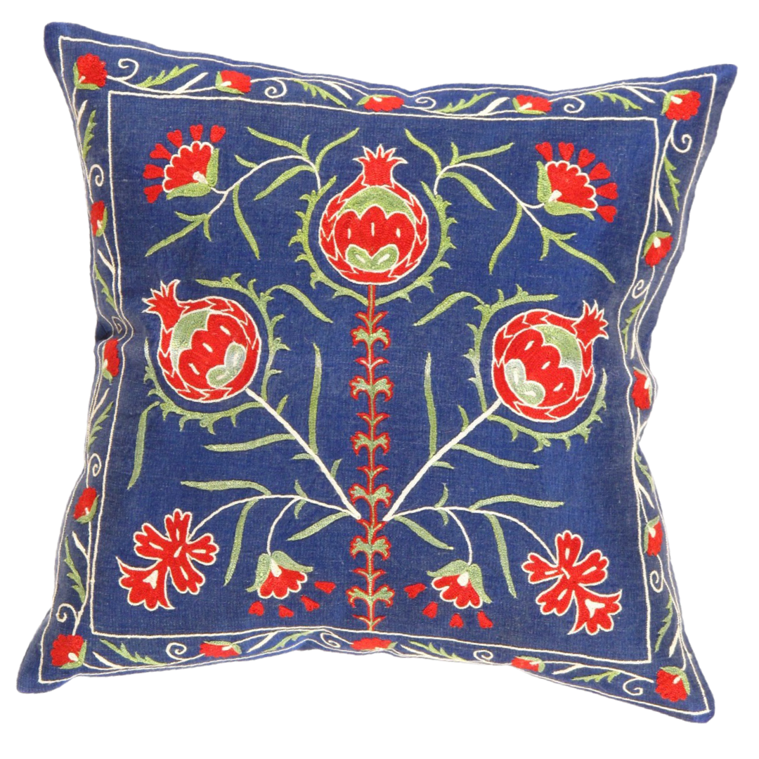 ● True to the “needle” origin of the Persian word suzani, these pillows are embroidered with traditional floral motifs in richly coloured patterns that define this historic style.