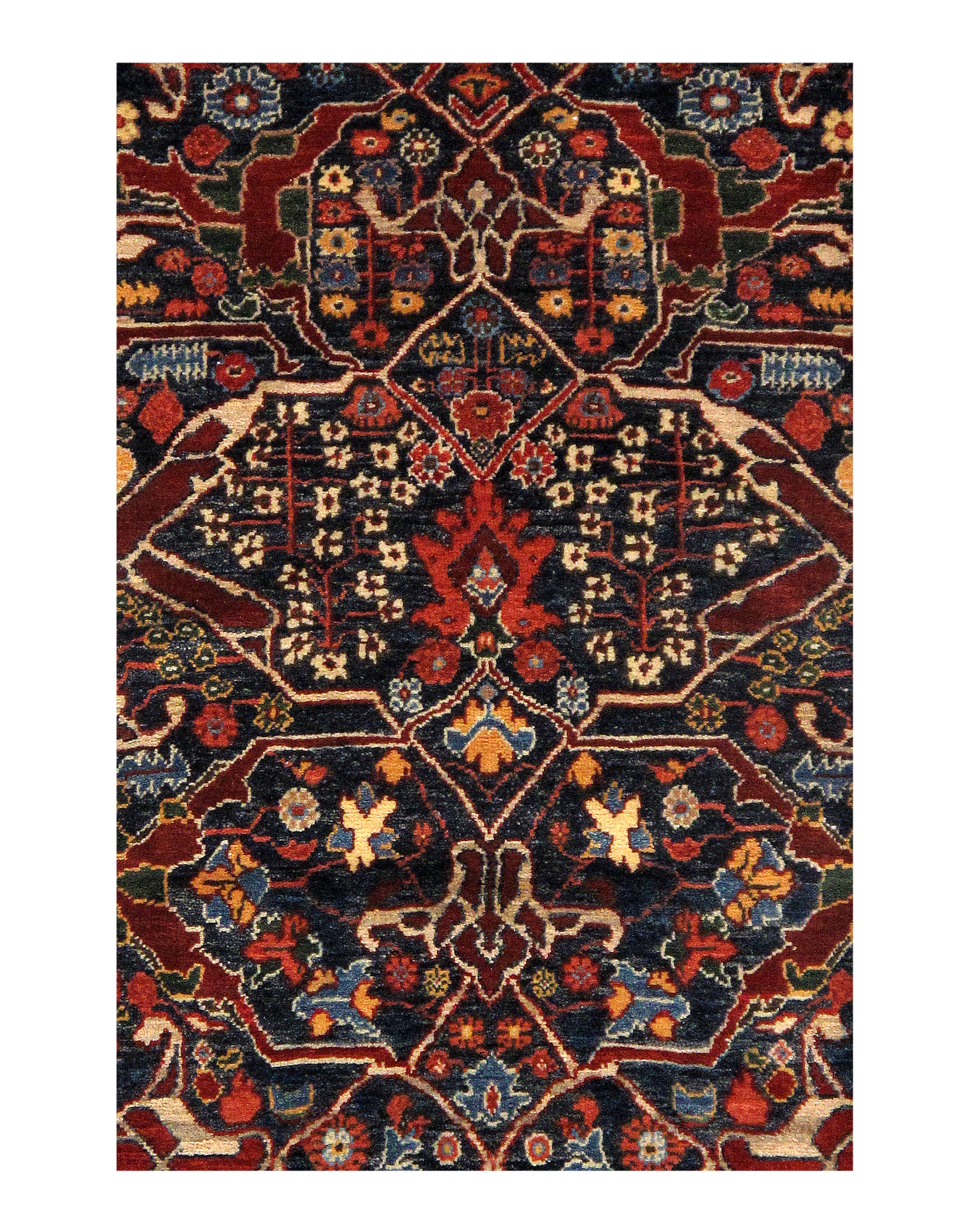 Bidjar is a town in Persian Kurdistan located in north-west Persia. The Bidjar name is also used to describe the antique rugs that were produced in the many villages in the surrounding vicinity. The Bidjar is noted as being the stiffest carpet made; they are very heavy in relation to their size, and very thick and durable. All of the knots are symmetrical and the rows are beaten down during the weaving process producing a dense compact fabric. Given their thickness and construction Bidjar rugs can be difficult to fold. The many designs depict the Kurdish influence of the area and often floral and classical geometric motifs are employed as well as the use of large, whimsical medallion designs. The color palate is rich and jewel toned making the Bidjar a highly desirable rug sought after by designers.