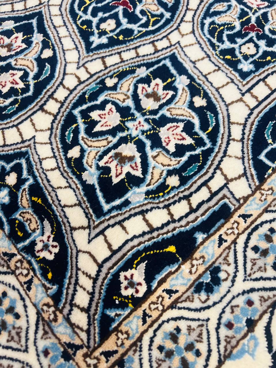 Persian Nain rugs are renowned for their detail and fine use of outlining along the central motifs. Breaking from the classical style of many vintage rugs produced around central Iran, Persian Nain rugs became renowned for their modern appeal and personal style, establishing the classical motifs of many other regional rugs, only through a more precise lens. In this striking piece, the precision is particularly visible along the heart of the vintage Persian rug, where the attention to detail allows each individual color to stand out as a unique part of the whole. The surrounding borders help ground the masterpiece and add horizontal intrigue to the natural elements within, which are arranged vertically to establish a cascading effect.