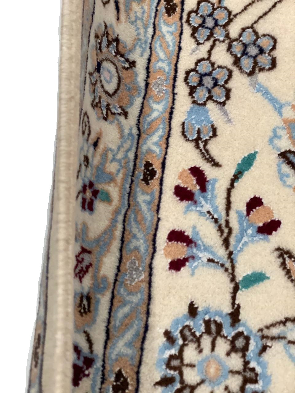 Persian Nain rugs are renowned for their detail and fine use of outlining along the central motifs. Breaking from the classical style of many vintage rugs produced around central Iran, Persian Nain rugs became renowned for their modern appeal and personal style, establishing the classical motifs of many other regional rugs, only through a more precise lens. In this striking piece, the precision is particularly visible along the heart of the vintage Persian rug, where the attention to detail allows each individual color to stand out as a unique part of the whole. The surrounding borders help ground the masterpiece and add horizontal intrigue to the natural elements within, which are arranged vertically to establish a cascading effect.