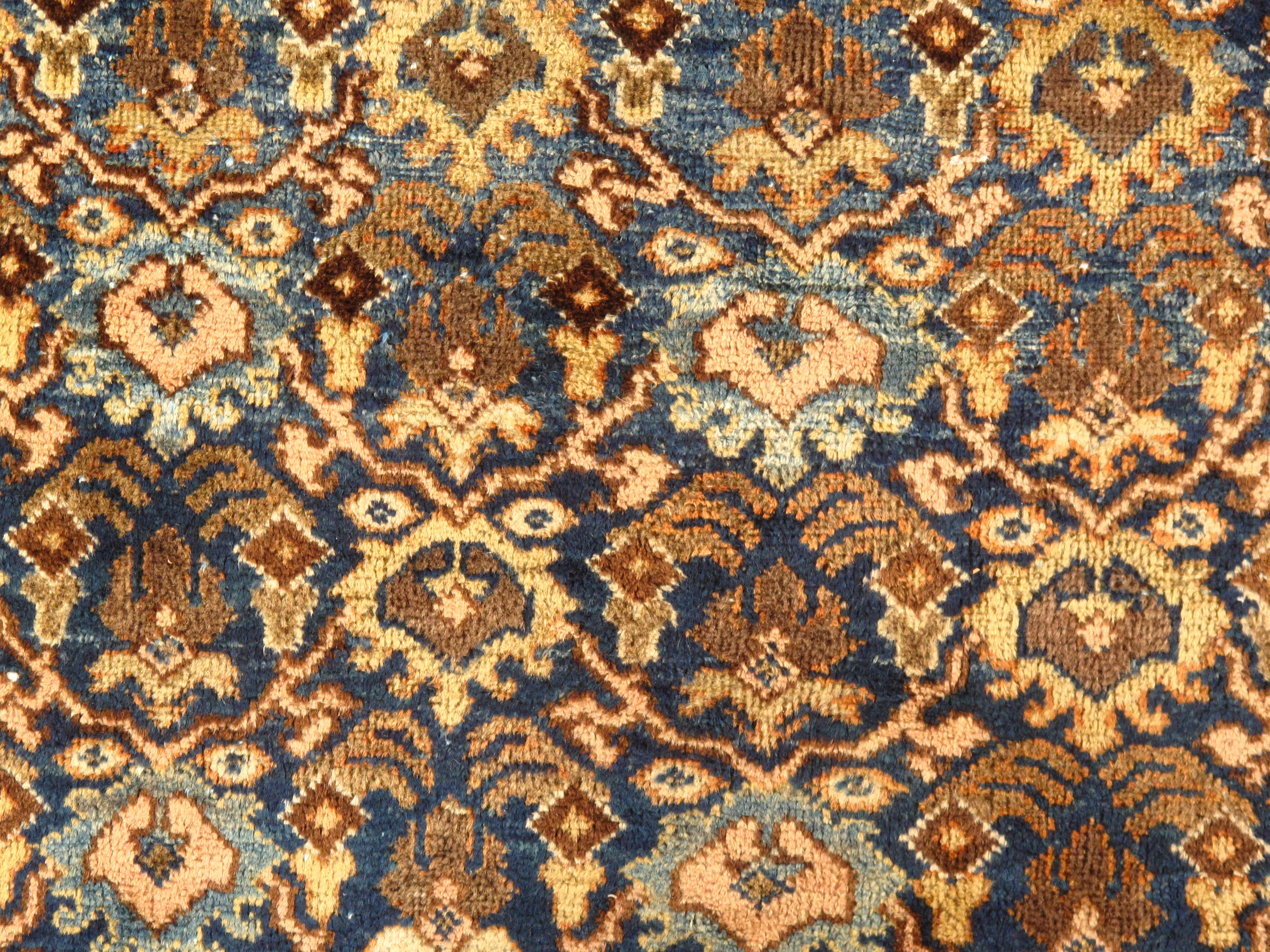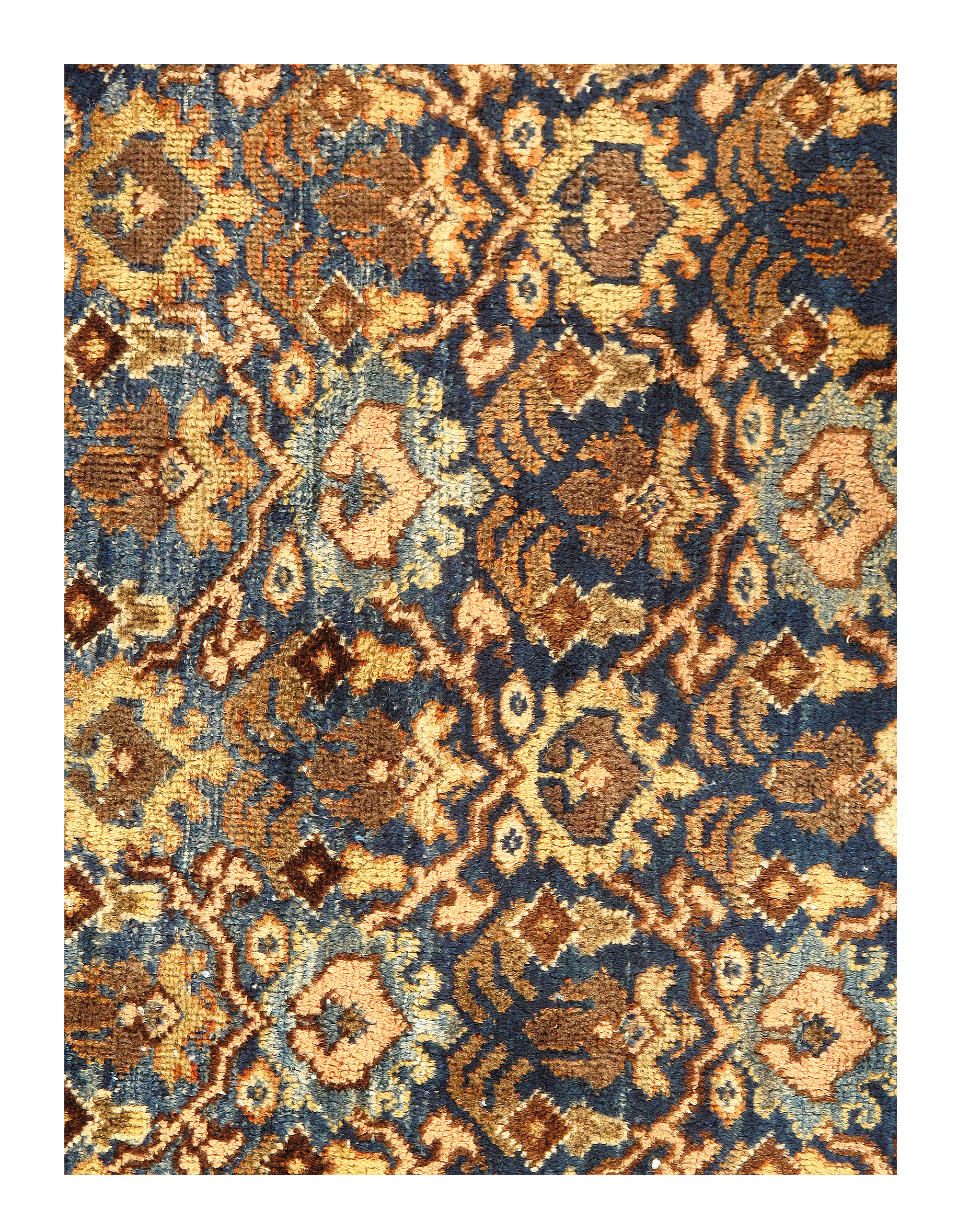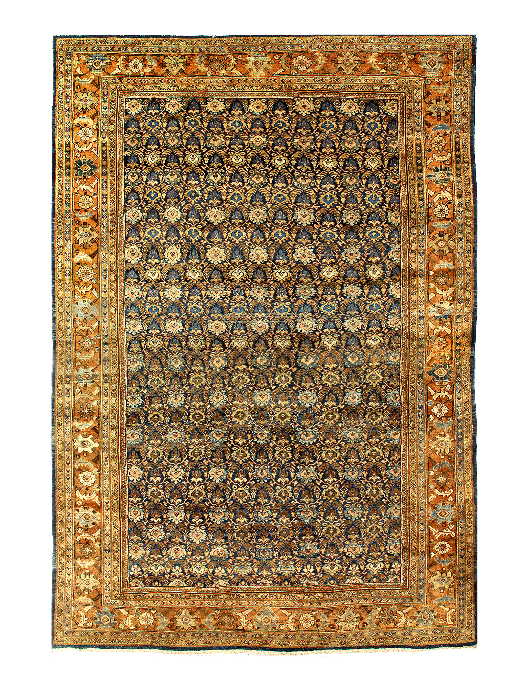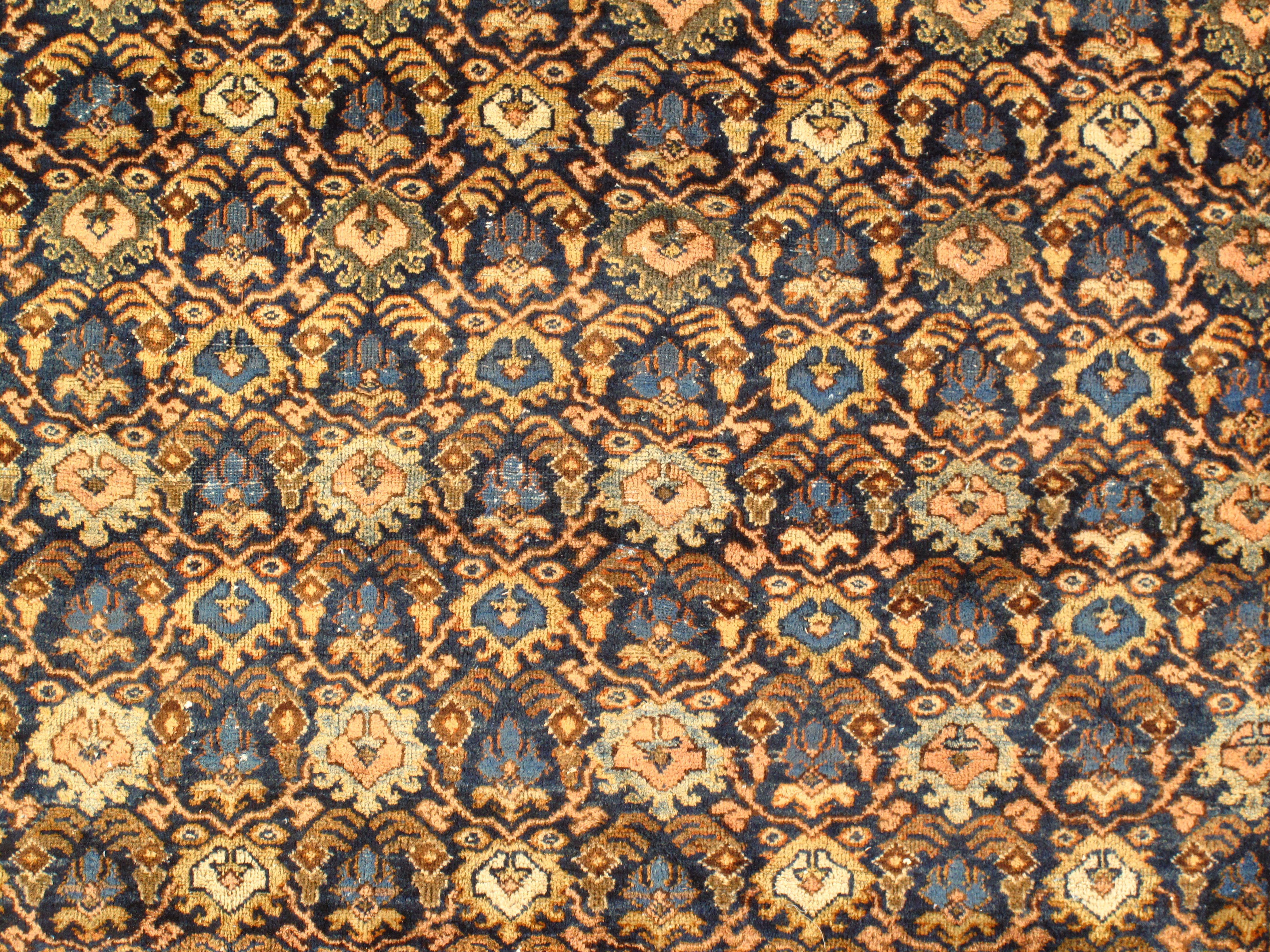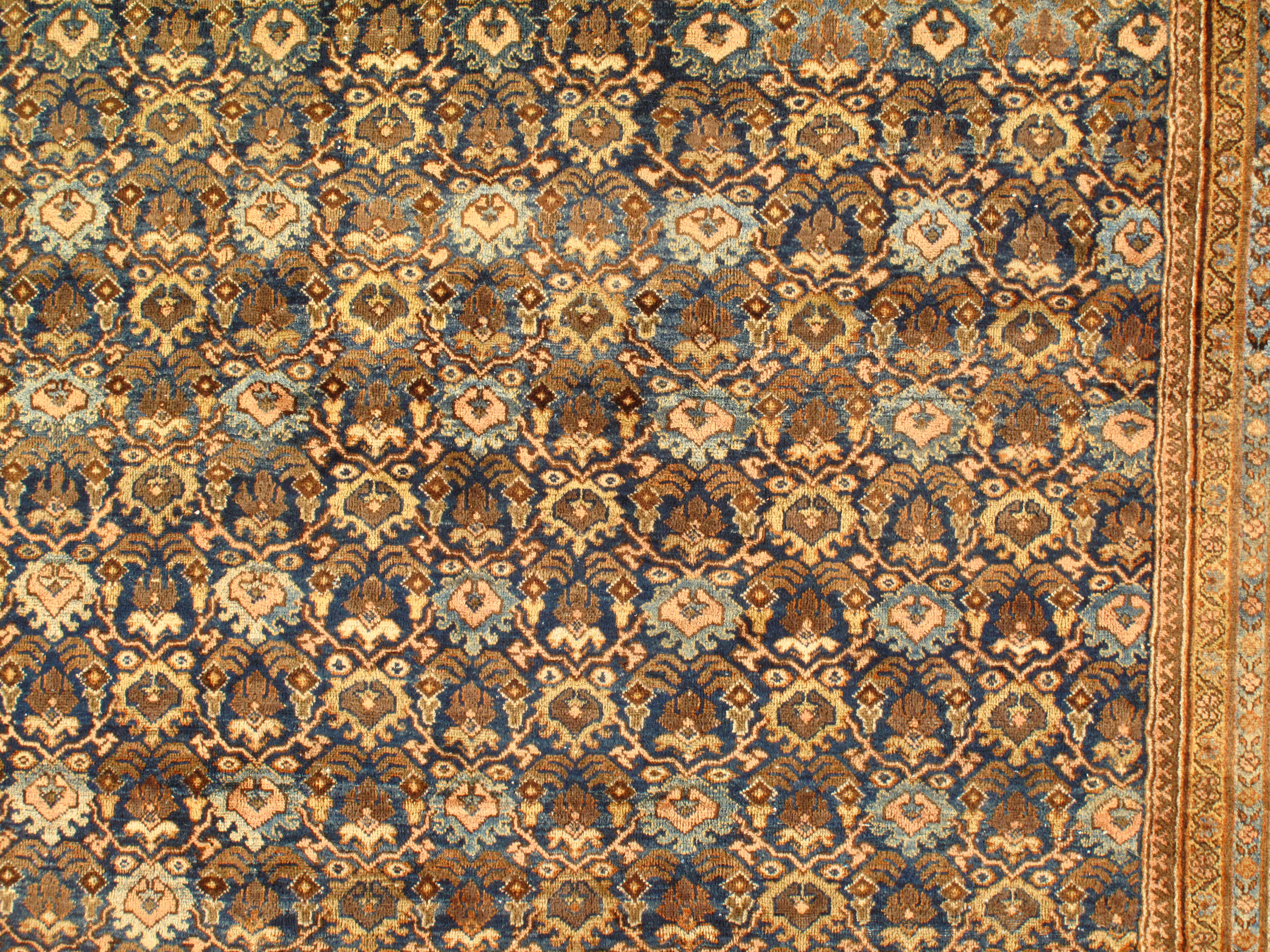 Often the finest in the antique Mahal style of antique rugs render spacious, very unique variations upon classical Persian allover antique carpet patterns, such as the Herati (repeated diamond and curling leaf), the Mina Khani (repeated circular flowerhead) and Harshang (highly stylized dragon and blossom), often in subtle, glowing pastels and earth tones. Many Mahals utilize these allover motifs, while others present the central medallion format, seen often in other Persian carpet styles.