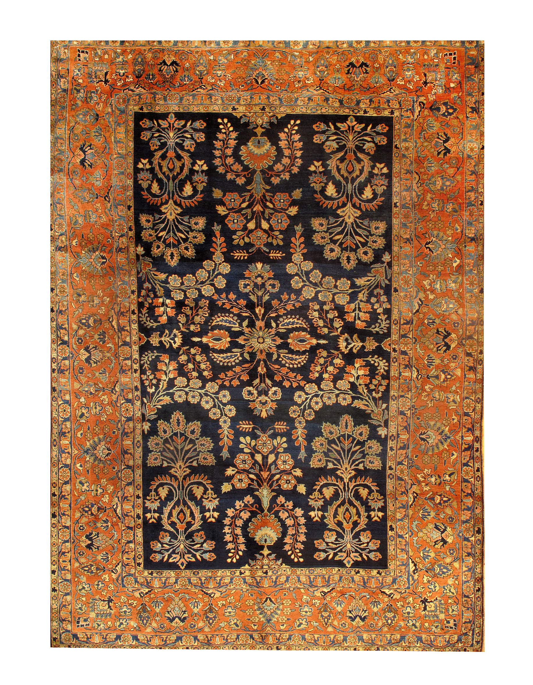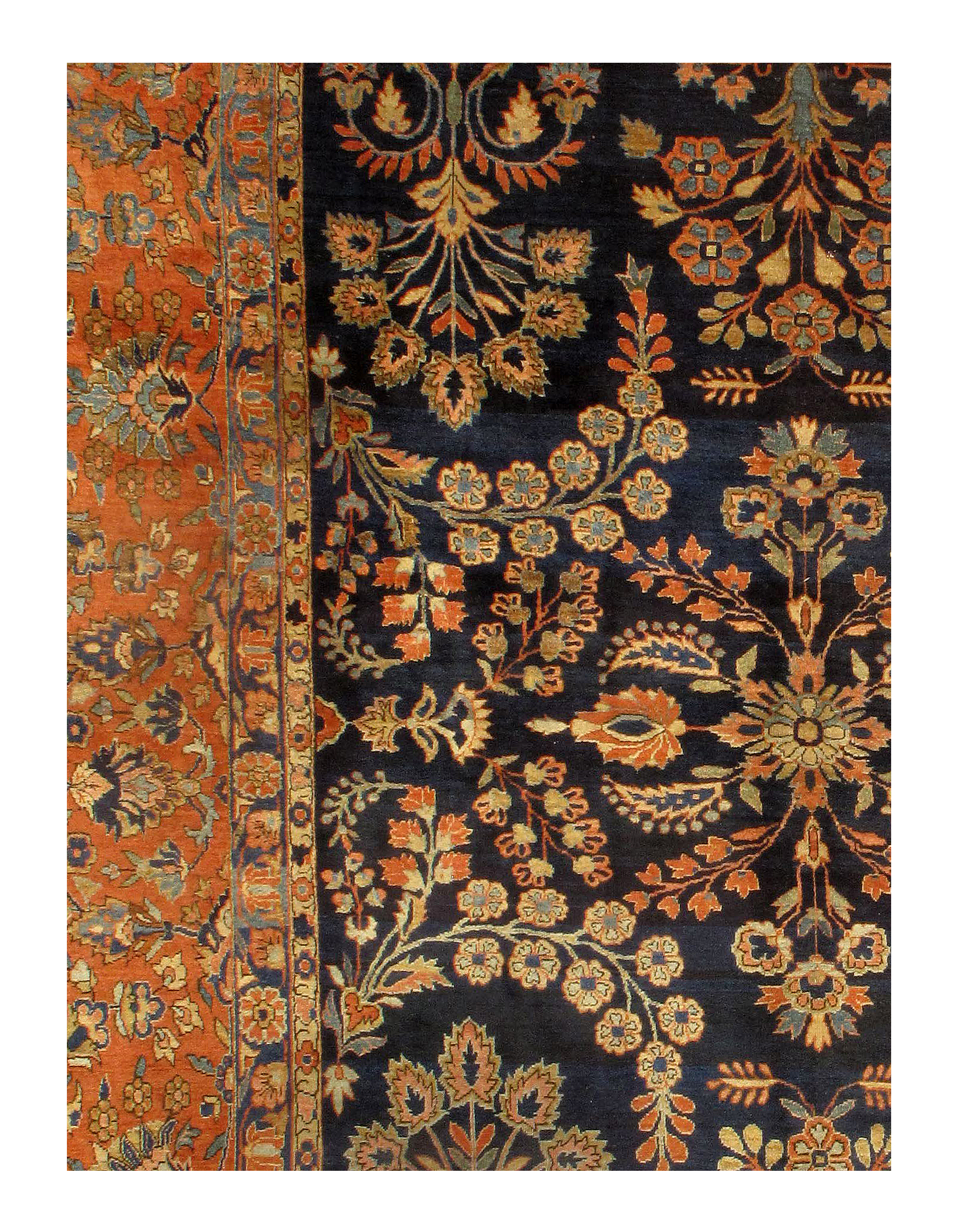 Beautiful Large Size Antique Persian Sarouk Mohajeran Rug, Antique Persian Mohajerans like this are distinguished from other antique Persian Sarouk rugs by their more monumental scale, and their richer, more dramatic coloration. This impressive antique Persian rug features a central rosette spews forth grand design of swaying vines brimming with leaves and flowers in shades of red and gold against a blue back field. The scale of the border is much smaller, underscoring the grandeur of the field, while also using a terracotta ground to achieve a framing color contrast. The lustrous, almost silken pile emphasizes the golden, jewel-like coloration of the antique rug as a whole.