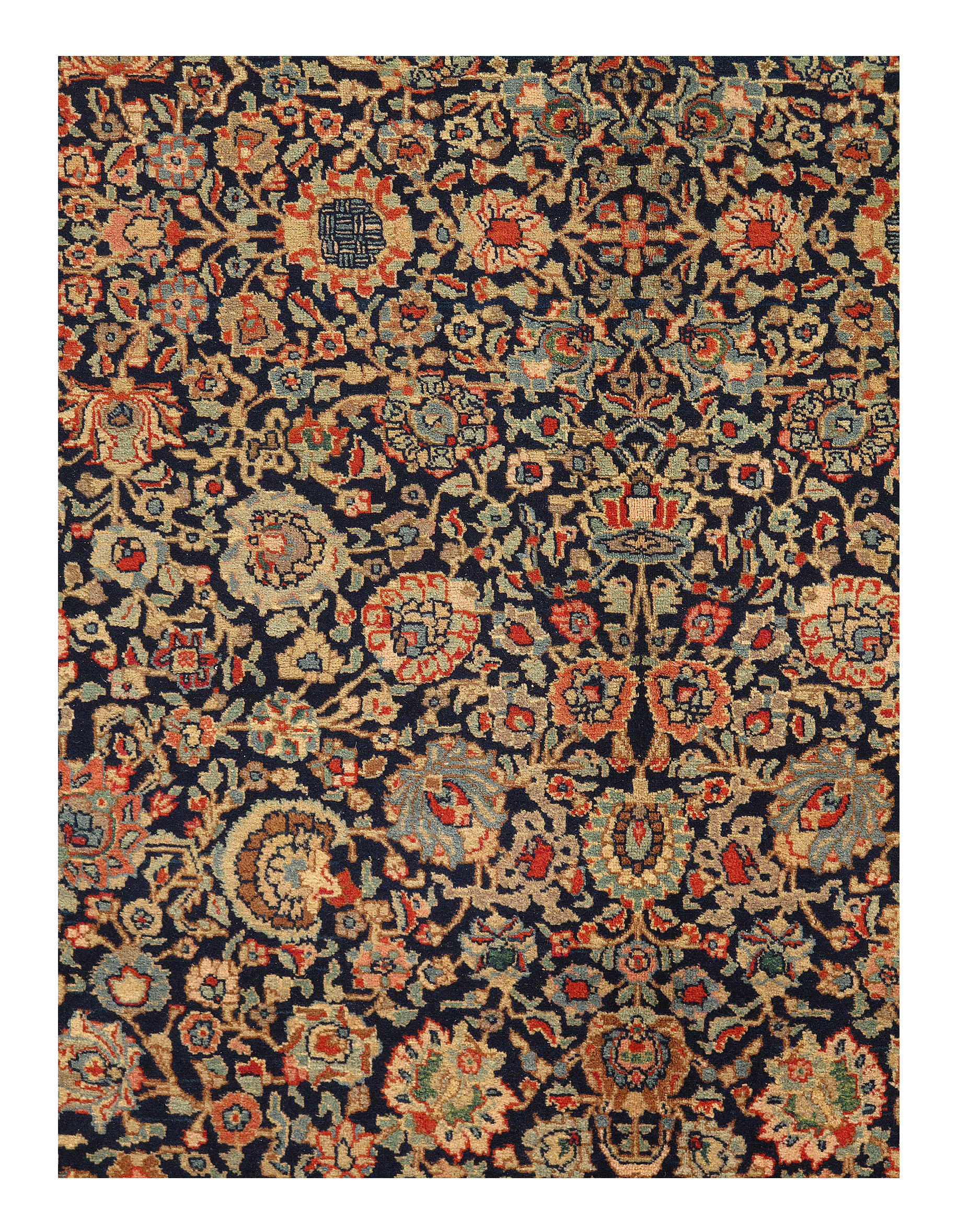 The sumptuous midnight blue background highlights the exquisite trellis vase design of this spectacular late 19th century antique Persian Tabriz rug. This antique Persian rug was produced during the Persian Qajar Dynasty that ruled the modern day country Iran from the late 18th century to the early 20th century. It was known as Sublime State of Persia and was time of wealth and grandeur, as is reflected by this fine piece of artwork from the time period.