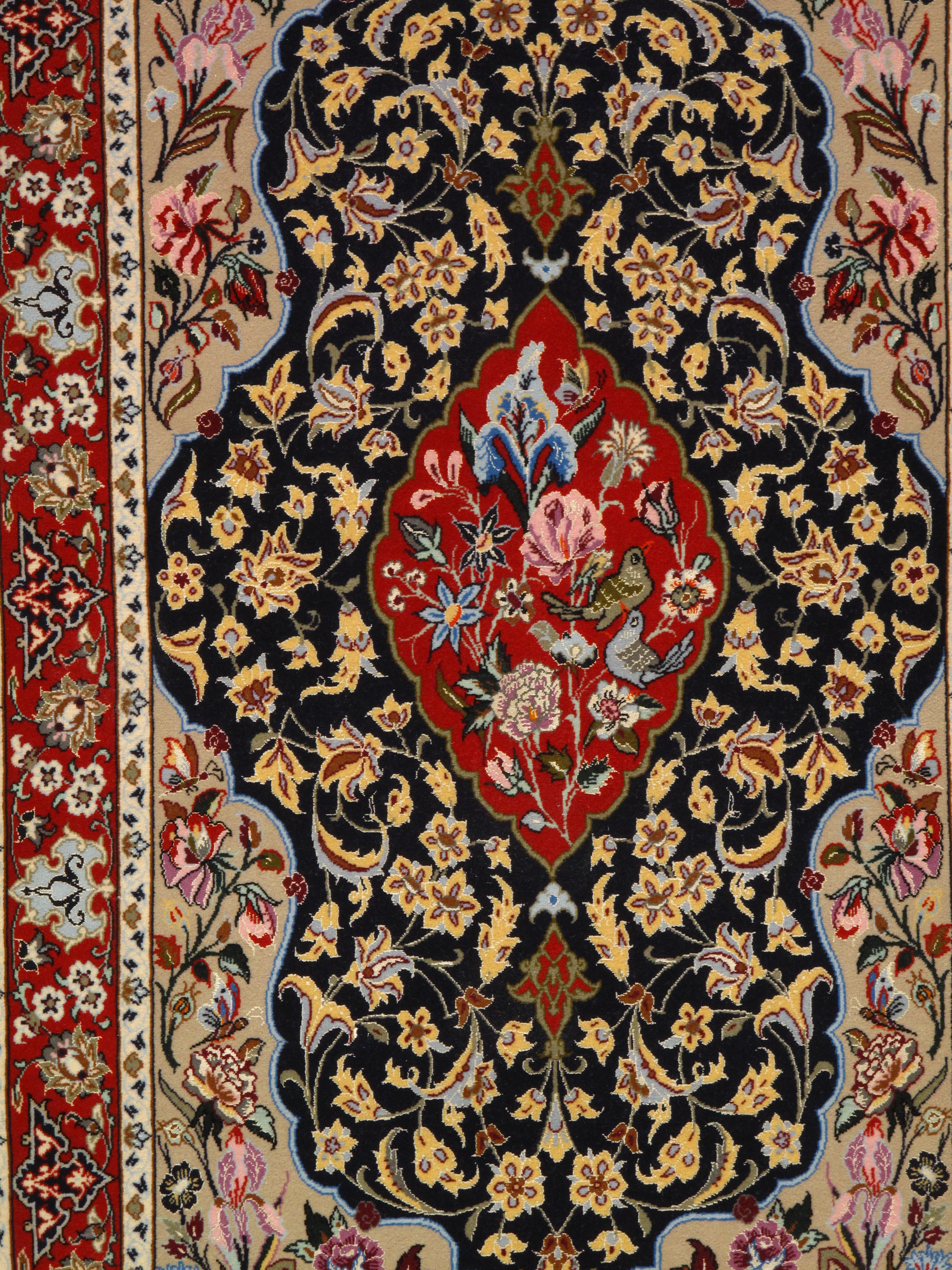 The Isfahan rugs are made with exceptionally good quality of wool & silk. They use traditional motifs inspired by architectural tiles that once decorated the historical buildings from which these rugs originated in. When it comes to high class designs the composition, patterns, and materials of Isfahan meets those expectations. The motifs usually consist of medallions with palmetts and also figural motifs. Isfahan rugs have an extremely high knot density and are woven with silk and golden threads, which give them their luxurious look.