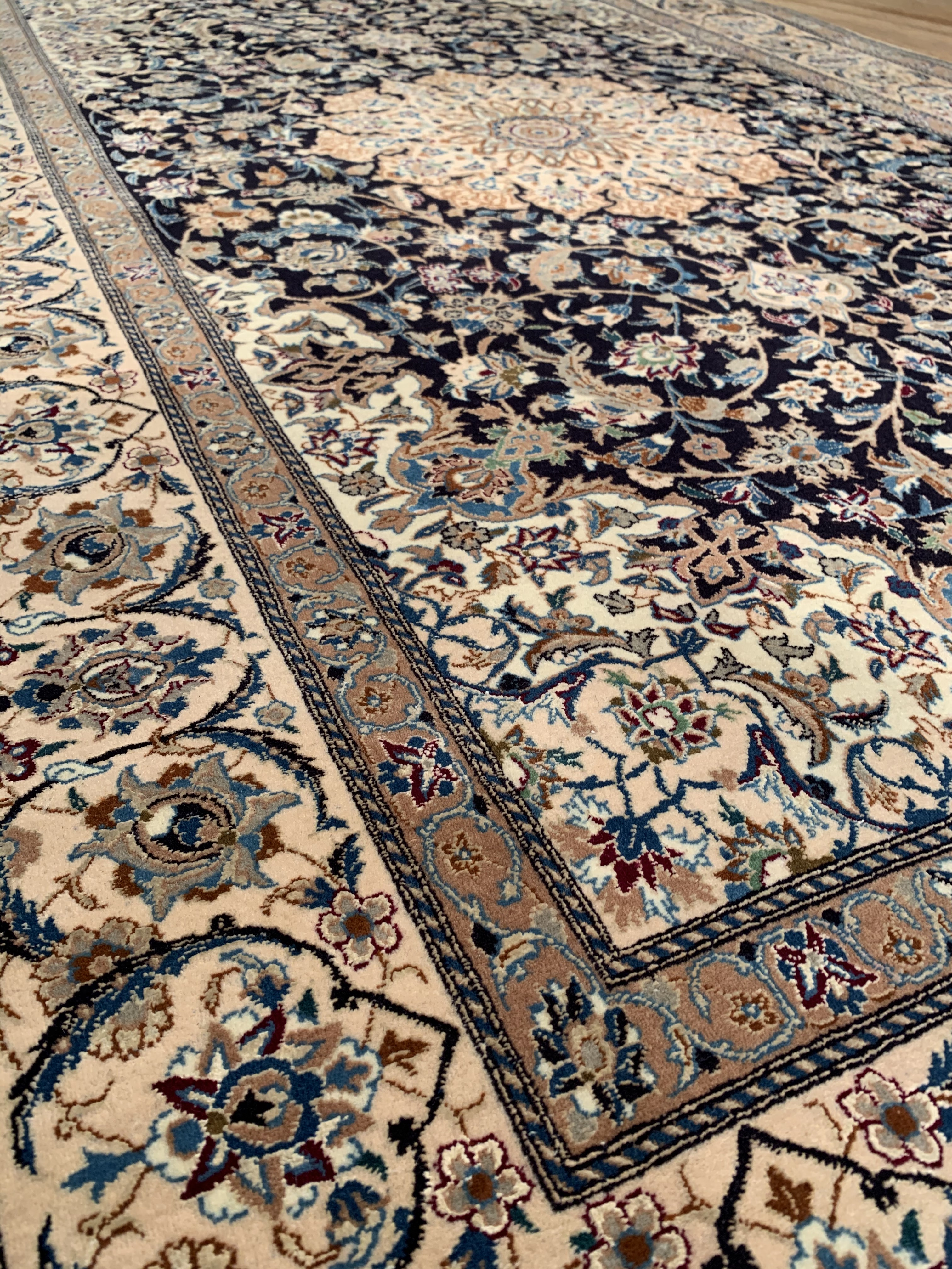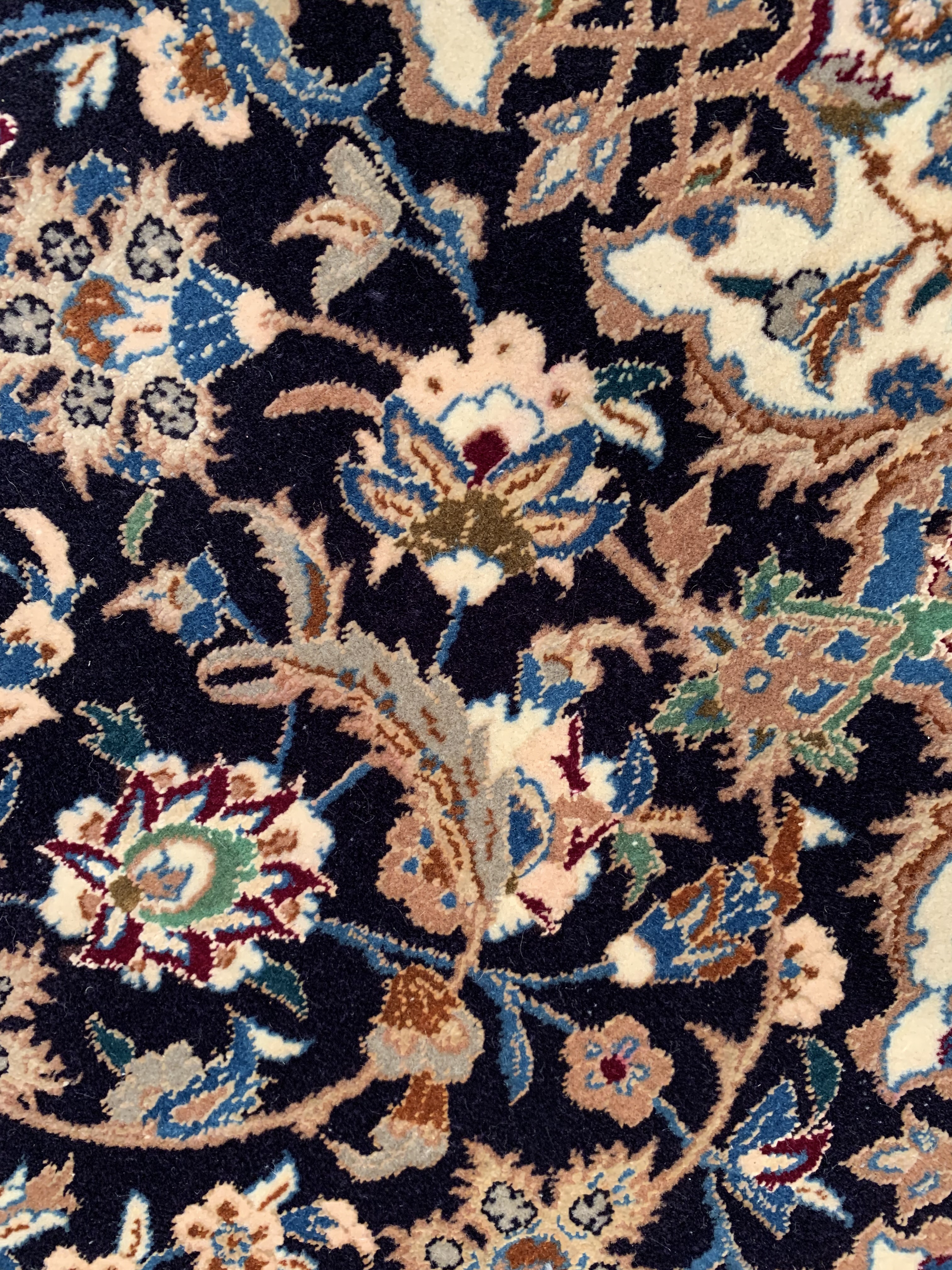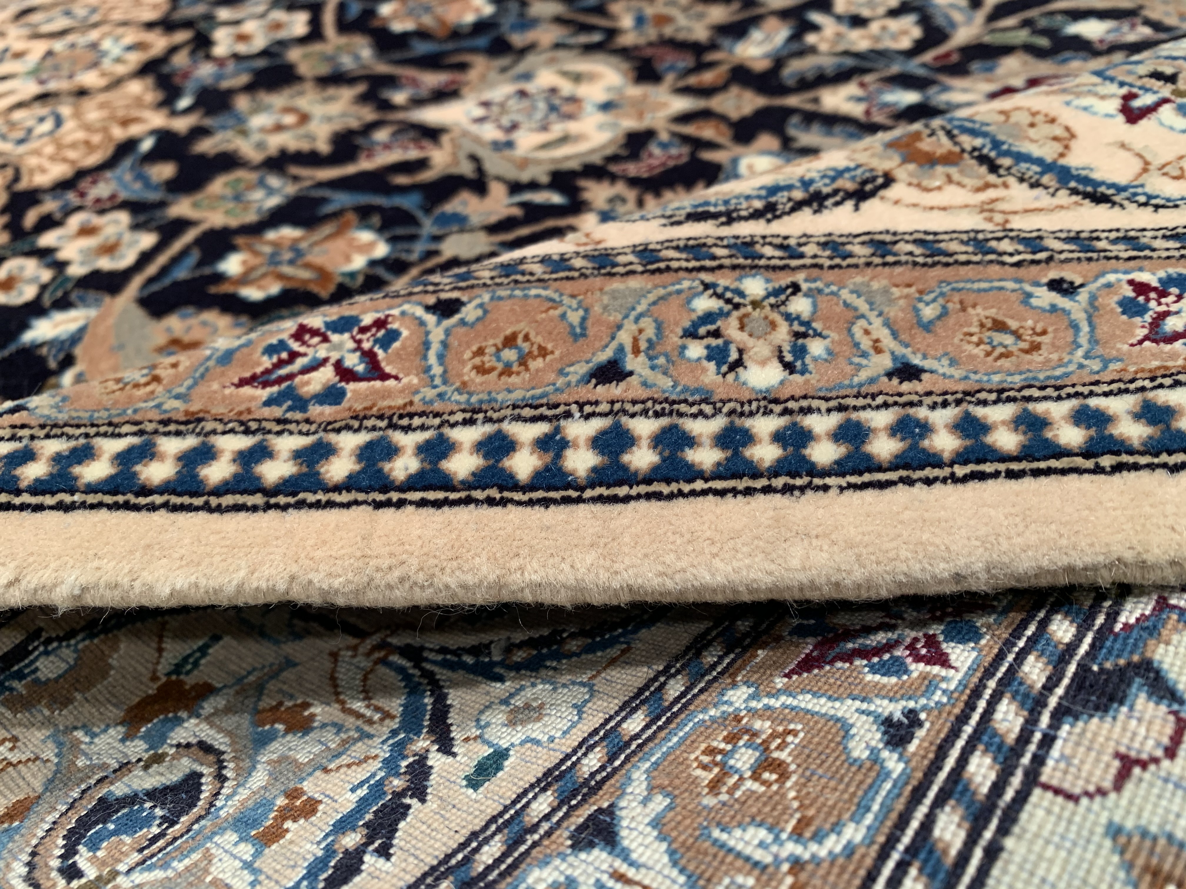 Beautiful and Finely Woven Room Size Vintage Persian Silk and Wool Nain Rug, Origin: Persia, An impressive and exciting style of Persian vintage rug, Nain rugs are carpets are noted for their extraordinarily fine weaving as well as for the incredibly intricate and symmetrical compositions that make them a unique style. This arresting Vintage Persian rug from Nain is decorated with an elaborate pendant-flanked rosette surrounded by curve-linear vine-scrolls, finely detailed botanical motifs and ornate borders that offset the deeply colored field. Parchment-colored borders decorated with a magnificent pattern of ogival cartouches and grand palmettes linked by bifurcated leaves and arching vine-scrolls complement the muted isabelline spandrels. Sinuous vine-scrolls with elaborate curves, deeply serrated palmettes and flourishing saz leaves adorn the midnight blue field of this vintage Persian silk and wool Nain rug. Multiple sets of narrow guard-bands and broad main borders featuring elaborate floral motifs tie together the sophisticated cool blue gray details, inky black field and parchment-colored spandrels. Beautifully woven.