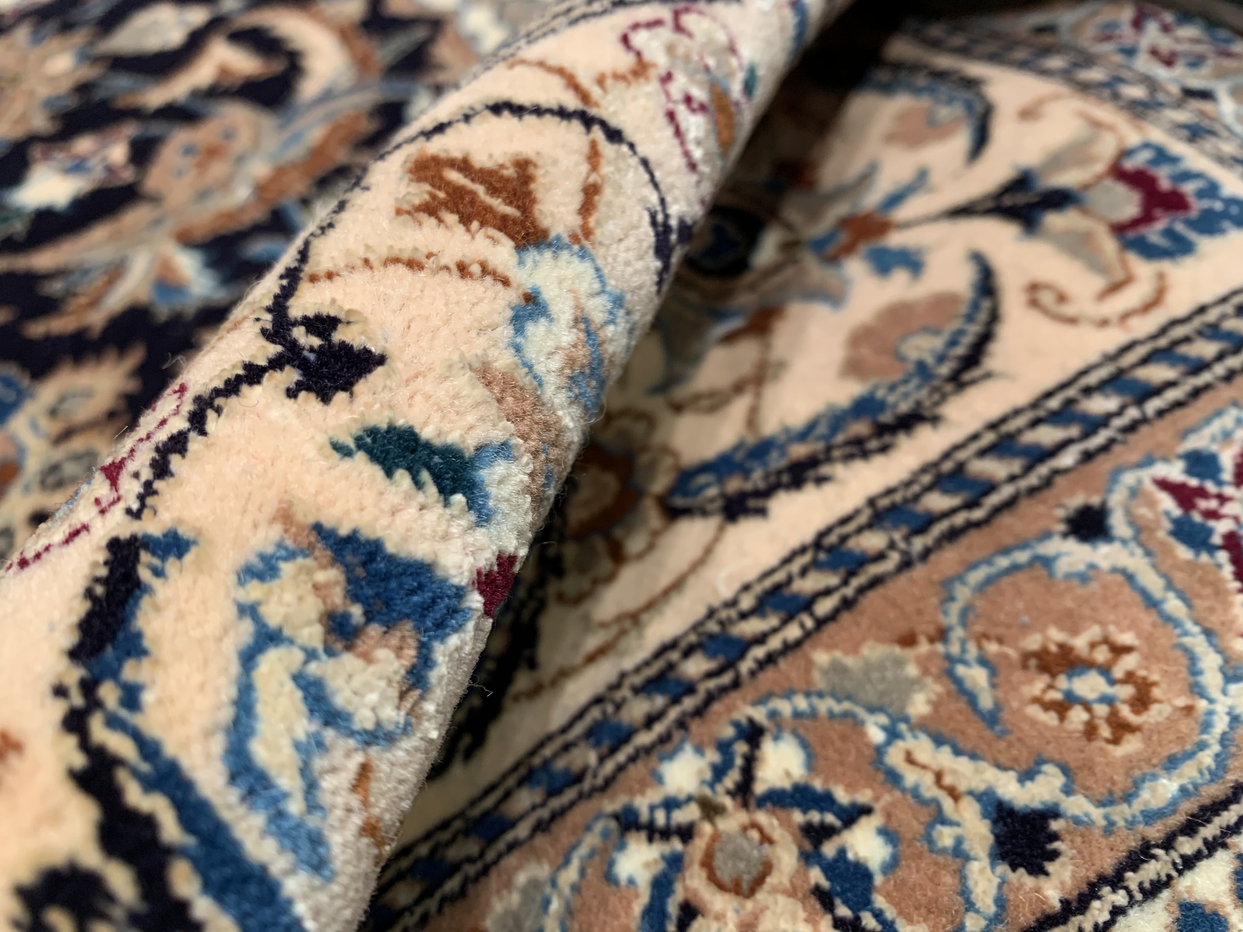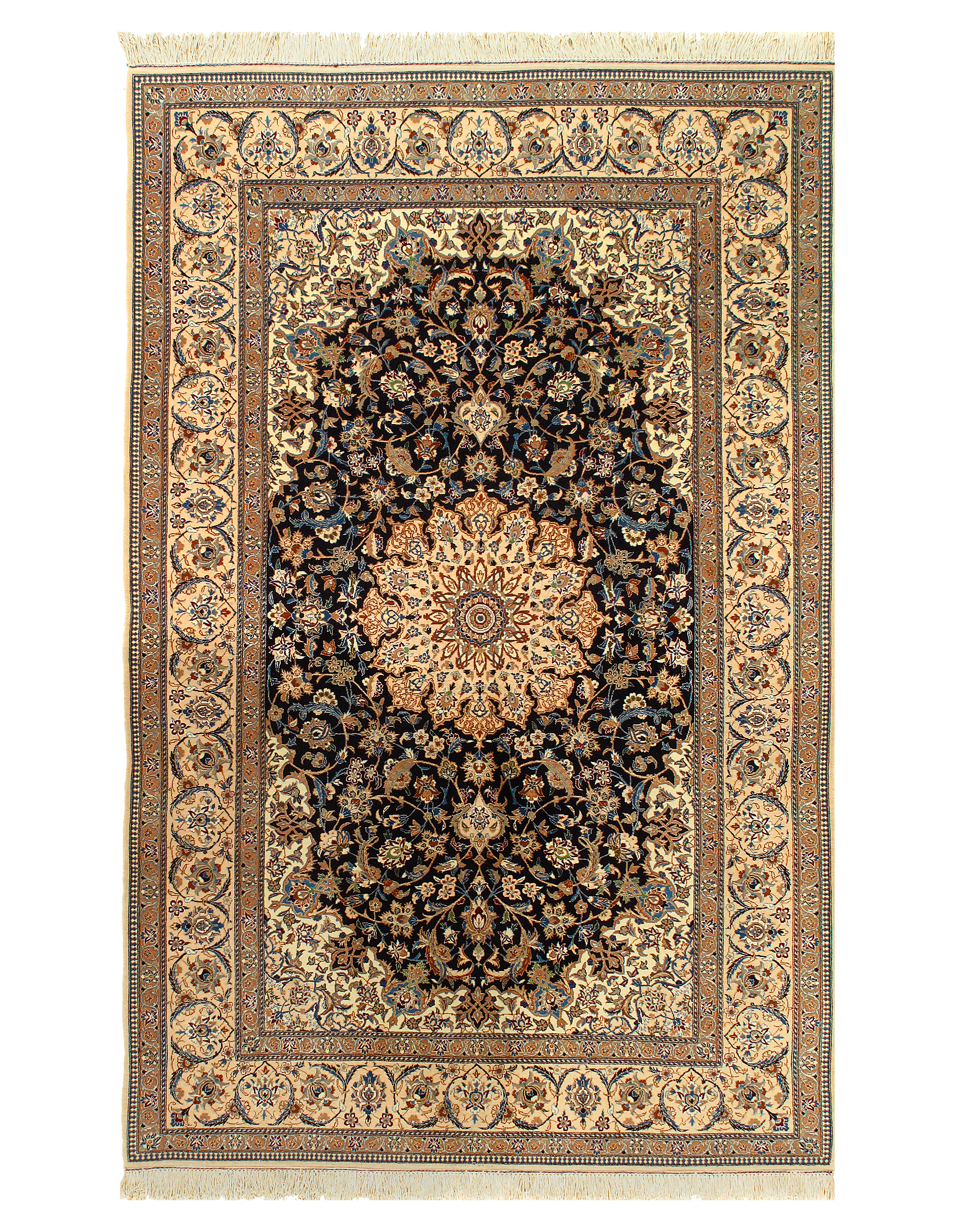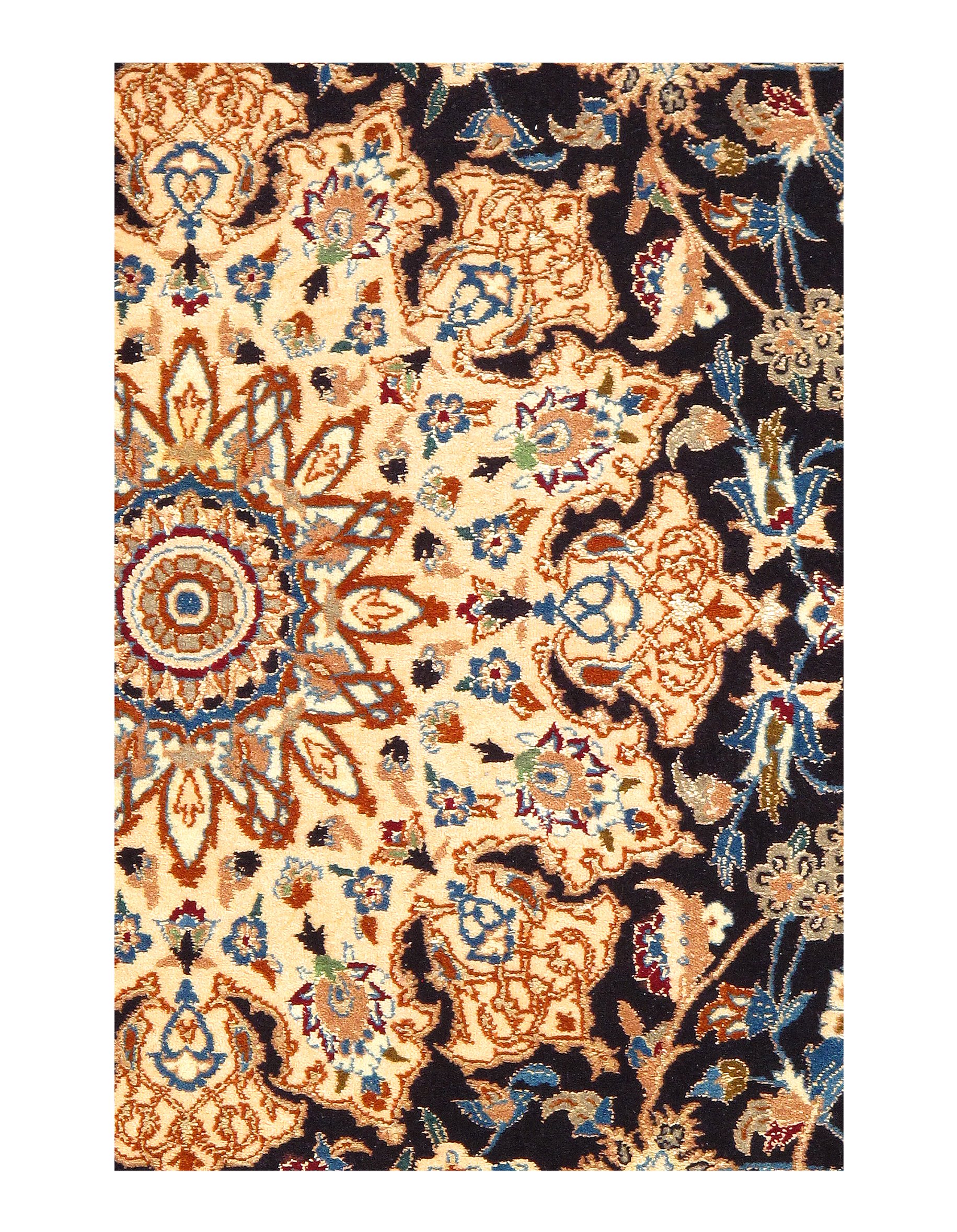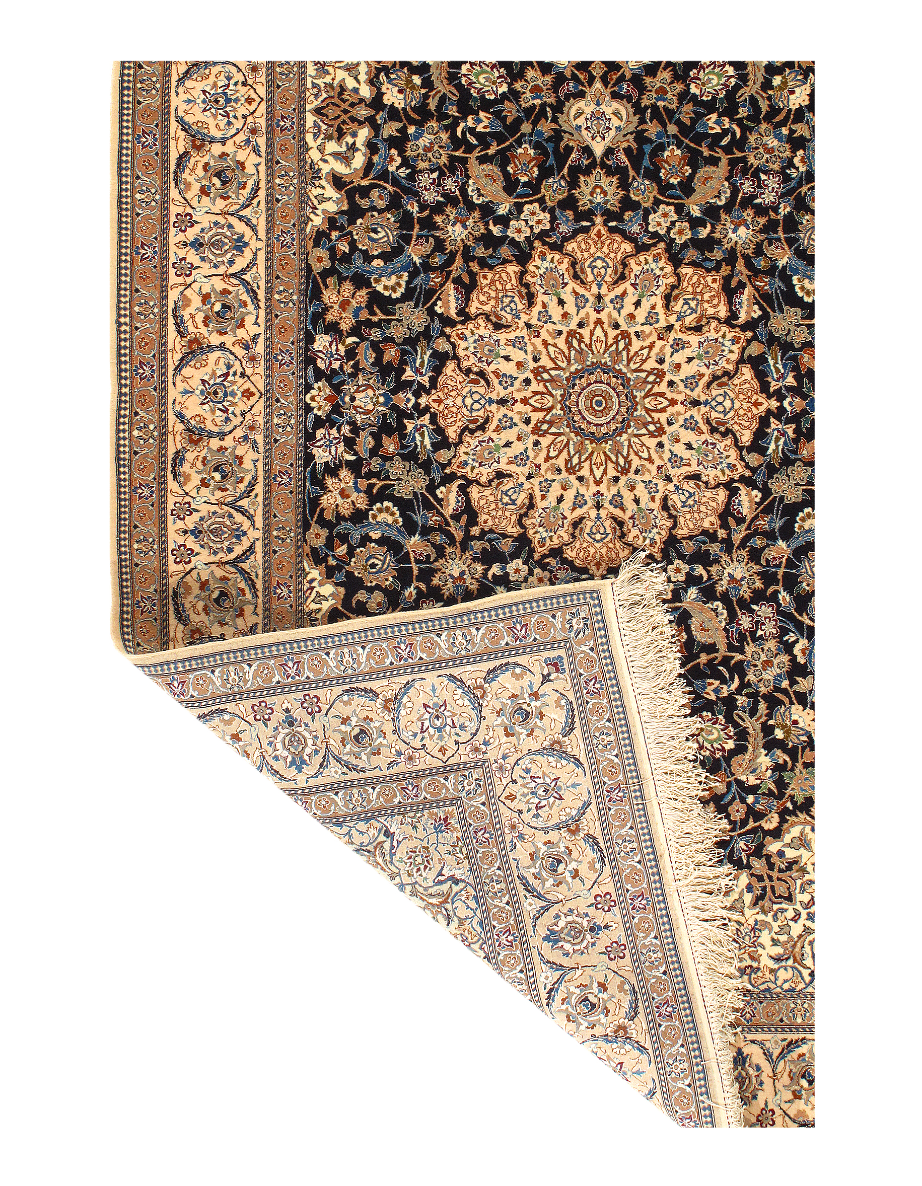 Beautiful and Finely Woven Room Size Vintage Persian Silk and Wool Nain Rug, Origin: Persia, An impressive and exciting style of Persian vintage rug, Nain rugs are carpets are noted for their extraordinarily fine weaving as well as for the incredibly intricate and symmetrical compositions that make them a unique style. This arresting Vintage Persian rug from Nain is decorated with an elaborate pendant-flanked rosette surrounded by curve-linear vine-scrolls, finely detailed botanical motifs and ornate borders that offset the deeply colored field. Parchment-colored borders decorated with a magnificent pattern of ogival cartouches and grand palmettes linked by bifurcated leaves and arching vine-scrolls complement the muted isabelline spandrels. Sinuous vine-scrolls with elaborate curves, deeply serrated palmettes and flourishing saz leaves adorn the midnight blue field of this vintage Persian silk and wool Nain rug. Multiple sets of narrow guard-bands and broad main borders featuring elaborate floral motifs tie together the sophisticated cool blue gray details, inky black field and parchment-colored spandrels. Beautifully woven.