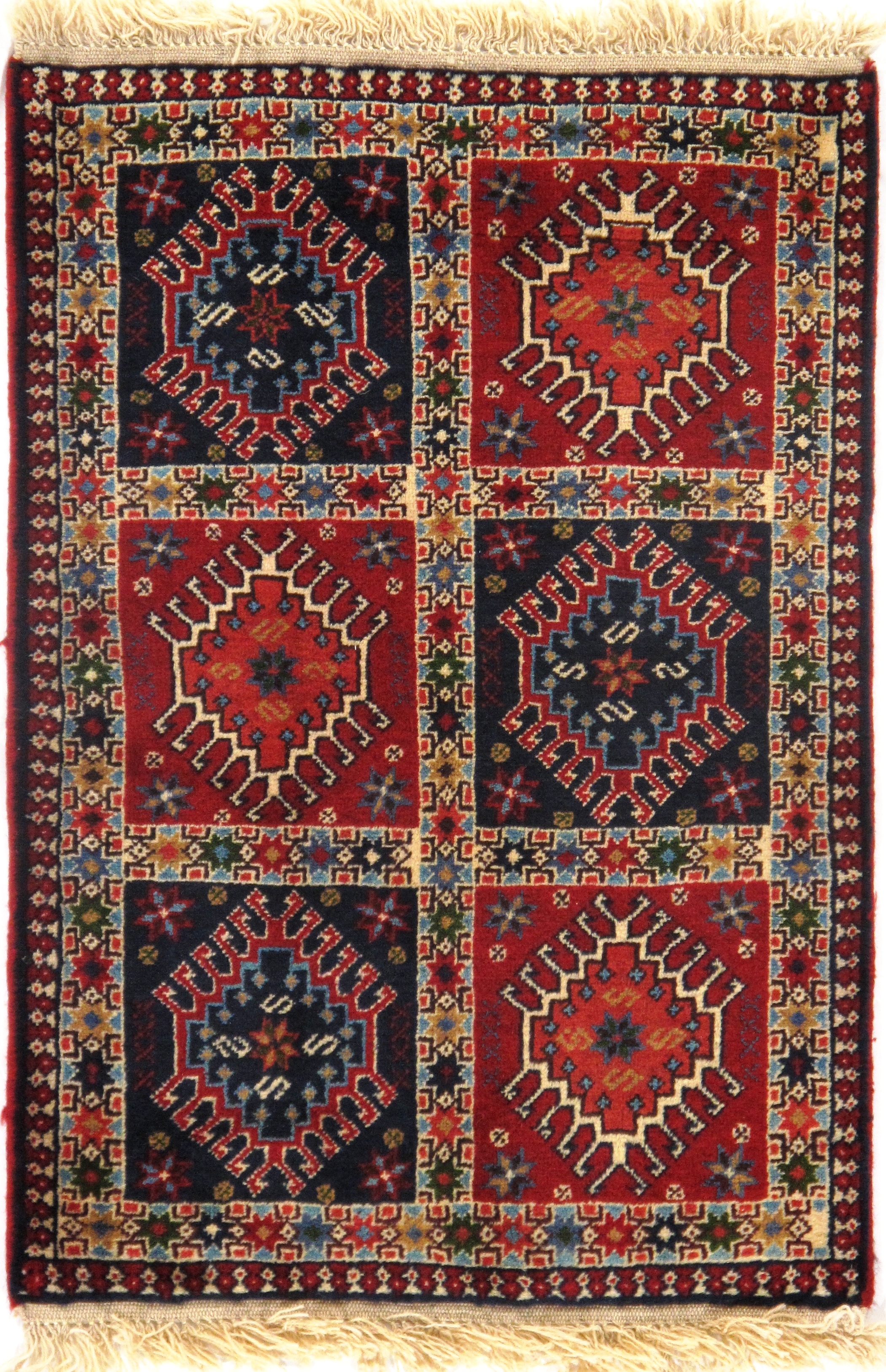 The pile used in Yalameh rugs is very fine, particularly in comparison to other tribal designs, using soft wool based on a Wool foundation. The pattern is distinctive with large repeated diamonds in a straight line down the carpet, often with geometrical animal or human prints scattered across the field. Dark red or light brown on a blue or orange background is most common for Yalameh, similar to Shiraz rugs, the rugs compliment modern or minimalist furniture beautifully, giving the living space an aura of luxurious style and warm.
