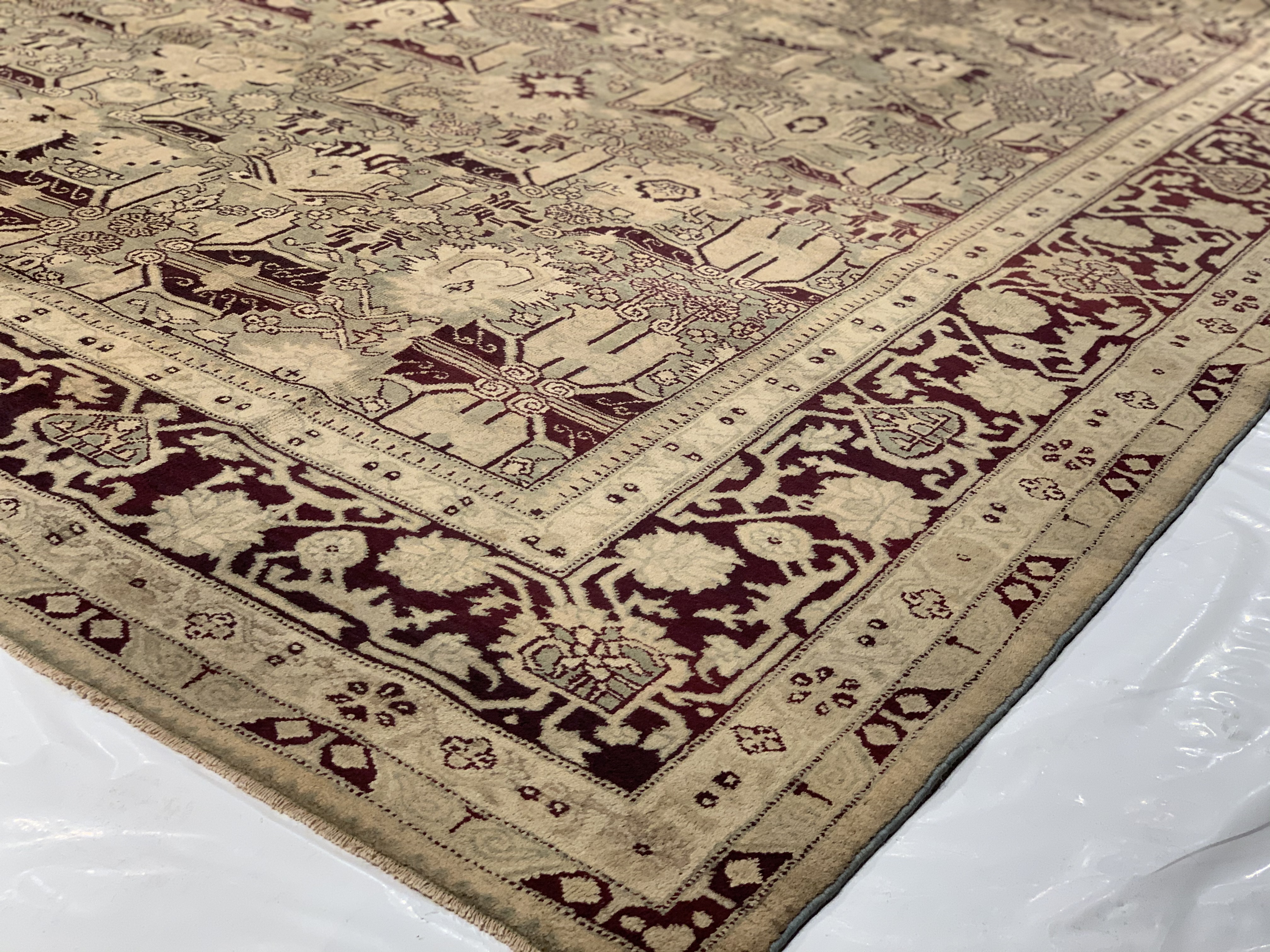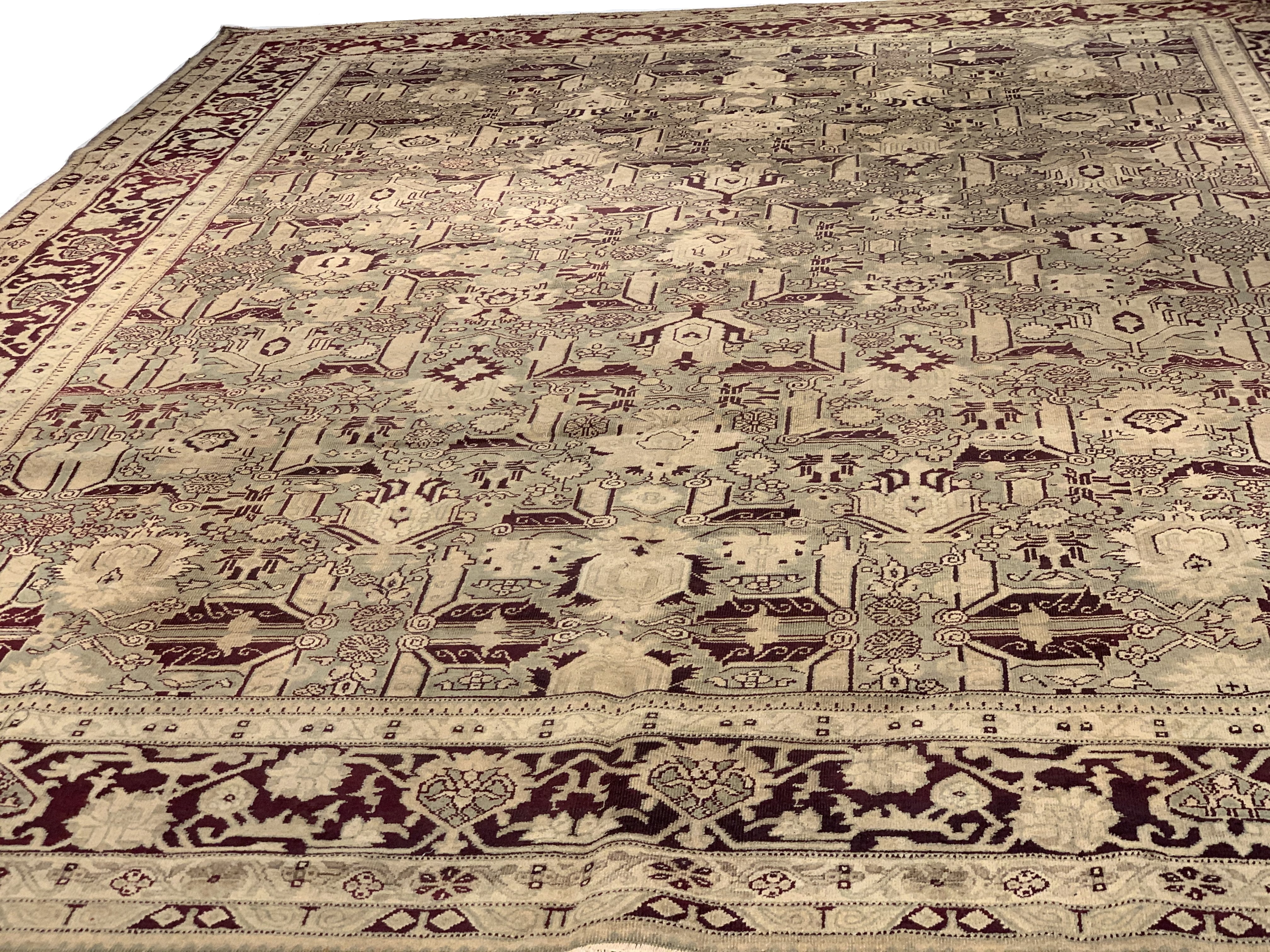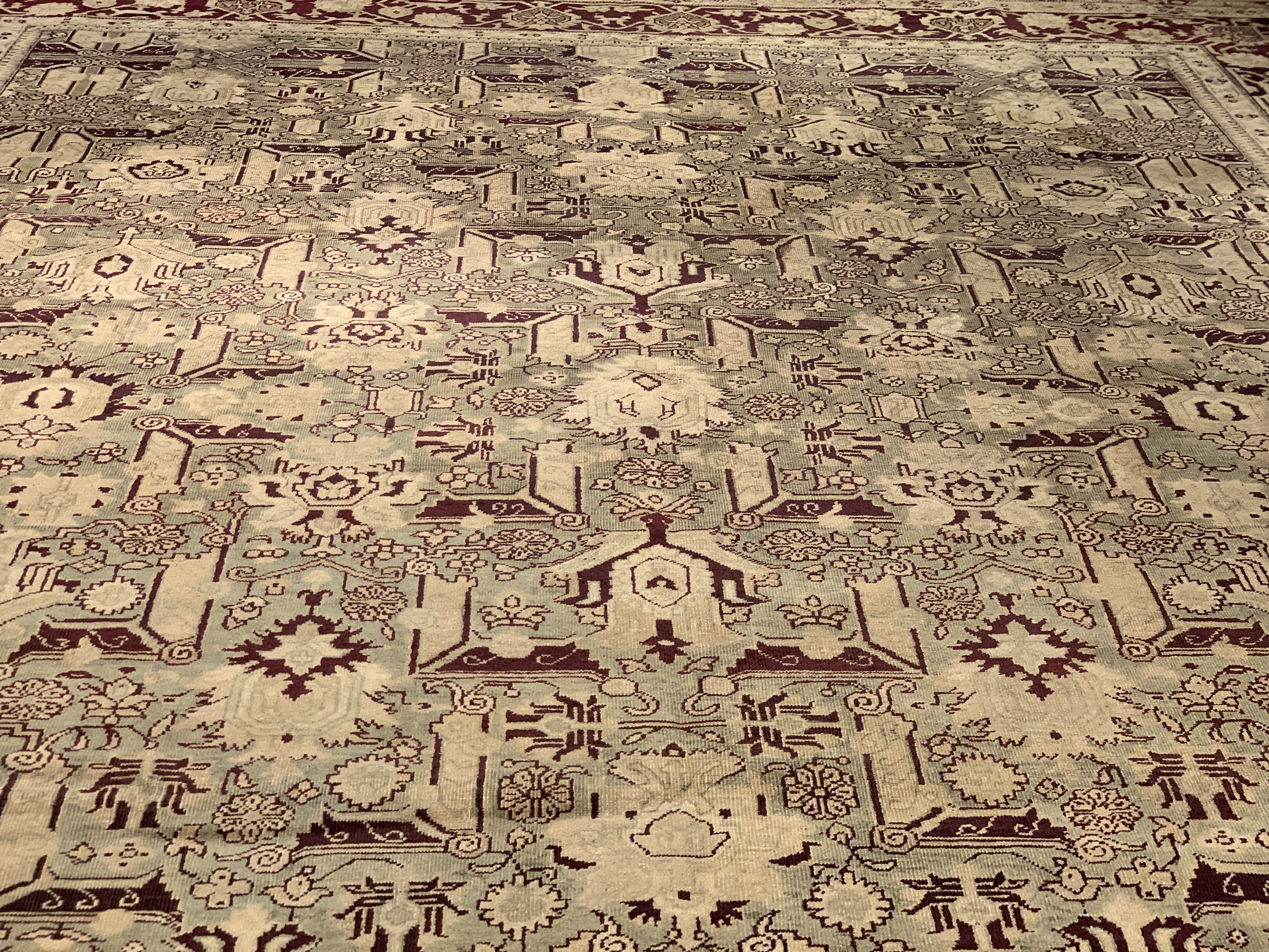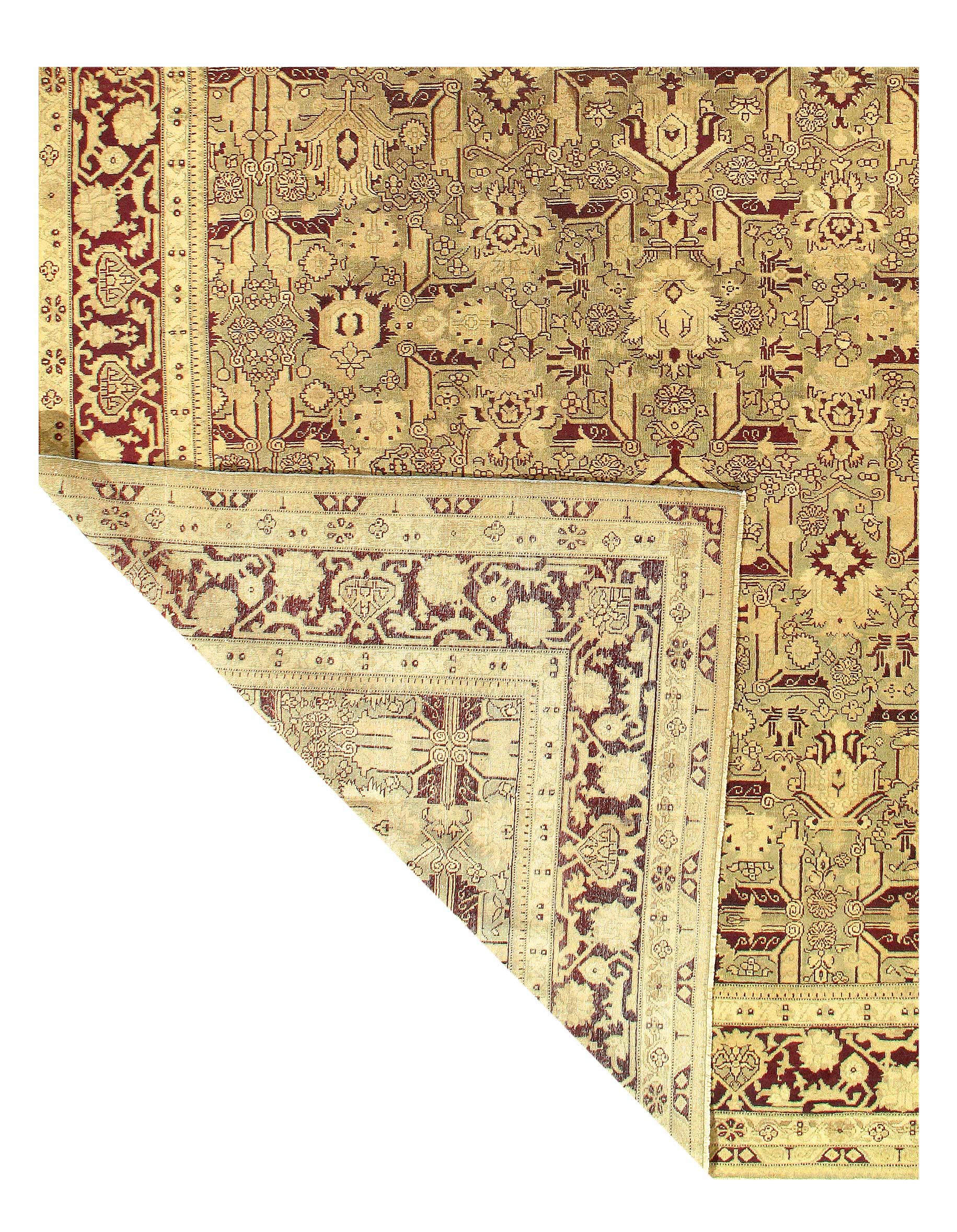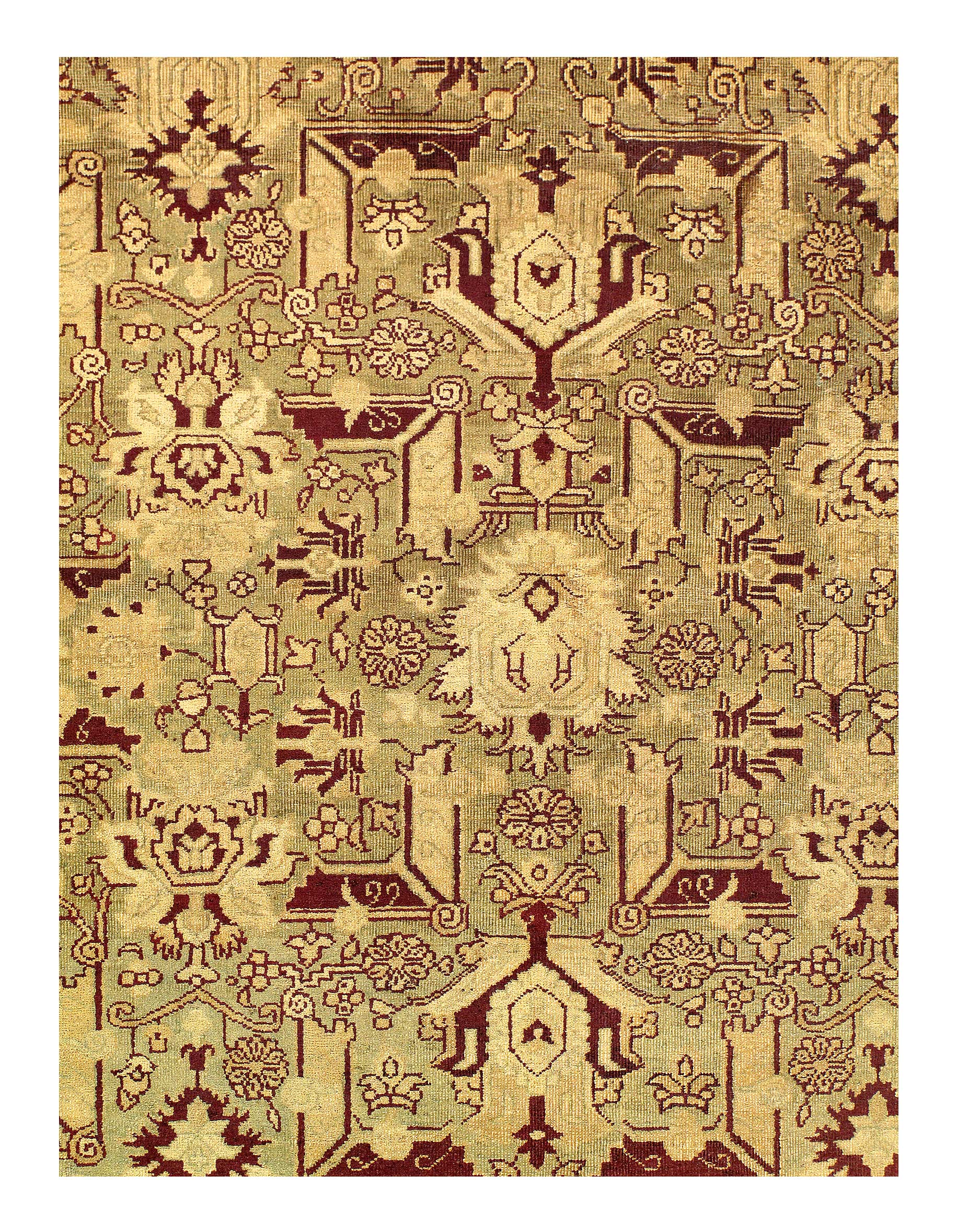 An antique Amritsar piece, woven in India around the beginning of the twentieth century. This charming antique rug is characterized primarily by its olive background, as well as by its beautiful flowing allover geometric design. Throughout the piece, flowing, undulating floral and geometrical elements twist and turn, creating a classically beautiful, luxurious allover pattern. The series of inner and outer borders that frame this graceful field are especially attractive, featuring charming floral elements. A gorgeous and graceful composition, this antique Amritsar rug from India is resplendent with classical beauty.