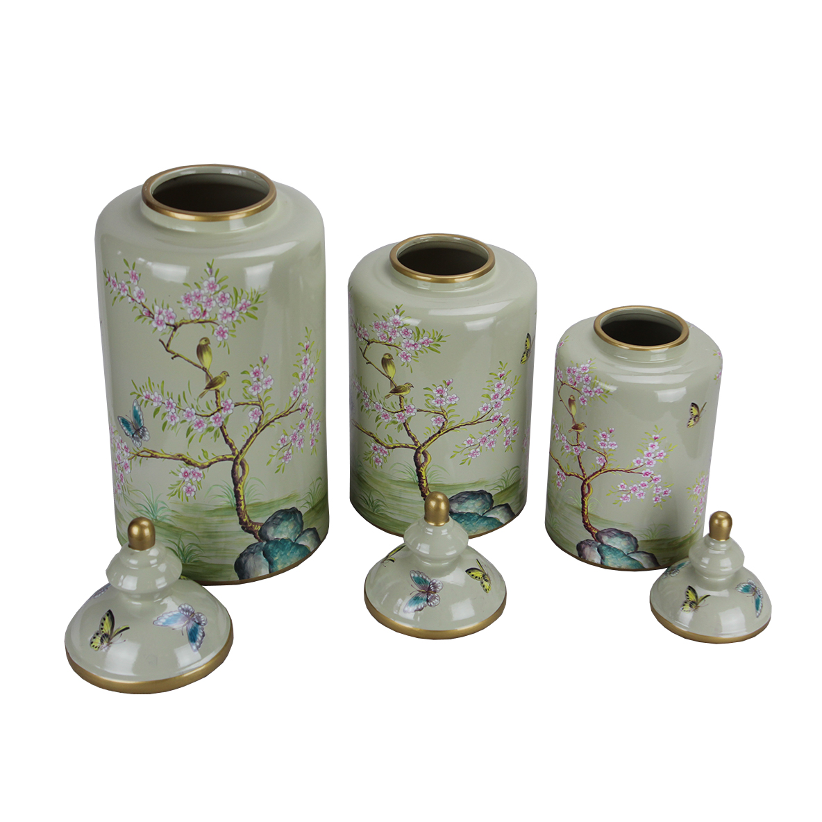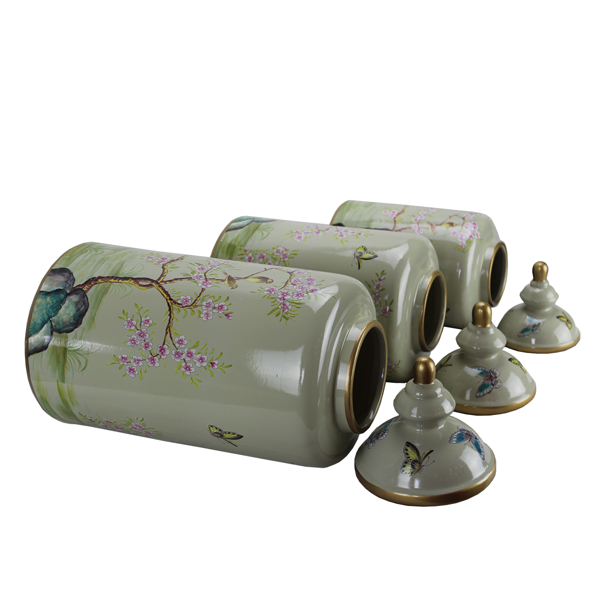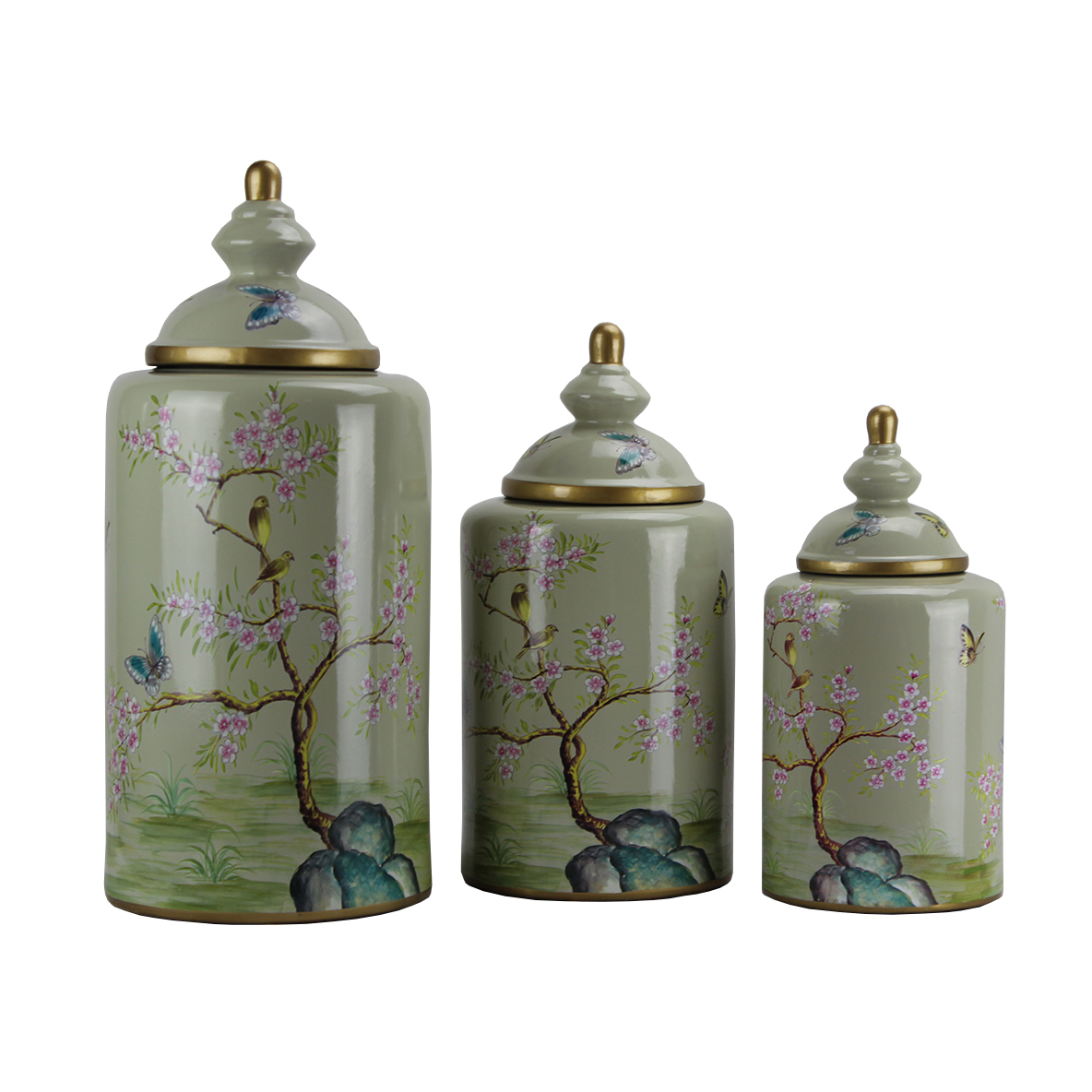 Classic Asian design jar, which are often displayed in , credenzas, or sideboards. Decorated with a Chinese olive and Apple landscape pattern with hand painted mountain and pagoda detail.
