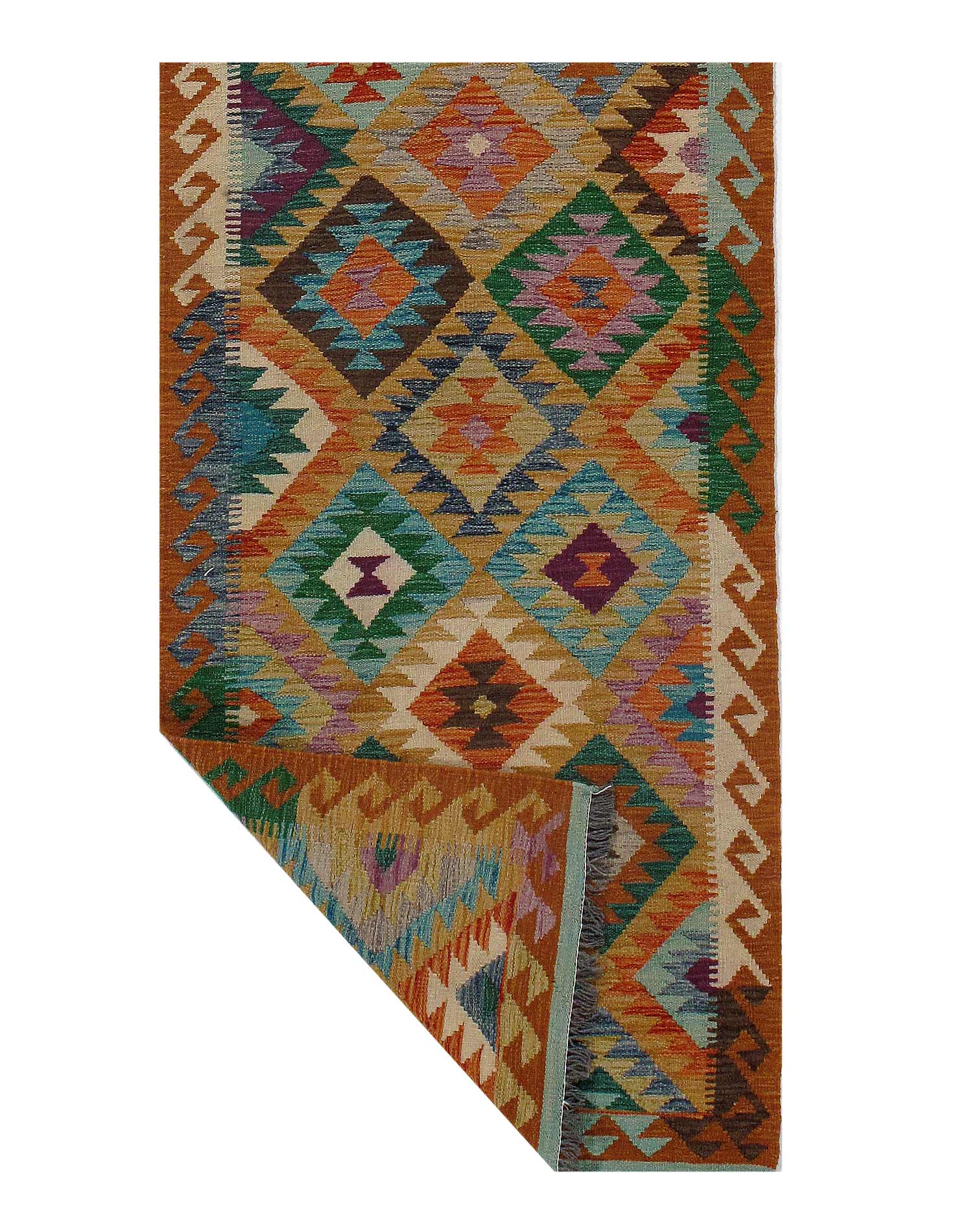 Add a touch of elegance to your home with this casual chic hand woven Kilim wool rug. Constructed on a loom by Nomad turkman people with hand spun wool and 100% natural Vegetable dyes this beautiful rug is known for its beautiful repetitive geometric pattern with naturalistic floral and traditional patterns. The contemporary fashion palette produces bold, sharp patterns that are ingeniously versatile as the pattern is same on the front and back. This double-sided rug is designed to be used both ways being one side has a light shade of color, rather the other side has brighter colors and can be used to preference. This beautiful rug is made by individual short strands of different color being knotted onto the warps and held together by pressing the wefts tightly. The design is made by interweaving the variously colored wefts and warps. Kilims are known to be one of a kind rug due to its durability and versatility