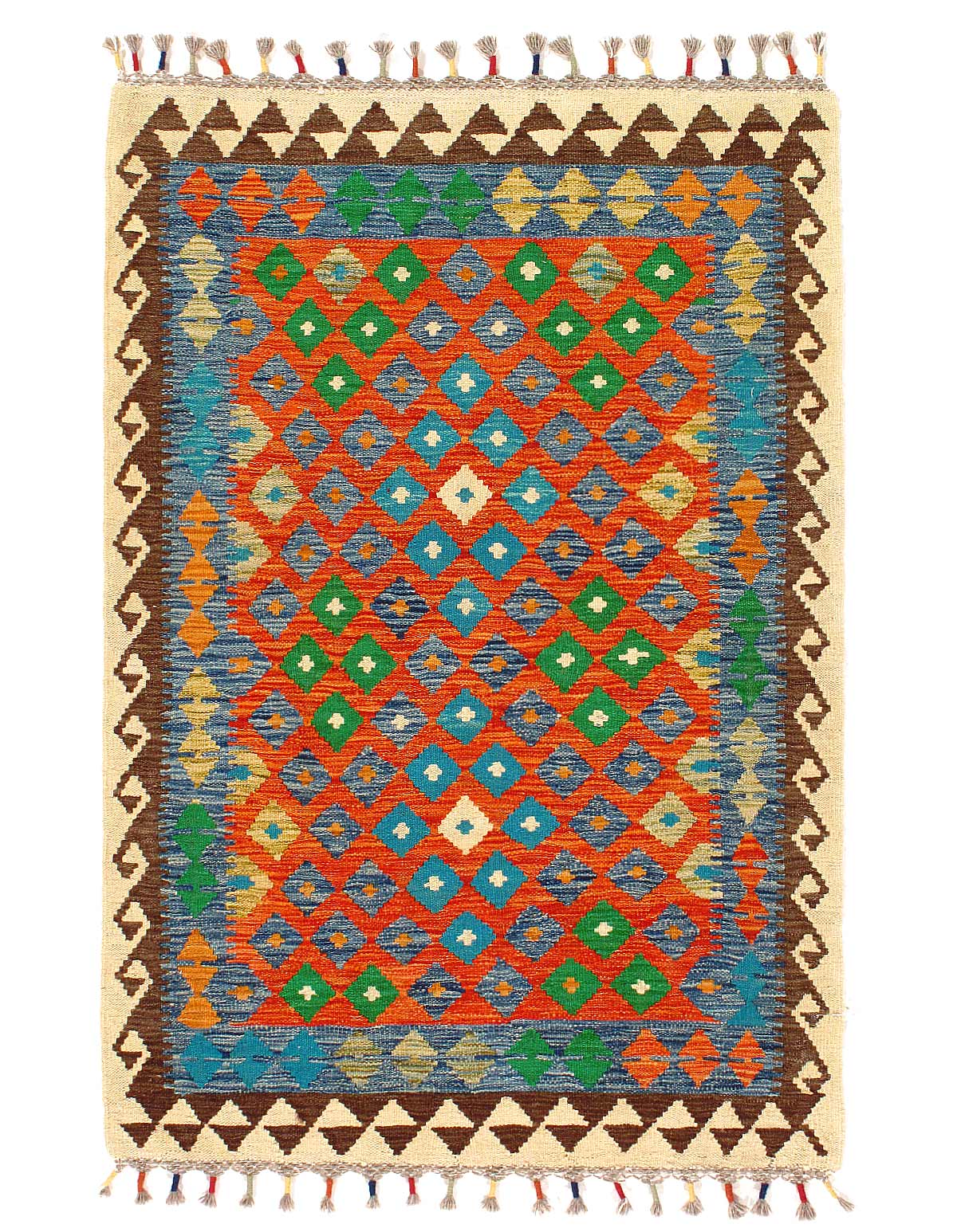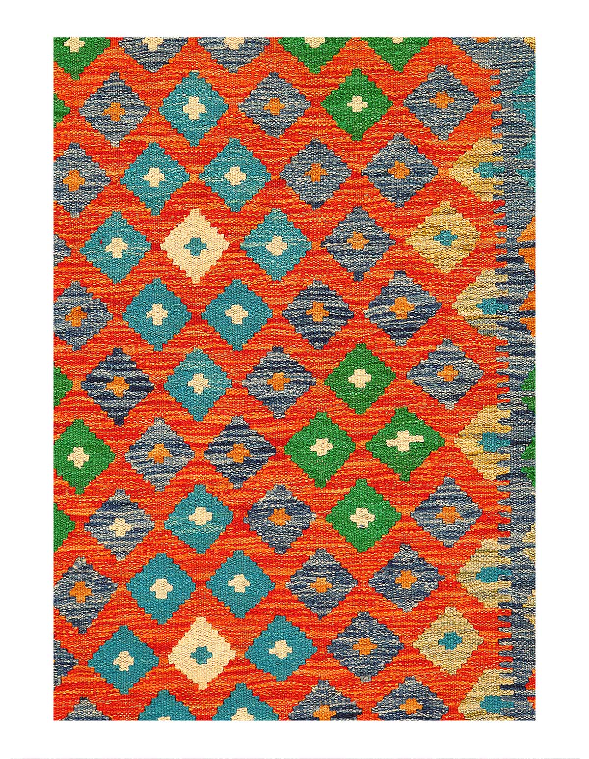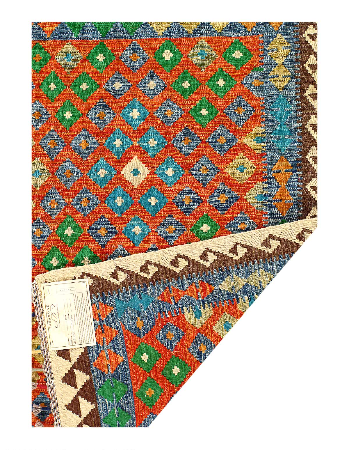 Add a touch of elegance to your home with this casual chic hand woven Kilim wool rug. Constructed on a loom by Nomad turkman people with hand spun wool and 100% natural Vegetable dyes this beautiful rug is known for its beautiful repetitive geometric pattern with naturalistic floral and traditional patterns. The contemporary fashion palette produces bold, sharp patterns that are ingeniously versatile as the pattern is same on the front and back. This double-sided rug is designed to be used both ways being one side has a light shade of color, rather the other side has brighter colors and can be used to preference. This beautiful rug is made by individual short strands of different color being knotted onto the warps and held together by pressing the wefts tightly. The design is made by interweaving the variously colored wefts and warps. Kilims are known to be one of a kind rug due to its durability and versatility.#D09900