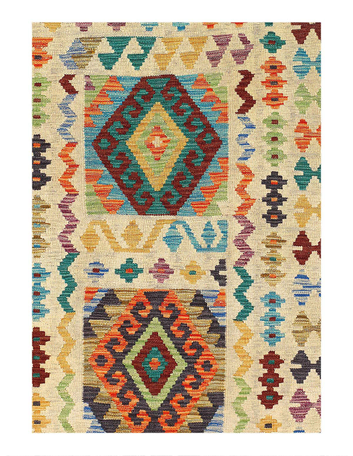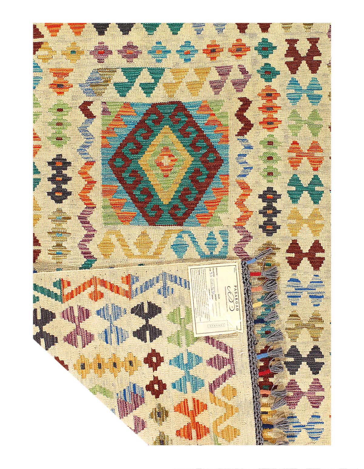 Add a touch of elegance to your home with this casual chic hand woven Kilim wool rug. Constructed on a loom by Nomad turkman people with hand spun wool and 100% natural Vegetable dyes this beautiful rug is known for its beautiful repetitive geometric pattern with naturalistic floral and traditional patterns. The contemporary fashion palette produces bold, sharp patterns that are ingeniously versatile as the pattern is same on the front and back. This double-sided rug is designed to be used both ways being one side has a light shade of color, rather the other side has brighter colors and can be used to preference. This beautiful rug is made by individual short strands of different color being knotted onto the warps and held together by pressing the wefts tightly. The design is made by interweaving the variously colored wefts and warps. Kilims are known to be one of a kind rug due to its durability and versatility.#D09892