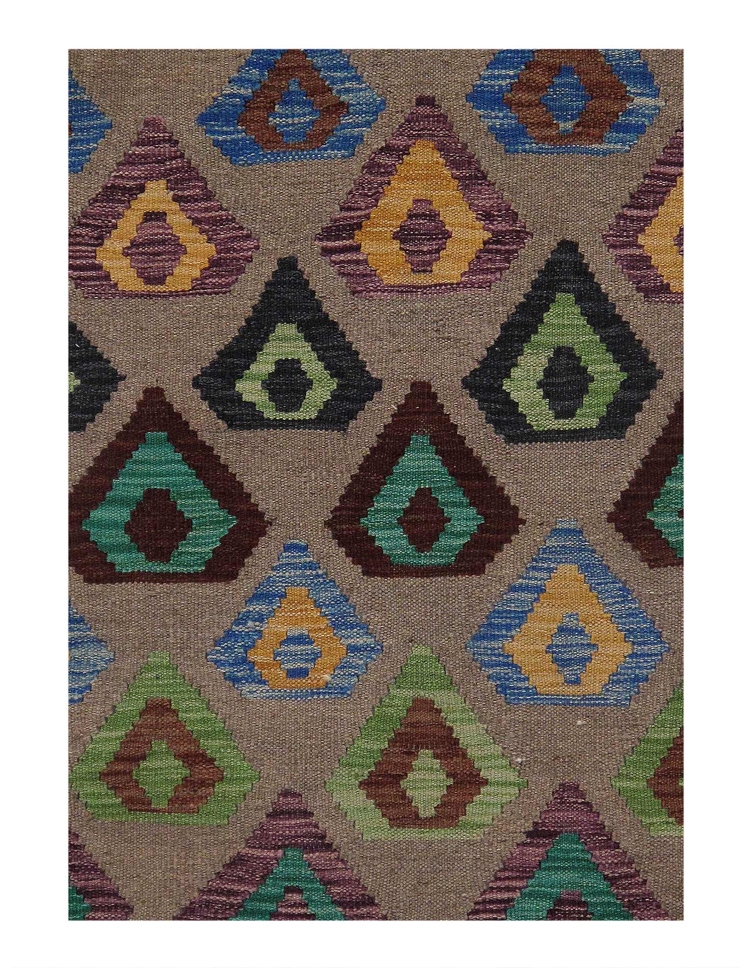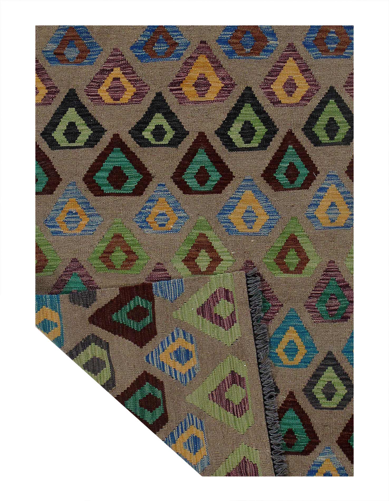 Add a touch of elegance to your home with this casual chic hand woven Kilim wool rug. Constructed on a loom by Nomad turkman people with hand spun wool and 100% natural Vegetable dyes this beautiful rug is known for its beautiful repetitive geometric pattern with naturalistic floral and traditional patterns. The contemporary fashion palette produces bold, sharp patterns that are ingeniously versatile as the pattern is same on the front and back. This double-sided rug is designed to be used both ways being one side has a light shade of color, rather the other side has brighter colors and can be used to preference. This beautiful rug is made by individual short strands of different color being knotted onto the warps and held together by pressing the wefts tightly. The design is made by interweaving the variously colored wefts and warps. Kilims are known to be one of a kind rug due to its durability and versatility