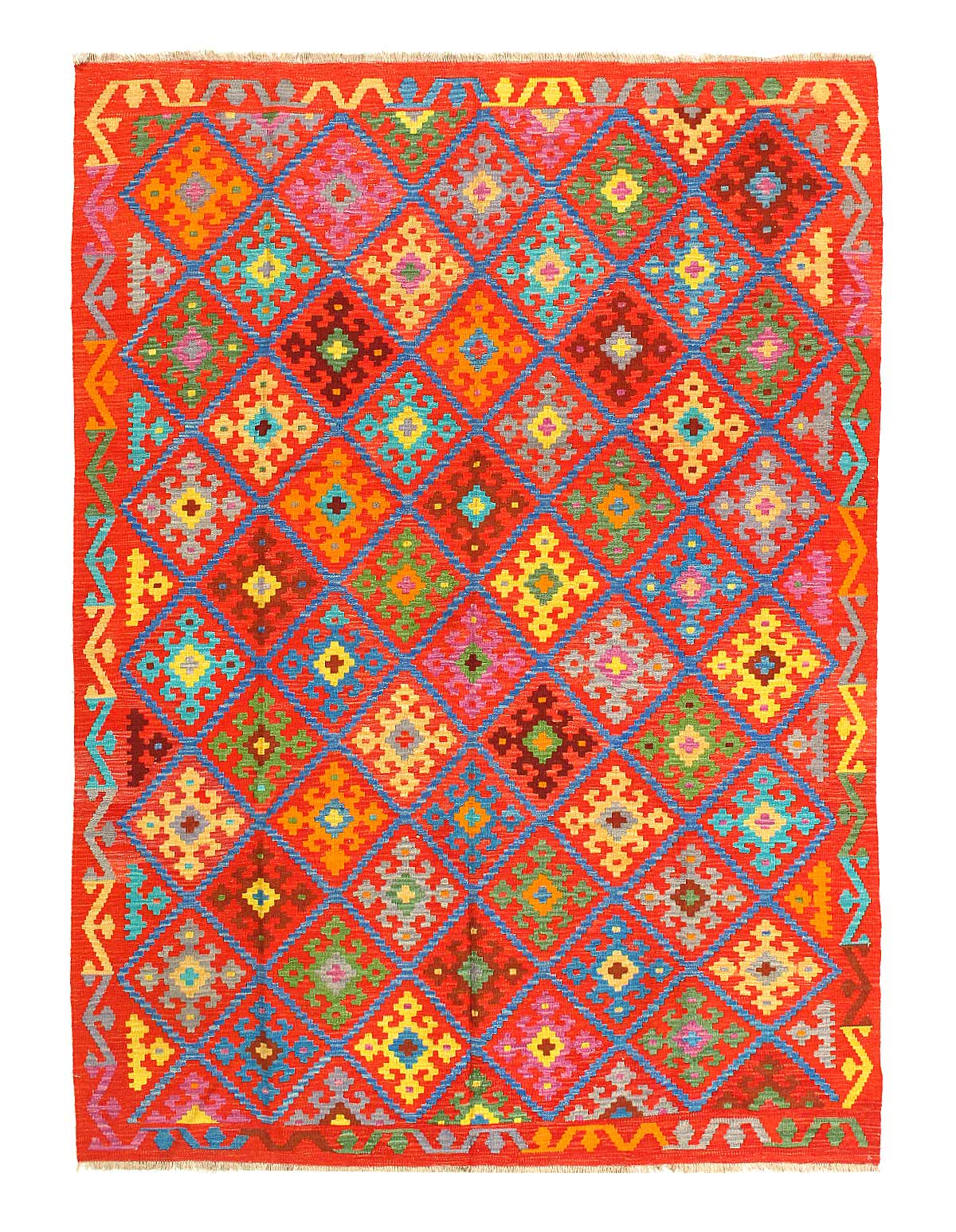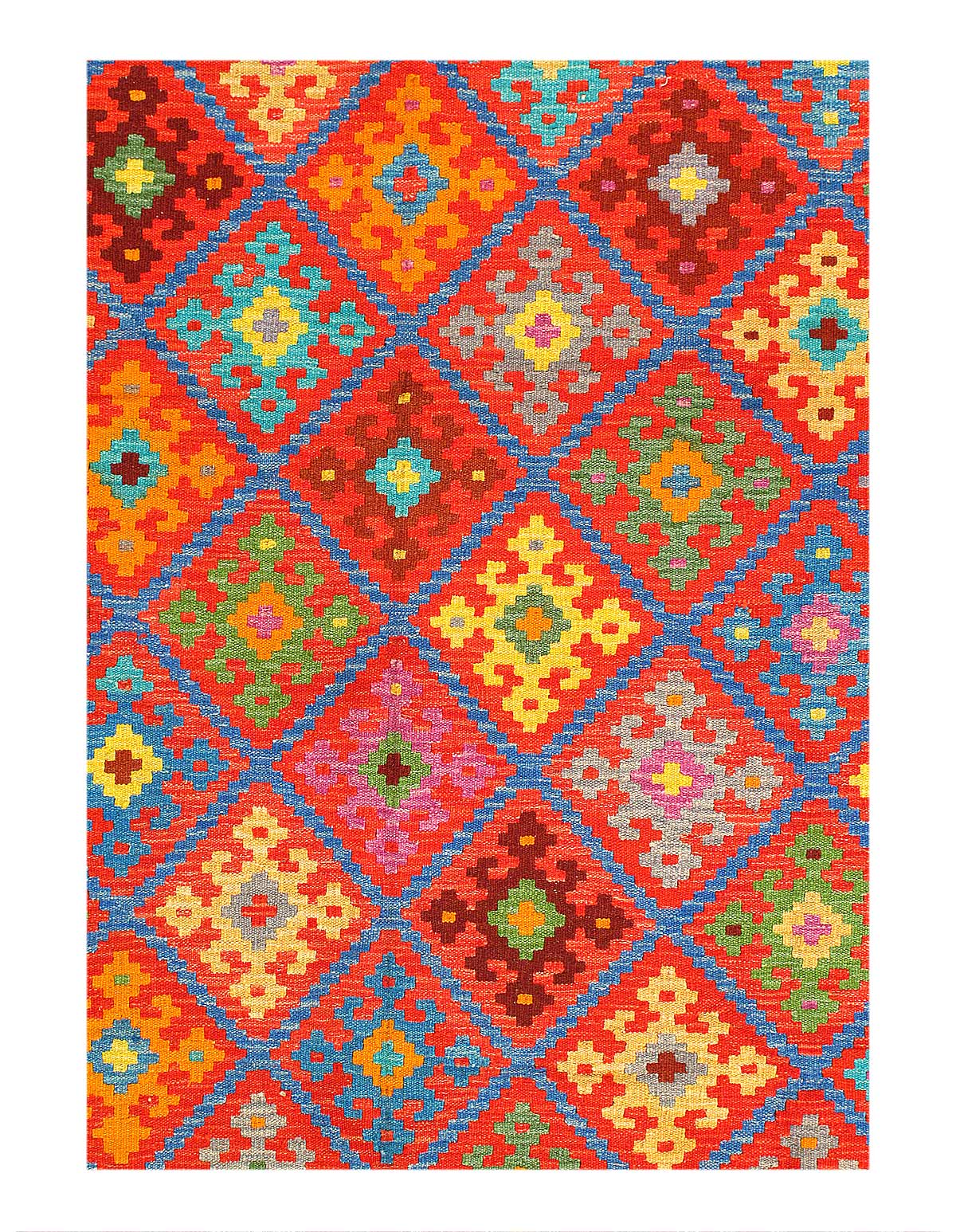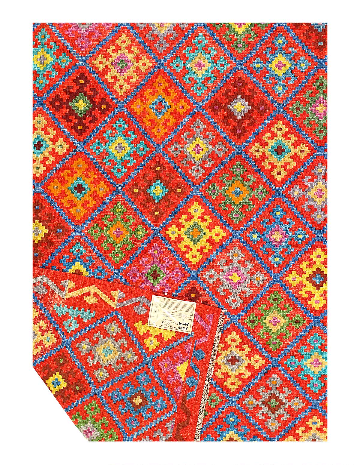 Add a touch of elegance to your home with this casual chic hand woven Kilim wool rug. Constructed on a loom by Nomad turkman people with hand spun wool and 100% natural Vegetable dyes this beautiful rug is known for its beautiful repetitive geometric pattern with naturalistic floral and traditional patterns. The contemporary fashion palette produces bold, sharp patterns that are ingeniously versatile as the pattern is same on the front and back. This double-sided rug is designed to be used both ways being one side has a light shade of color, rather the other side has brighter colors and can be used to preference. This beautiful rug is made by individual short strands of different color being knotted onto the warps and held together by pressing the wefts tightly. The design is made by interweaving the variously colored wefts and warps. Kilims are known to be one of a kind rug due to its durability and versatility.#D14235