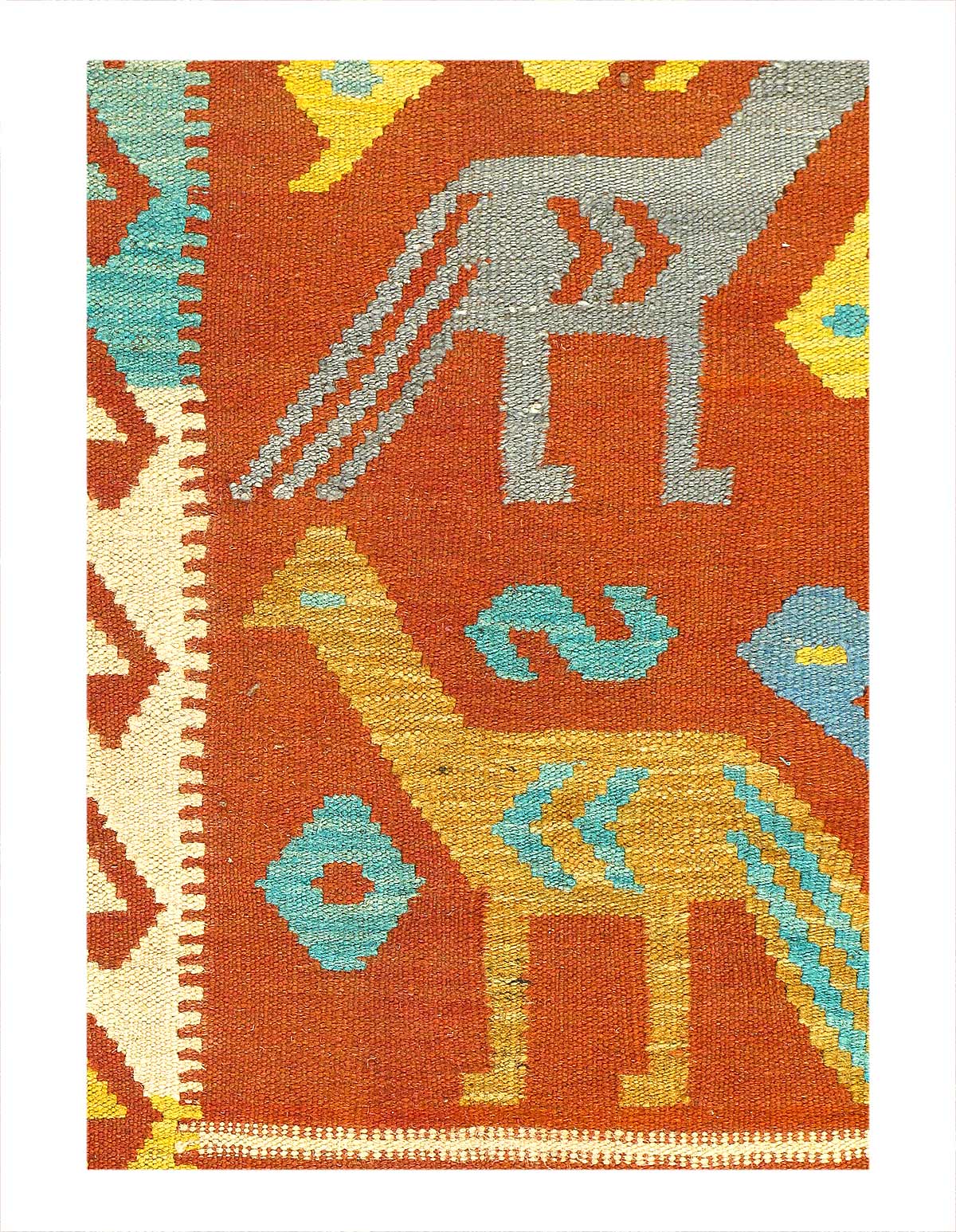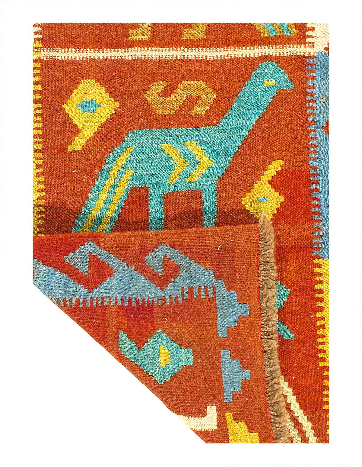 Add a touch of elegance to your home with this casual chic hand woven Kilim wool rug. Constructed on a loom by Nomad turkman people with hand spun wool and 100% natural Vegetable dyes this beautiful rug is known for its beautiful repetitive geometric pattern with naturalistic floral and traditional patterns. The contemporary fashion palette produces bold, sharp patterns that are ingeniously versatile as the pattern is same on the front and back. This double-sided rug is designed to be used both ways being one side has a light shade of color, rather the other side has brighter colors and can be used to preference. This beautiful rug is made by individual short strands of different color being knotted onto the warps and held together by pressing the wefts tightly. The design is made by interweaving the variously colored wefts and warps. Kilims are known to be one of a kind rug due to its durability and versatility.#D14420
