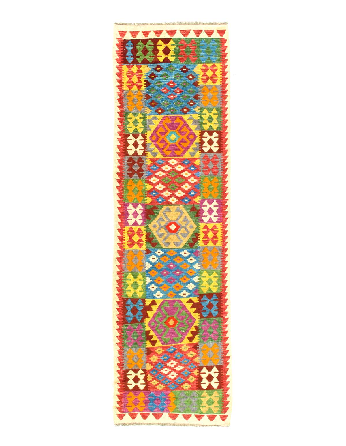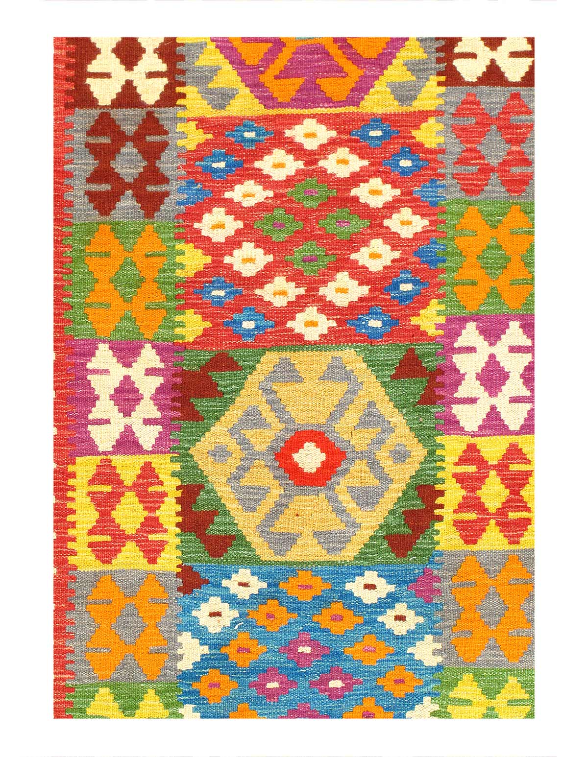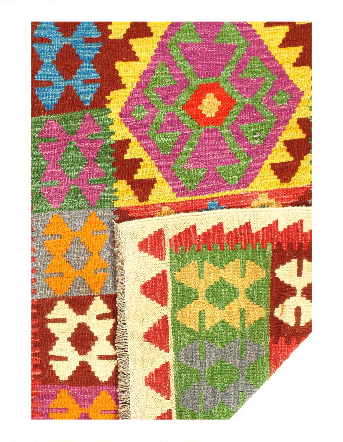 Add a touch of elegance to your home with this casual chic hand woven Kilim wool rug. Constructed on a loom by Nomad turkman people with hand spun wool and 100% natural Vegetable dyes this beautiful rug is known for its beautiful repetitive geometric pattern with naturalistic floral and traditional patterns. The contemporary fashion palette produces bold, sharp patterns that are ingeniously versatile as the pattern is same on the front and back. This double-sided rug is designed to be used both ways being one side has a light shade of color, rather the other side has brighter colors and can be used to preference. This beautiful rug is made by individual short strands of different color being knotted onto the warps and held together by pressing the wefts tightly. The design is made by interweaving the variously colored wefts and warps. Kilims are known to be one of a kind rug due to its durability and versatility.#D14406