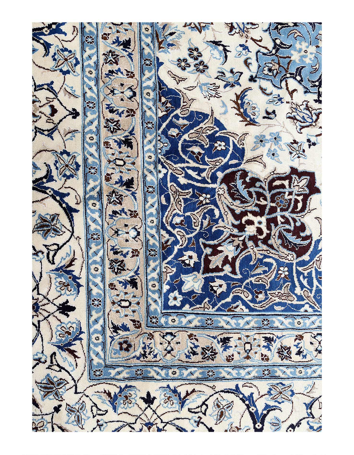Persian Nain rugs are renowned for their detail and fine use of outlining along the central motifs. Breaking from the classical style of many vintage rugs produced around central Iran, Persian Nain rugs became renowned for their modern appeal and personal style, establishing the classical motifs of many other regional rugs, only through a more precise lens. In this striking piece, the precision is particularly visible along the heart of the vintage Persian rug, where the attention to detail allows each individual color to stand out as a unique part of the whole. The surrounding borders help ground the masterpiece and add horizontal intrigue to the natural elements within, which are arranged vertically to establish a cascading effect.