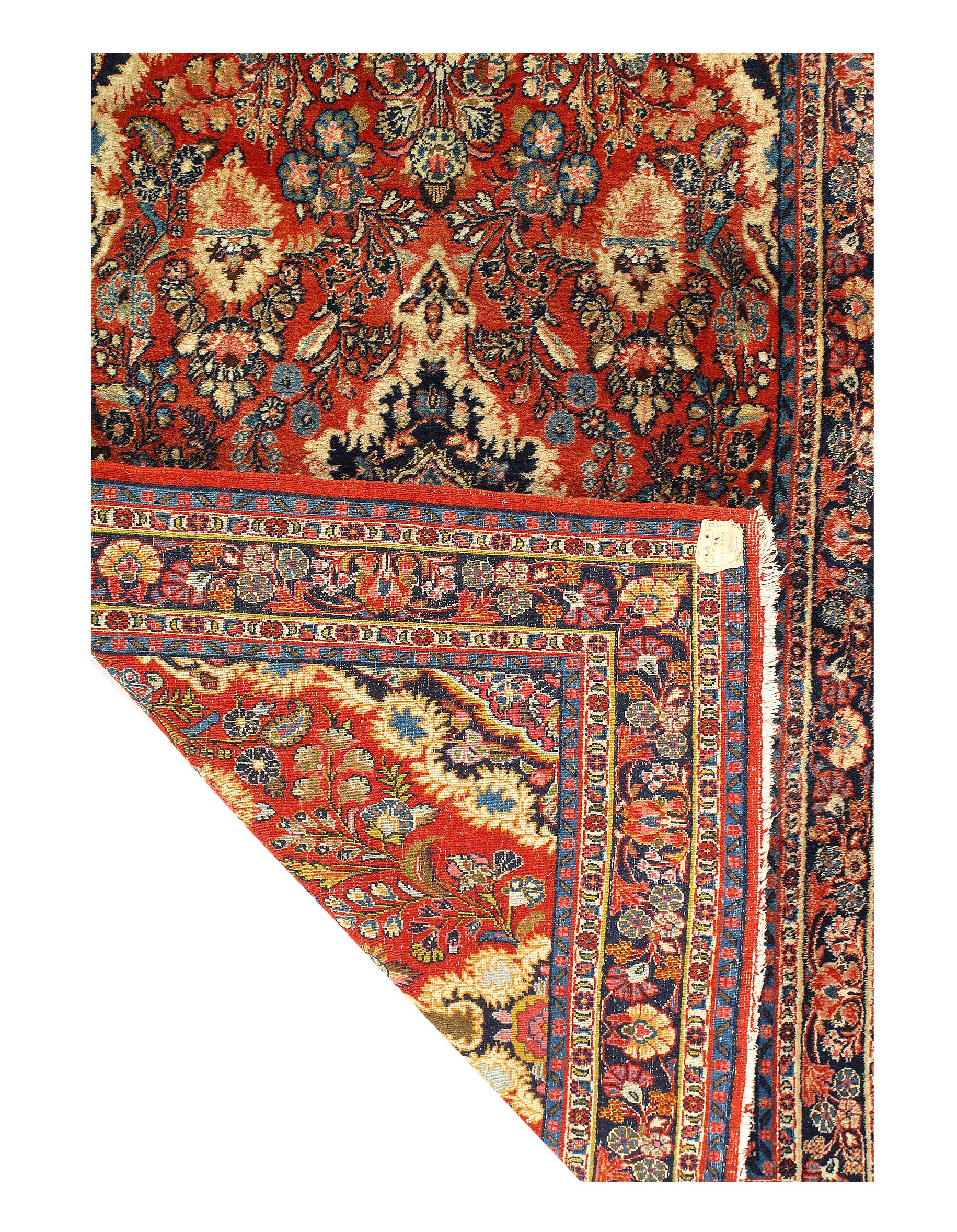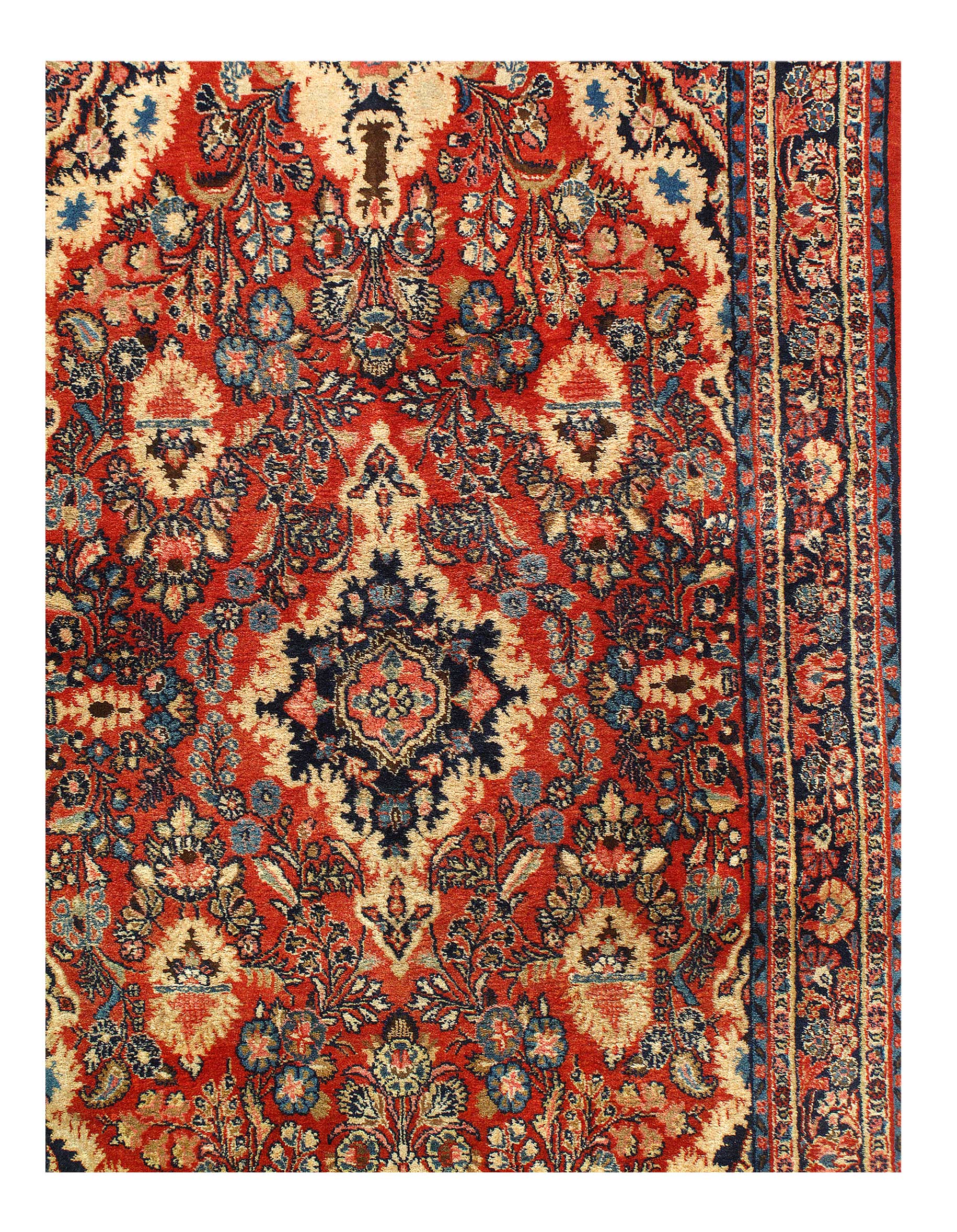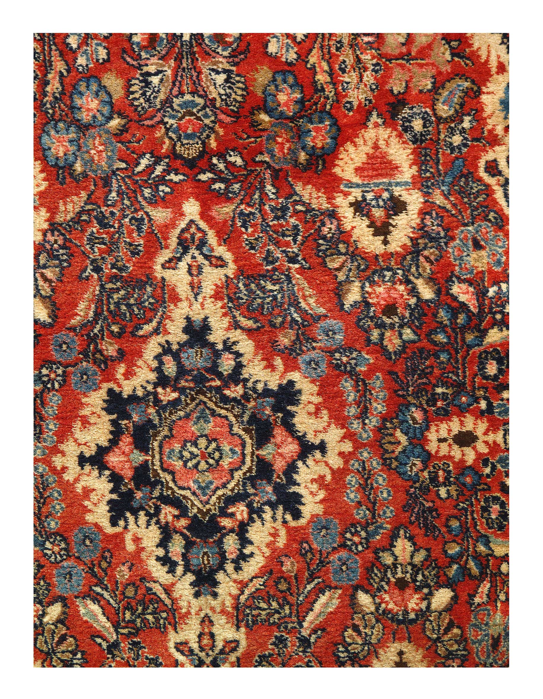 This is an antique handmade rug from the early 20th century. The piece was crafted from lamb's wool on a cotton foundation and was vegetable dyed. It has a dense, soft pile, and excellent quality, to ensure that you will enjoy it for years to come.