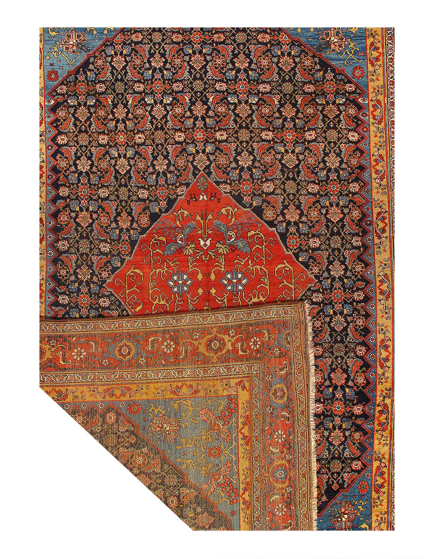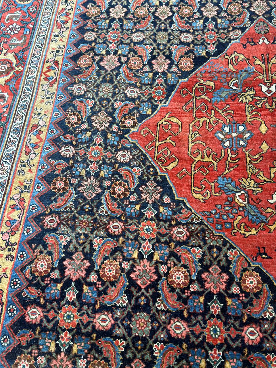The rug displays a striking combination of deep navy, rust, and Light blue hues. Furthermore, a large central medallion dominates the field, surrounded by elaborate floral motifs. As a result, the border features an intricate pattern that complements the central design. Notably, the contrast between the dark background and lighter details enhances the visual appeal.