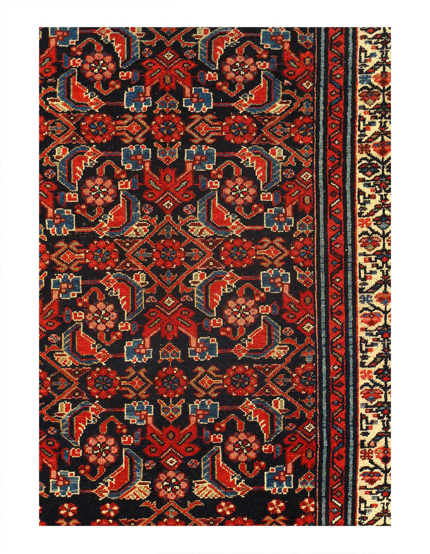 Fine Hand knotted in a village around Hamadan, western Iran. Hamadan rugs can originate from any one of hundreds of villages across the vast region. While materials used can vary from one village to another, one uniting characteristic of this area is that virtually all Hamadan rugs are single-wefted, unlike most tribal rugs which are double-wefted. This particular Persian antique rug is in excellent condition and has superb quality wool that must be felt to be fully realized. As far as Hamadans go, this piece is outstanding.