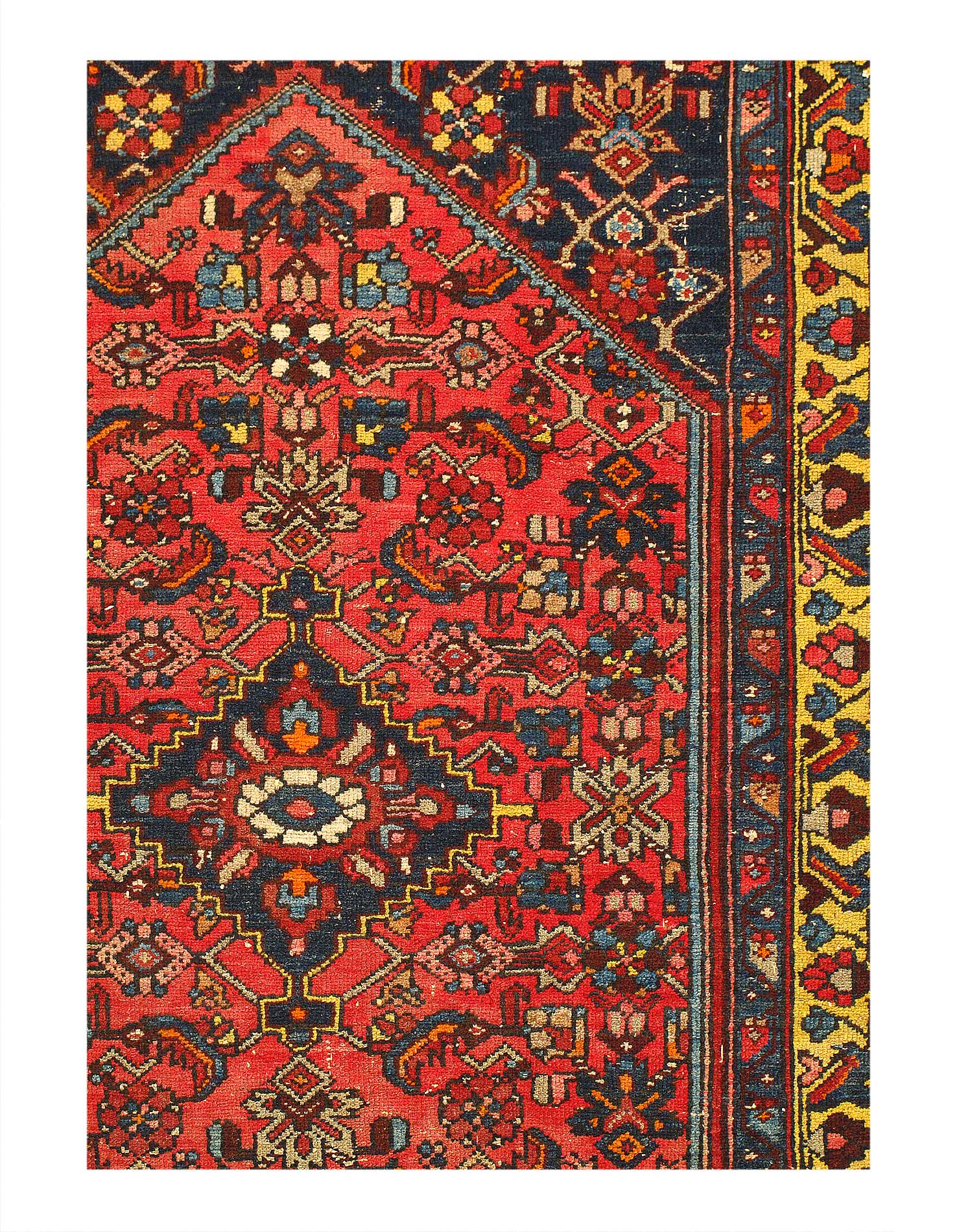 Hand knotted in a village around Hamadan, western Iran. Hamadan rugs can originate from any one of hundreds of villages across the vast region. While materials used can vary from one village to another, one uniting characteristic of this area is that virtually all Hamadan rugs are single-wefted, unlike most tribal rugs which are double-wefted. This particular Persian antique rug is in excellent condition and has superb quality wool that must be felt to be fully realized. As far as Hamadans go, this piece is outstanding.