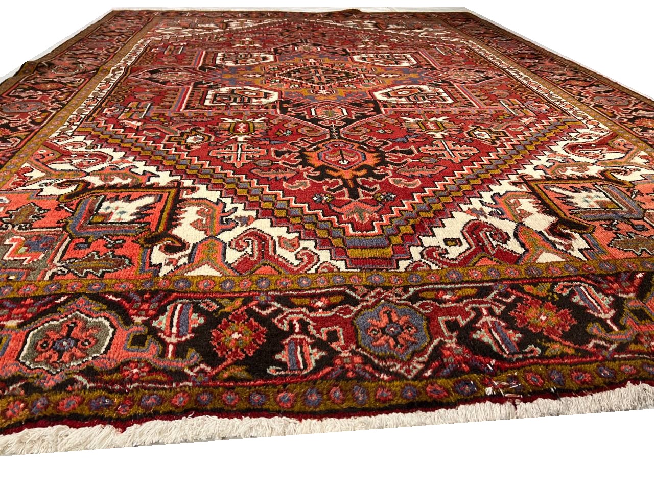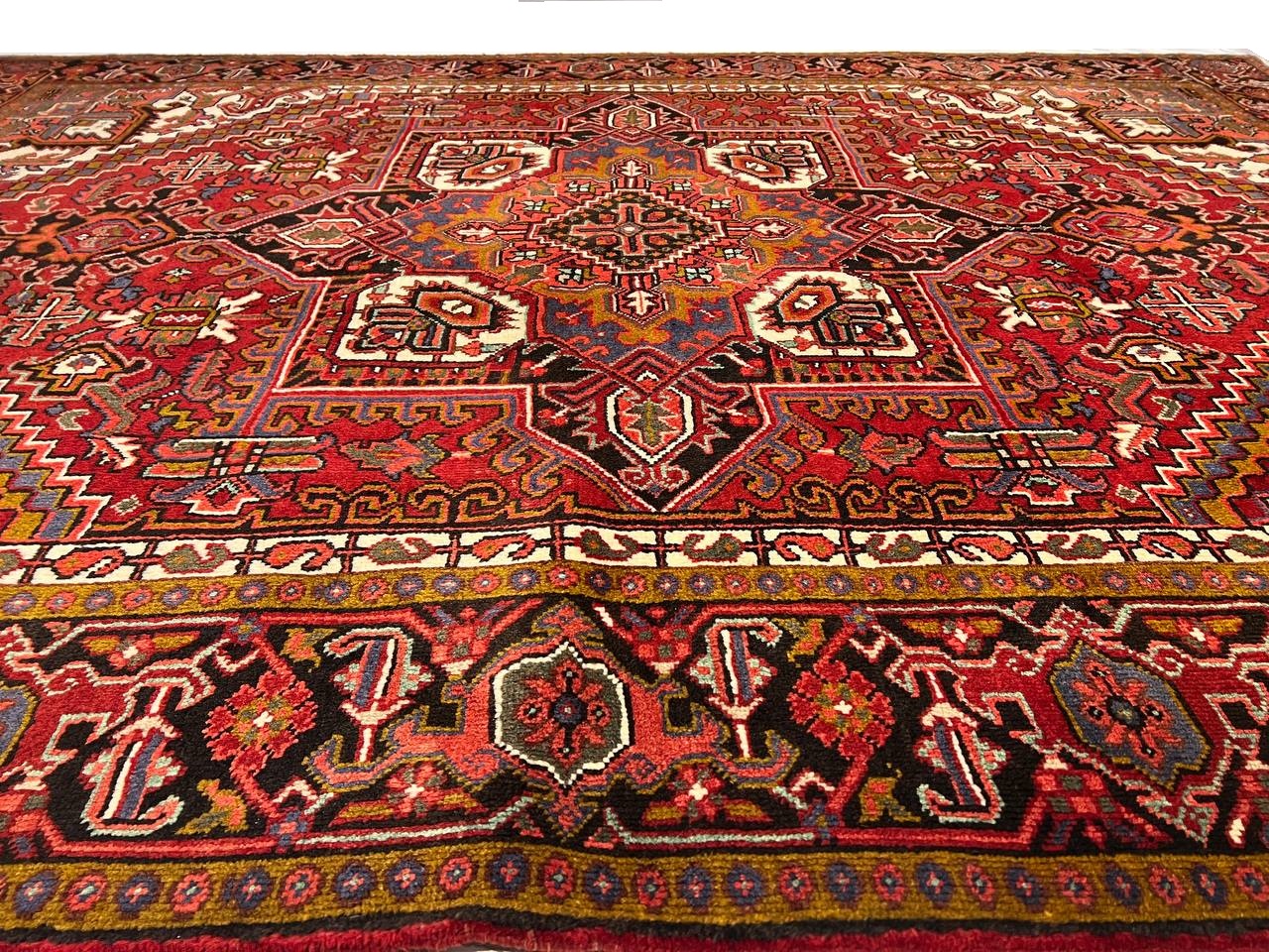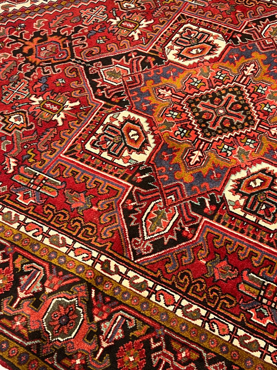 The brilliant Red field bears a central Ray of Life and many highly abstracted floral shapes in this fascinating antique Heriz rug. Four flower blossoms cluster at different points along the mid-lines, separated by riyu symbols in the shape of arrows. The patterns carry blue, pink and white colors. A broad navy border presents scrolled geometric shapes. Three separate, narrow guard borders frame the border, each carrying a geometric pattern. Heriz is a community in Northwestern Iran famed for producing extremely long lasting carpet and rugs, items that often pass down from one generation to another during many years. These antique rugs possess a coarse, durable consistency. The type of rugs made in Heriz are also sometimes produced in other places, including Bakhshaish and Gorevan. The highest grade of rug from the Heriz area is the Serapi, which was made around the turn of the Twentieth Century. Most Heriz rug contain prominent knots but the Serapi are describes as smoother.