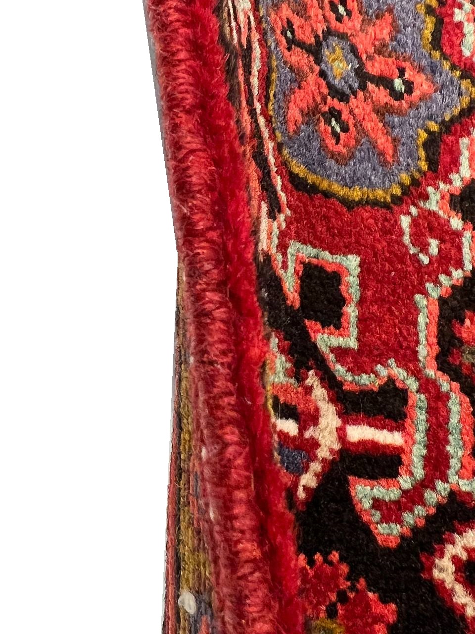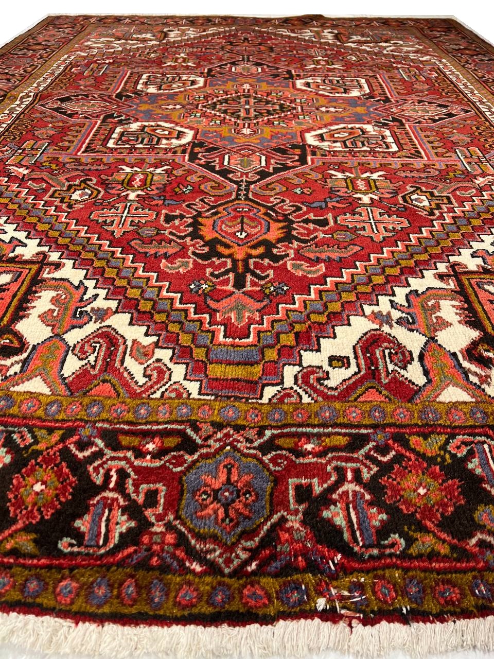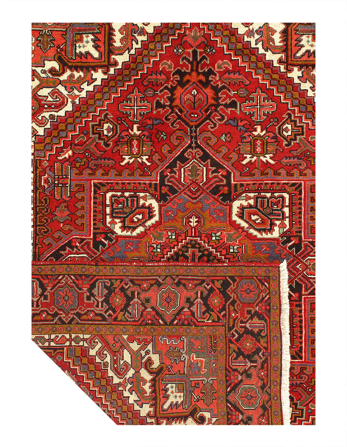 The brilliant Red field bears a central Ray of Life and many highly abstracted floral shapes in this fascinating antique Heriz rug. Four flower blossoms cluster at different points along the mid-lines, separated by riyu symbols in the shape of arrows. The patterns carry blue, pink and white colors. A broad navy border presents scrolled geometric shapes. Three separate, narrow guard borders frame the border, each carrying a geometric pattern. Heriz is a community in Northwestern Iran famed for producing extremely long lasting carpet and rugs, items that often pass down from one generation to another during many years. These antique rugs possess a coarse, durable consistency. The type of rugs made in Heriz are also sometimes produced in other places, including Bakhshaish and Gorevan. The highest grade of rug from the Heriz area is the Serapi, which was made around the turn of the Twentieth Century. Most Heriz rug contain prominent knots but the Serapi are describes as smoother.