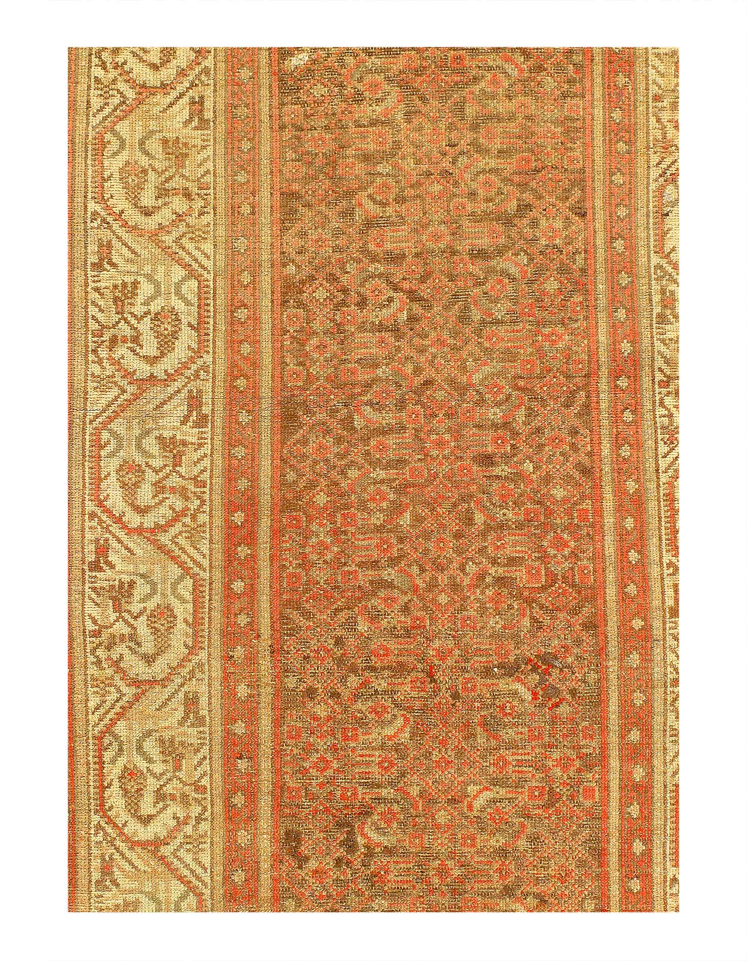 Antique Malayer Runner, Like many gorgeous Malayer runners, this piece is designed to lead the eye down through the vibrant collection of shapes and tones. A soft beige background defines the largest border that the carpet; a pleasant collection of angular flowers create flow and movement within this border, standing out against the backdrop. The large frame is further hemmed by two beautiful red lines, containing a series of diagonally running green forms. An rust background creates an elegant flow at the center of the runner, allowing the forms within to appear even more defined.