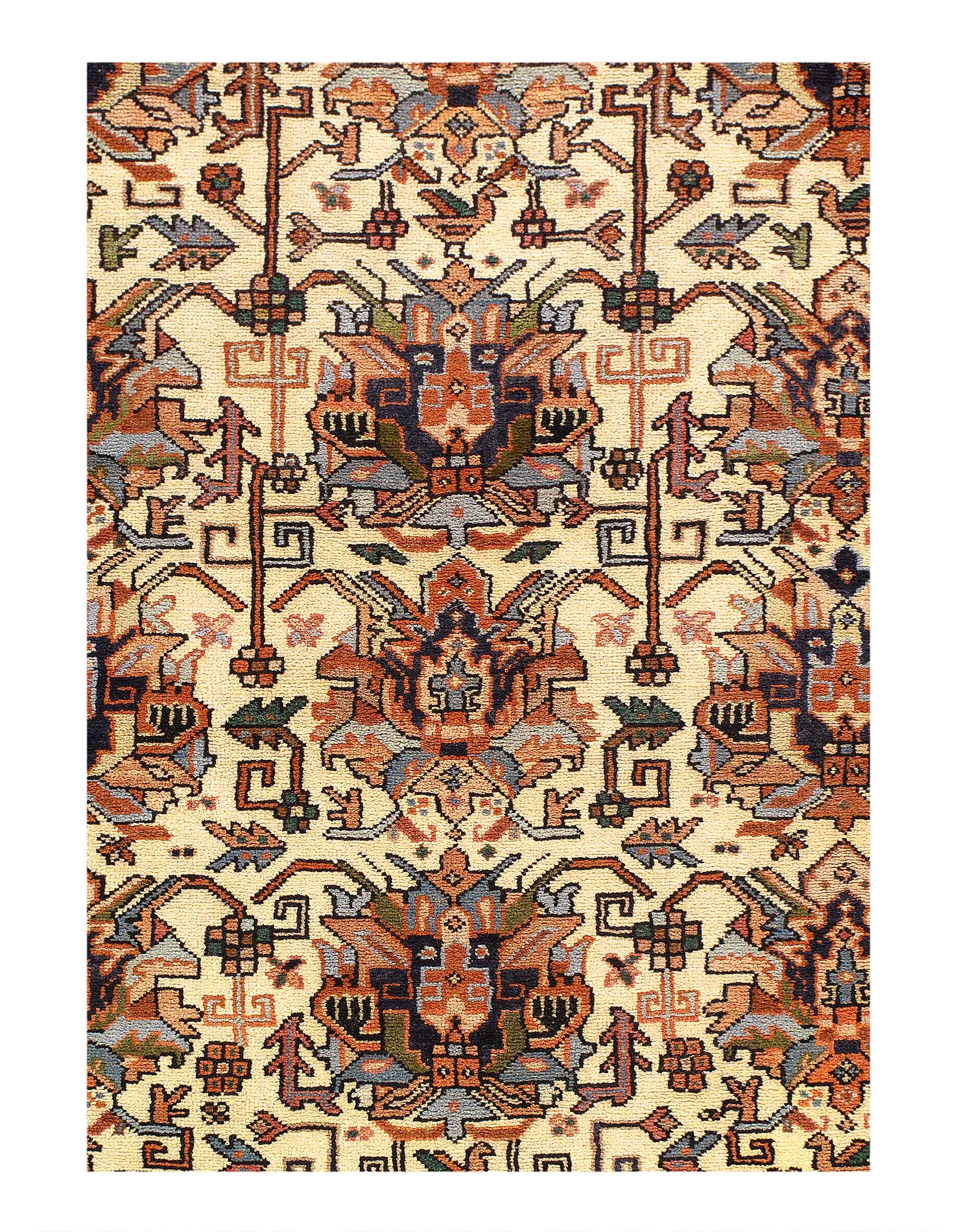 The cypress tree design is long-lived and represents eternal life. The willow tree is a symbol of love. These repeated motifs in the carpet provide a clue as to the intended meaning of the weaver. The regular geometric pattern of the antique Persian Heriz Serapi carpet brings in the idea of a sense of cosmic order and the divine.