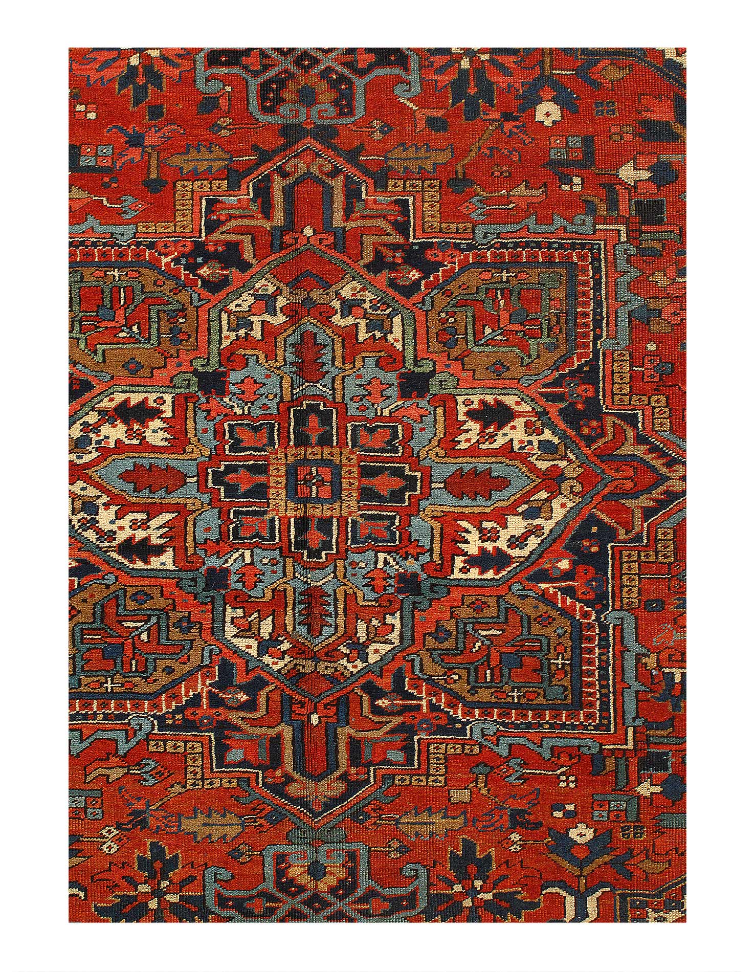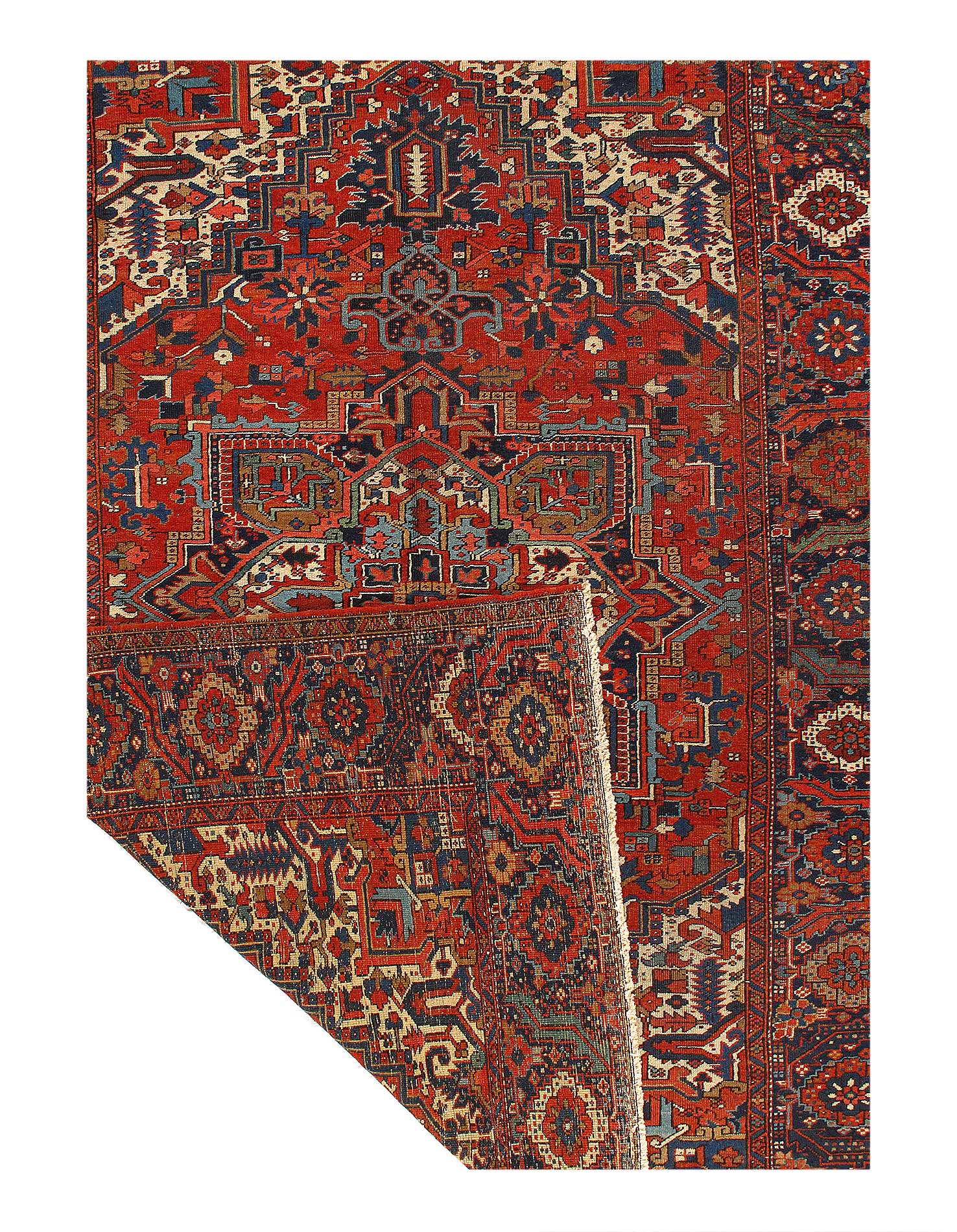 Extremely Impressive Antique Red Medallion Persian Heriz Rug, country of origin: Persia, Circa date: 1920 – Heriz rugs, named after the town of Heris in northwestern Iran (formerly Persia), have captivated rug enthusiasts for centuries with their bold geometric patterns, rich colors, and enduring quality. This particular rug exemplifies the enduring qualities that have cemented Heriz rugs’ place among the most sought-after textiles in the world.