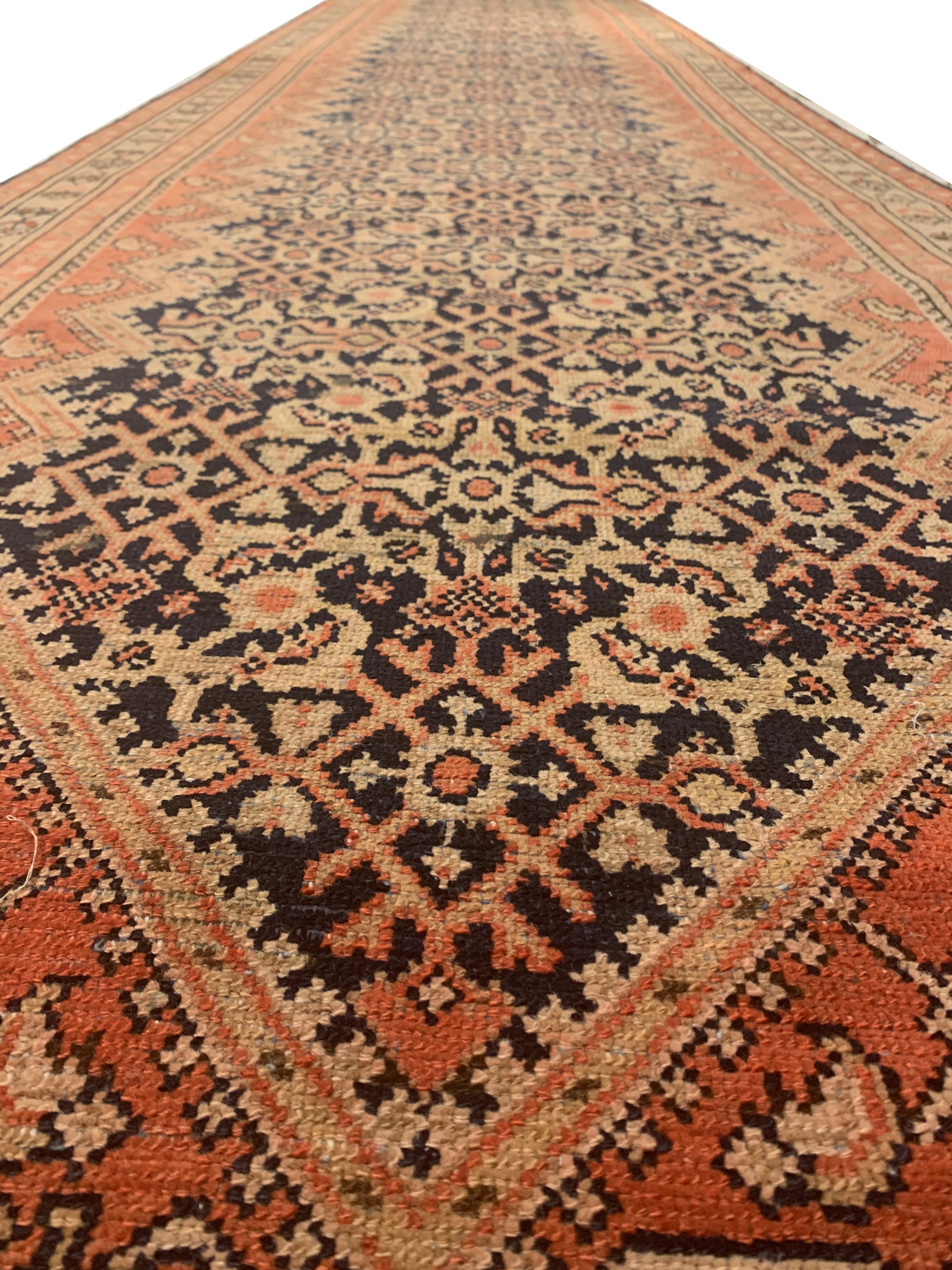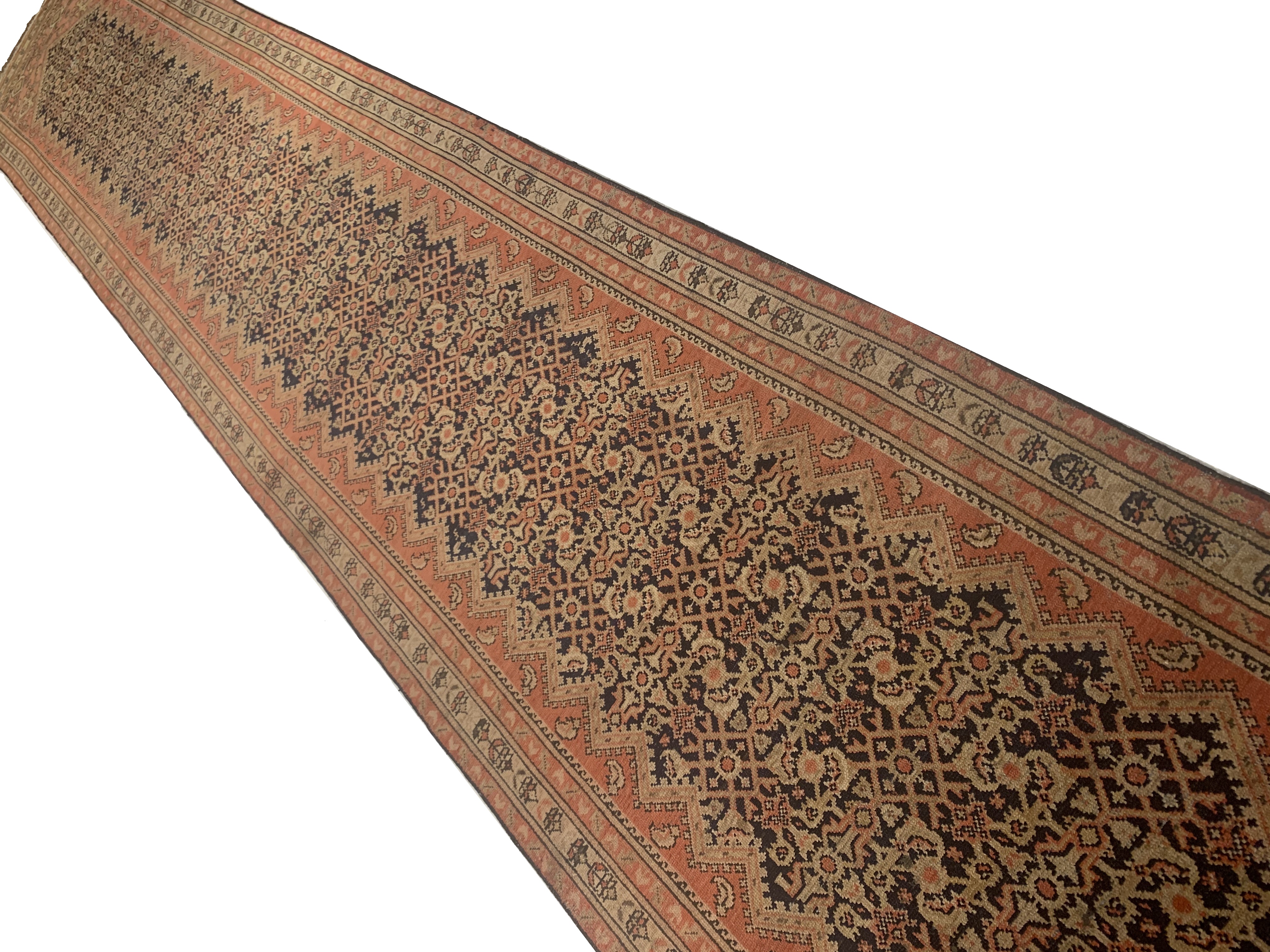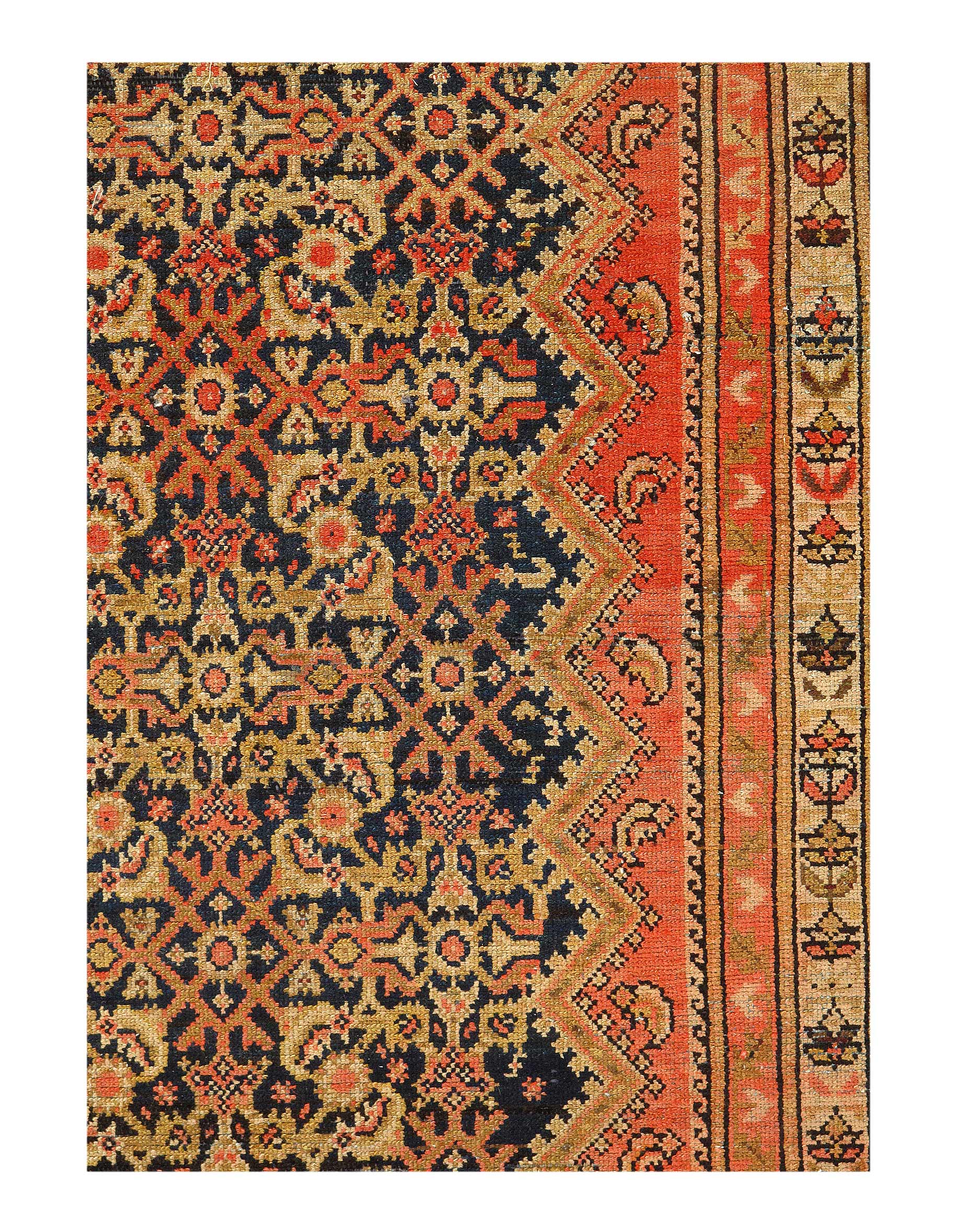 Antique Malayer Runner, Country of Origin: Persia, Circa: 1920 — Like many gorgeous Malayer runners, this piece is designed to lead the eye down through the vibrant collection of shapes and tones. A soft beige background defines the largest border that the carpet; a pleasant collection of angular flowers create flow and movement within this border, standing out against the backdrop. The large frame is further hemmed by two beautiful red lines, containing a series of diagonally running green forms. An inky black background creates an elegant flow at the center of the runner, allowing the forms within to appear even more defined.