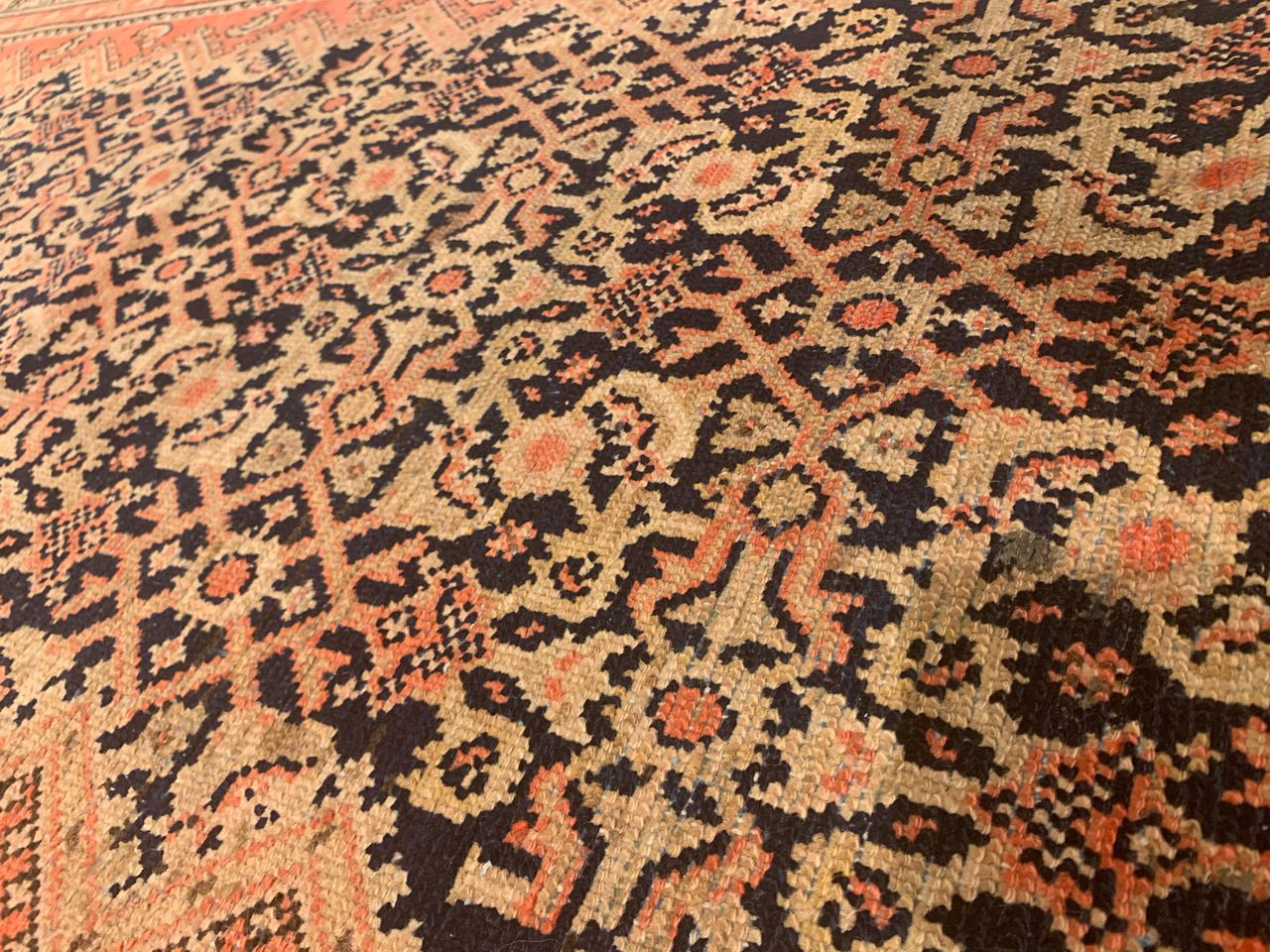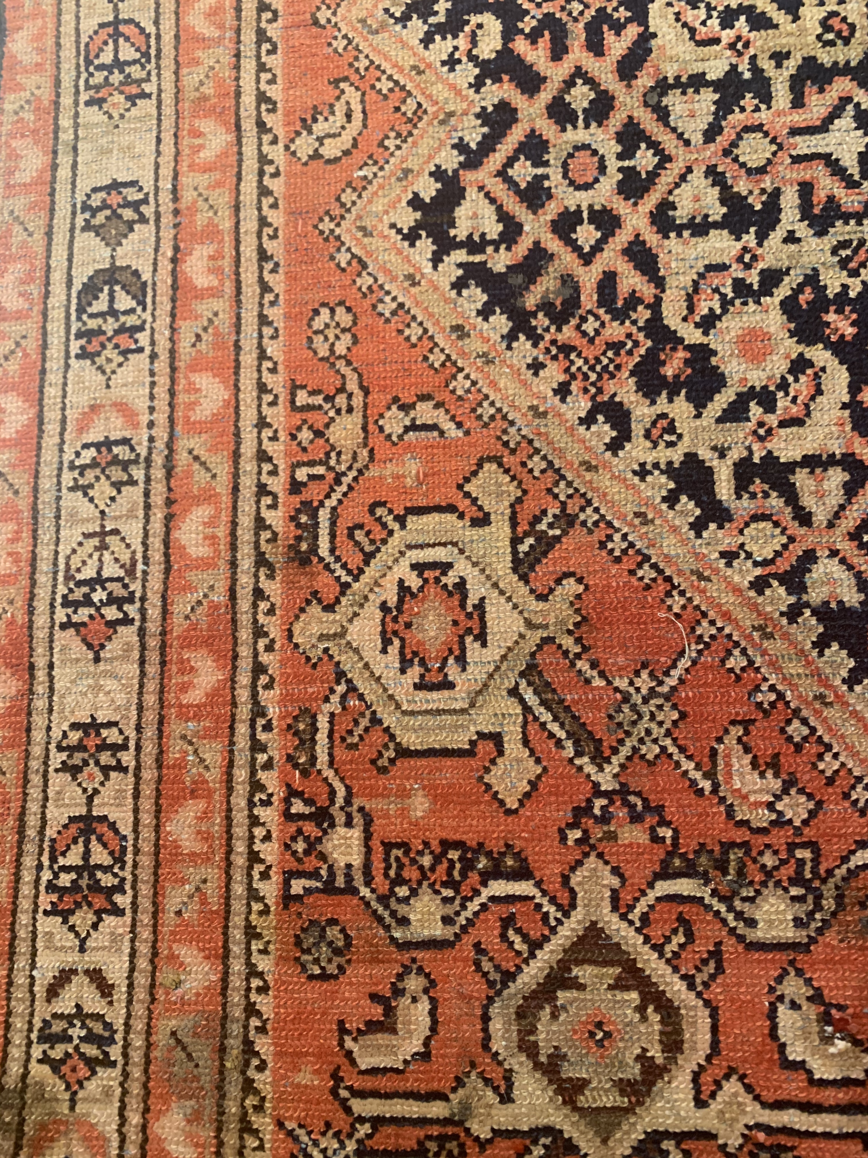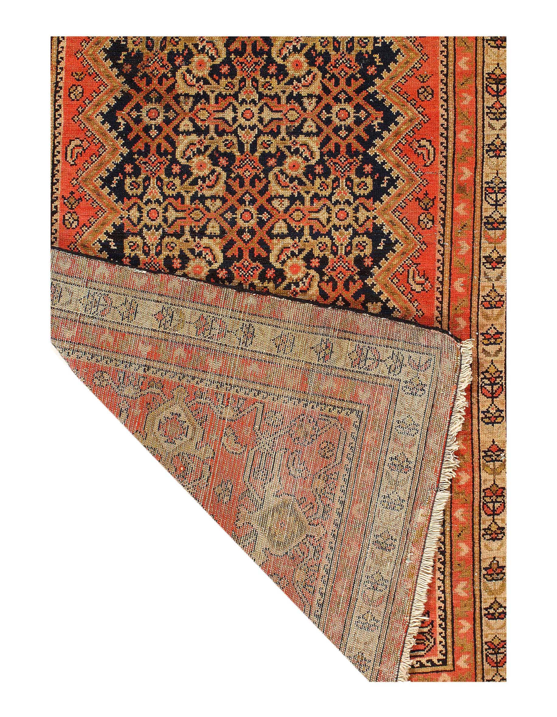 Antique Malayer Runner, Country of Origin: Persia, Circa: 1920 — Like many gorgeous Malayer runners, this piece is designed to lead the eye down through the vibrant collection of shapes and tones. A soft beige background defines the largest border that the carpet; a pleasant collection of angular flowers create flow and movement within this border, standing out against the backdrop. The large frame is further hemmed by two beautiful red lines, containing a series of diagonally running green forms. An inky black background creates an elegant flow at the center of the runner, allowing the forms within to appear even more defined.