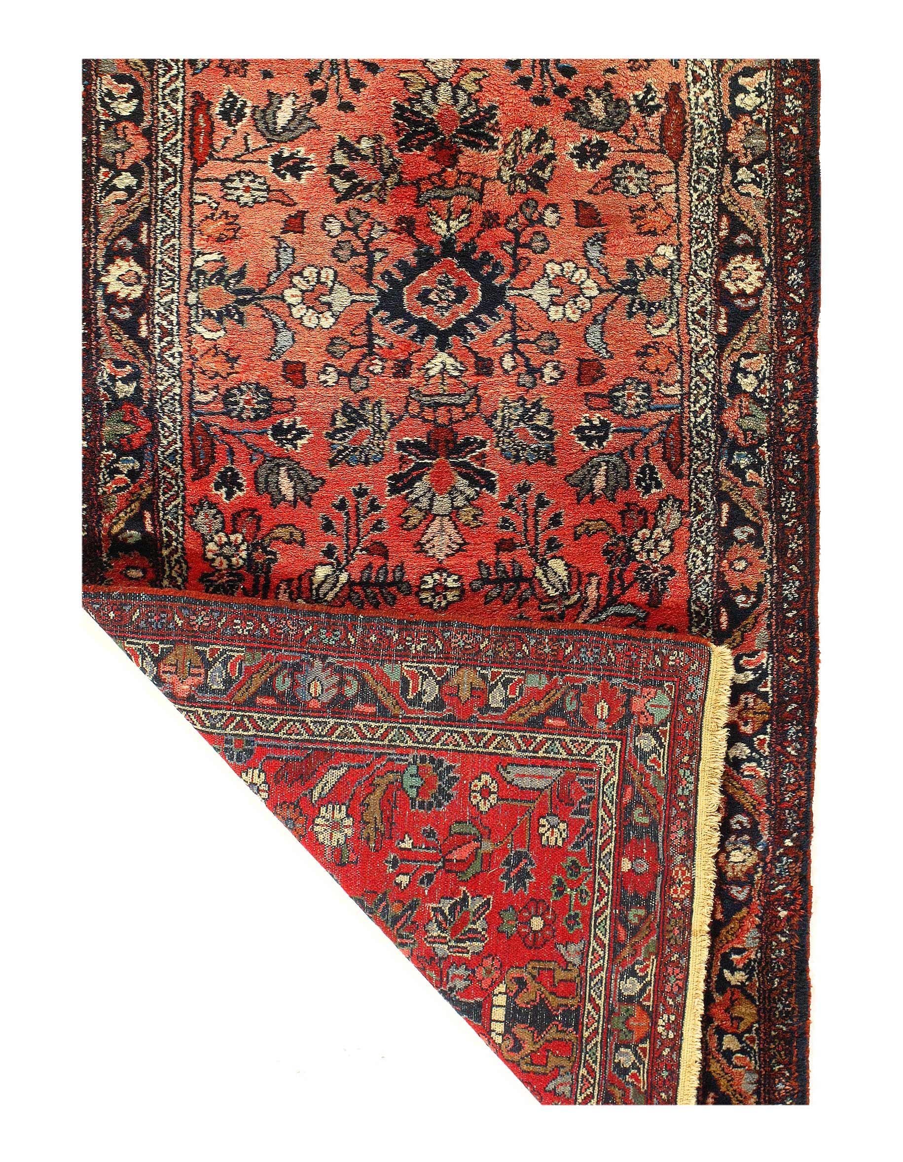 This is an antique handmade sarouk runner from the 1900s The piece was crafted from lamb's wool on a cotton foundation and was vegetable dyed. It has a dense, soft pile, and excellent quality, to ensure that you will enjoy it for years to come