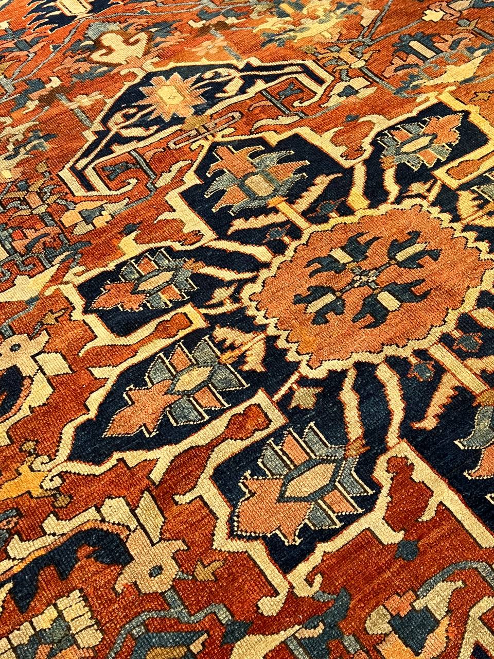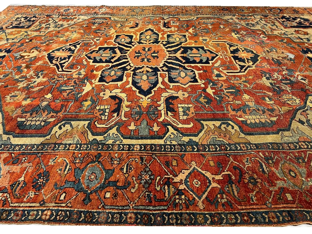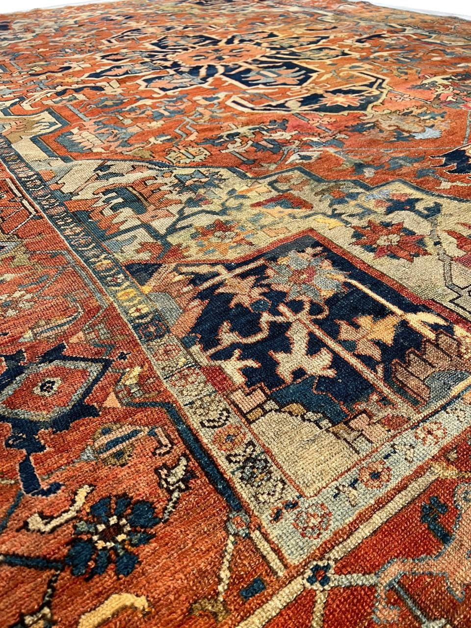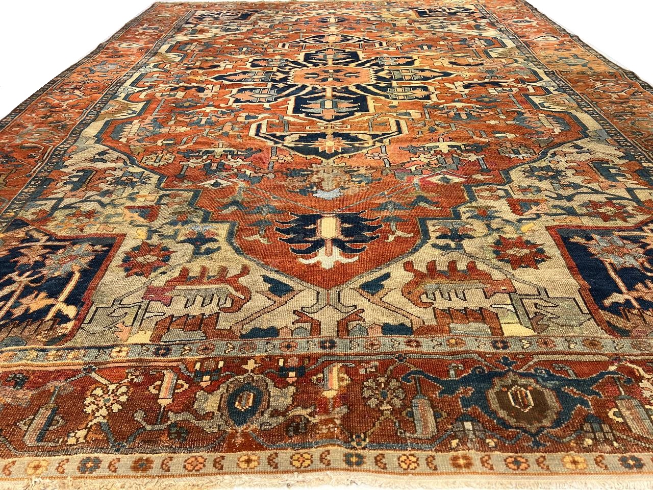Beautiful Antique Persian Serapi Area Rug, Country of Origin: Persia, Circa date: 1920 β Antique Persian Heriz Serapi rugs include some of the most desirable Persian rugs in the world. This magnificent piece is an excellent example of the colors and designs that made these rugs an important part of interior design. Antique Persian Serapi rugs were favorites in the early days of the USA and were often found in state and federal buildings, including the White House.