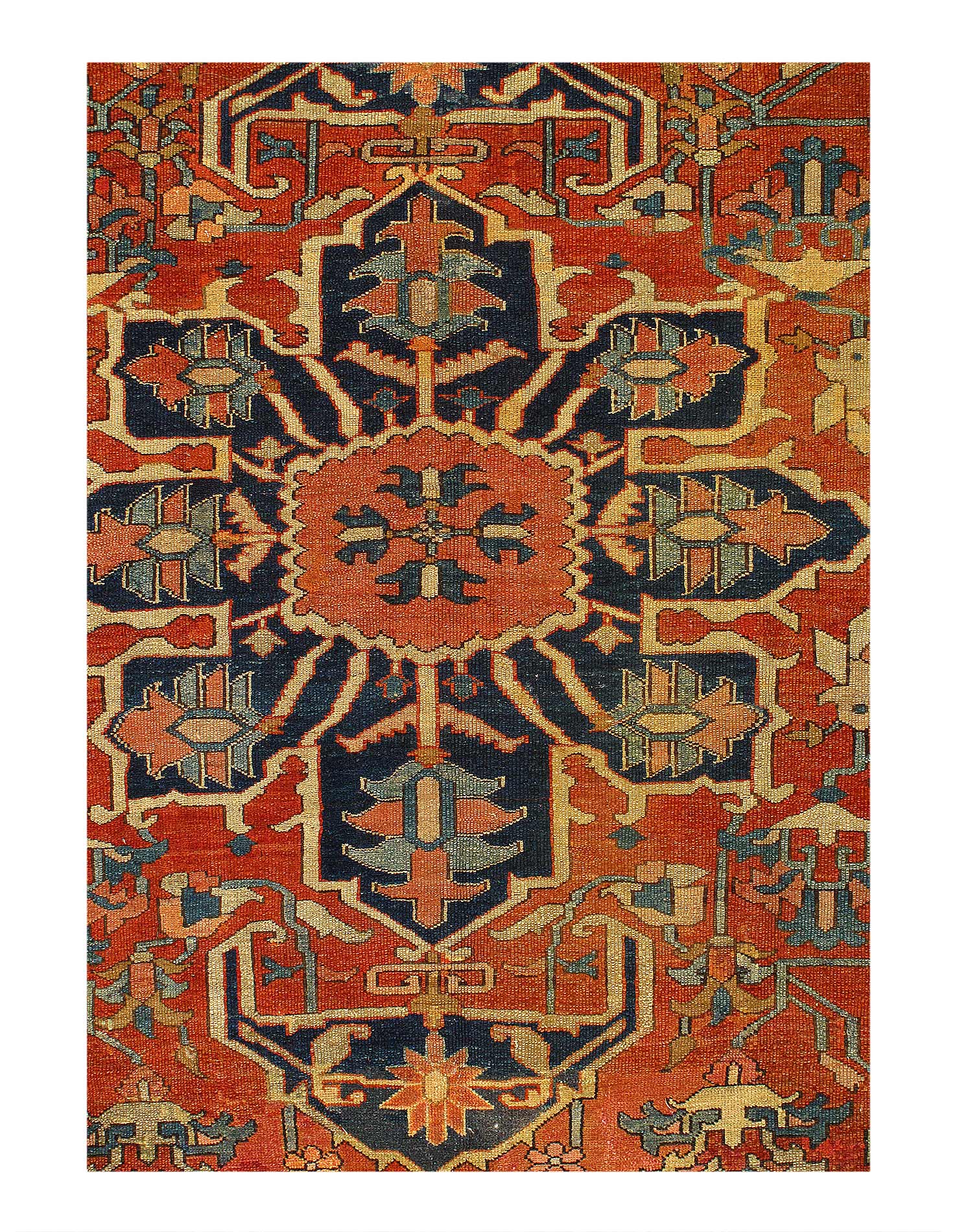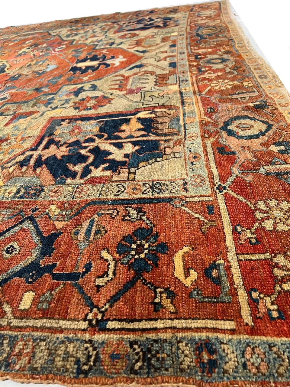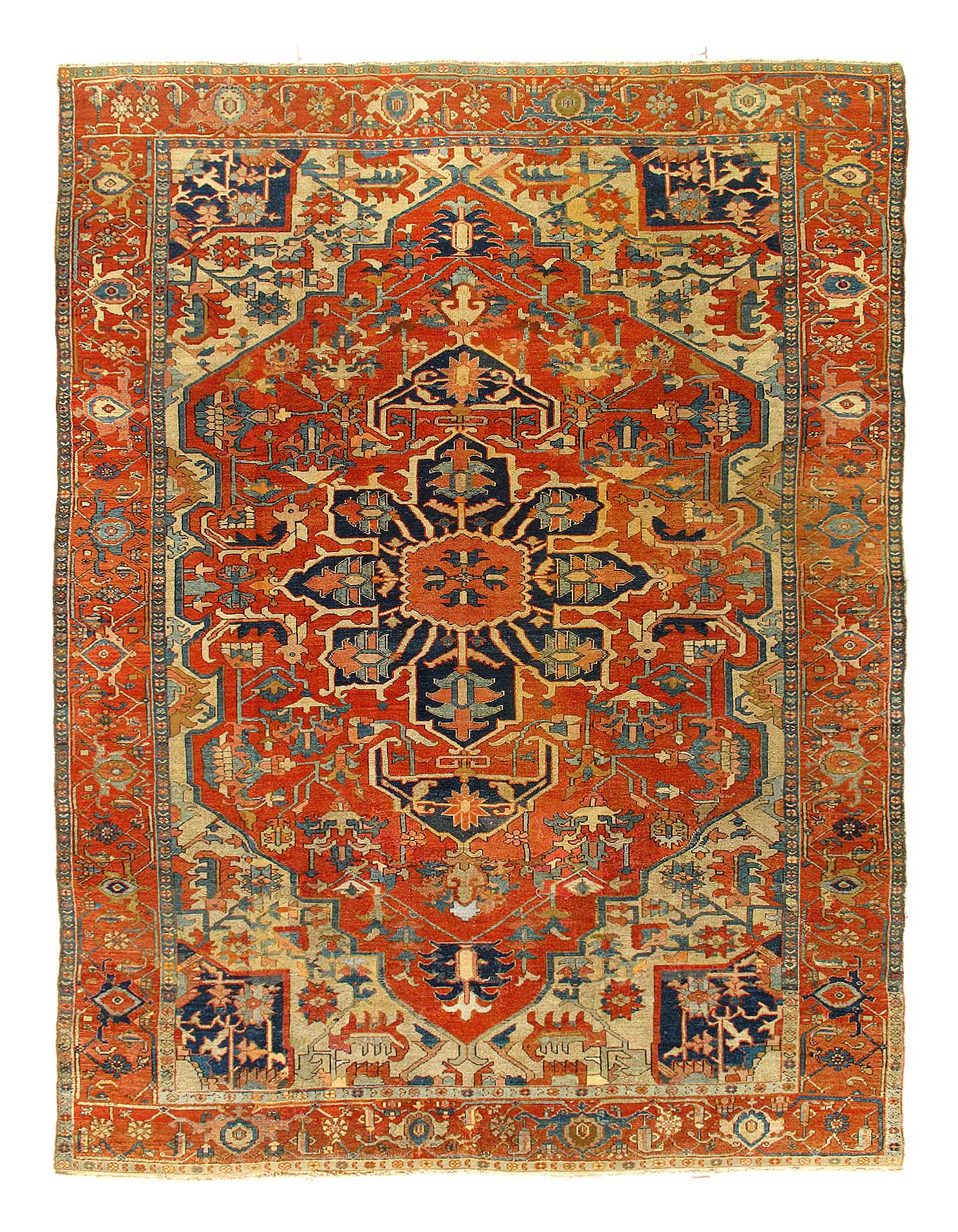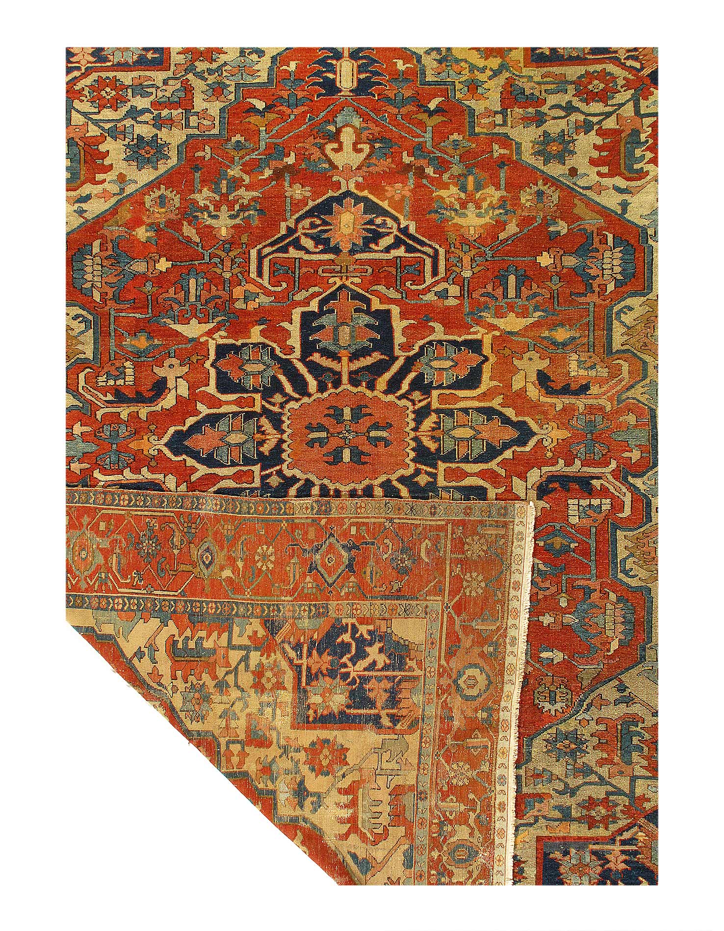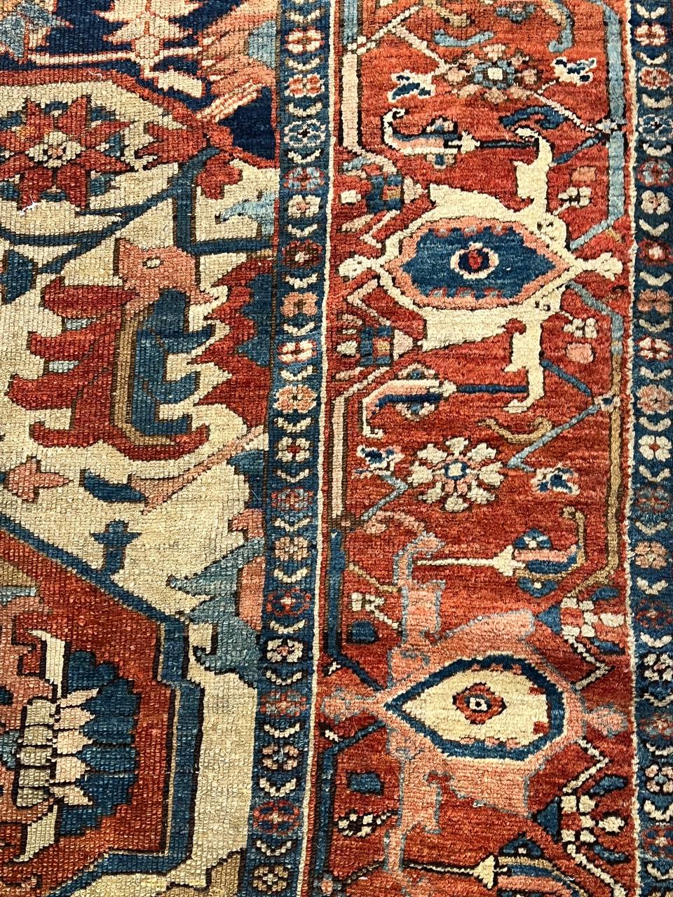 Beautiful Antique Persian Serapi Area Rug, Country of Origin: Persia, Circa date: 1920 β Antique Persian Heriz Serapi rugs include some of the most desirable Persian rugs in the world. This magnificent piece is an excellent example of the colors and designs that made these rugs an important part of interior design. Antique Persian Serapi rugs were favorites in the early days of the USA and were often found in state and federal buildings, including the White House.
