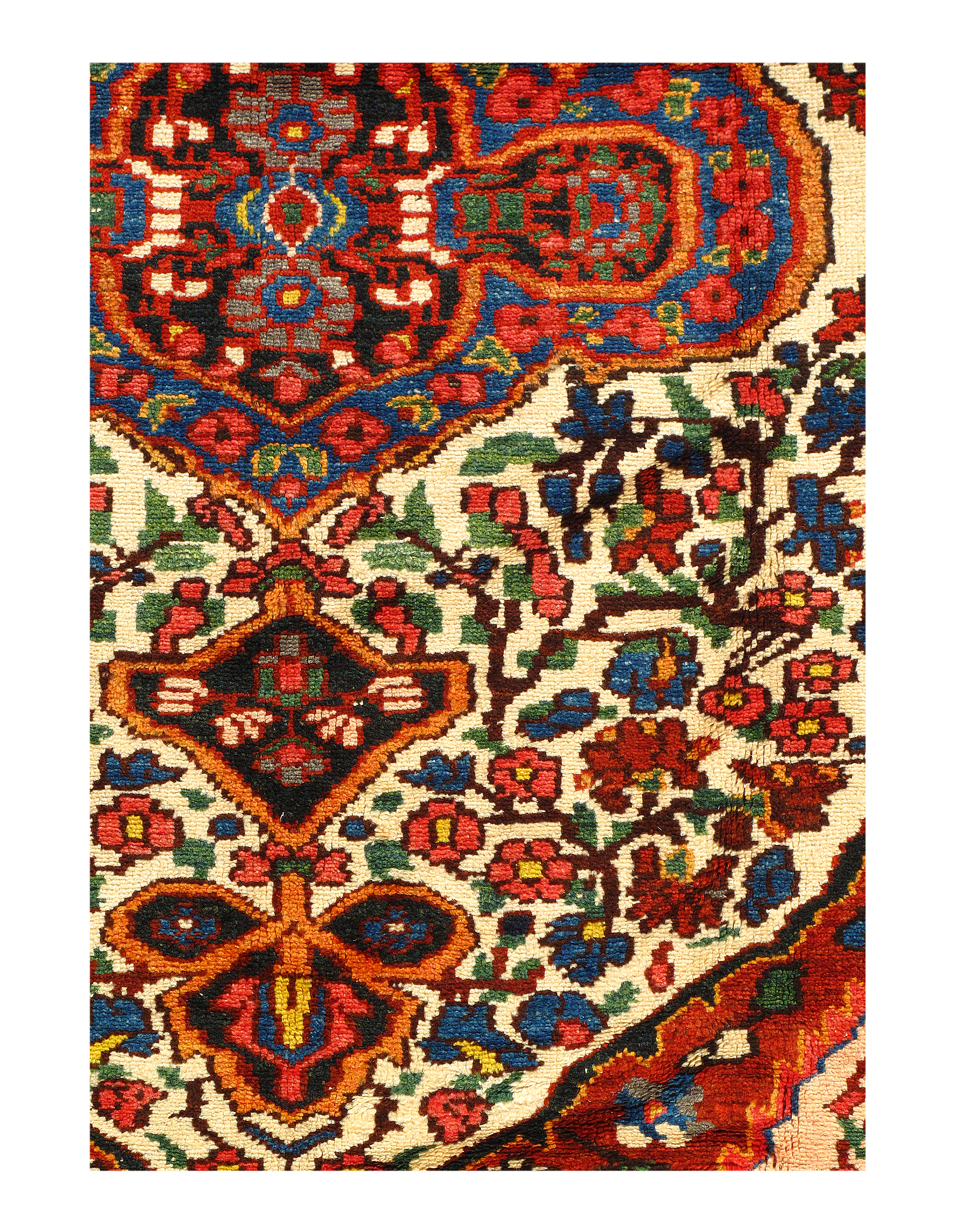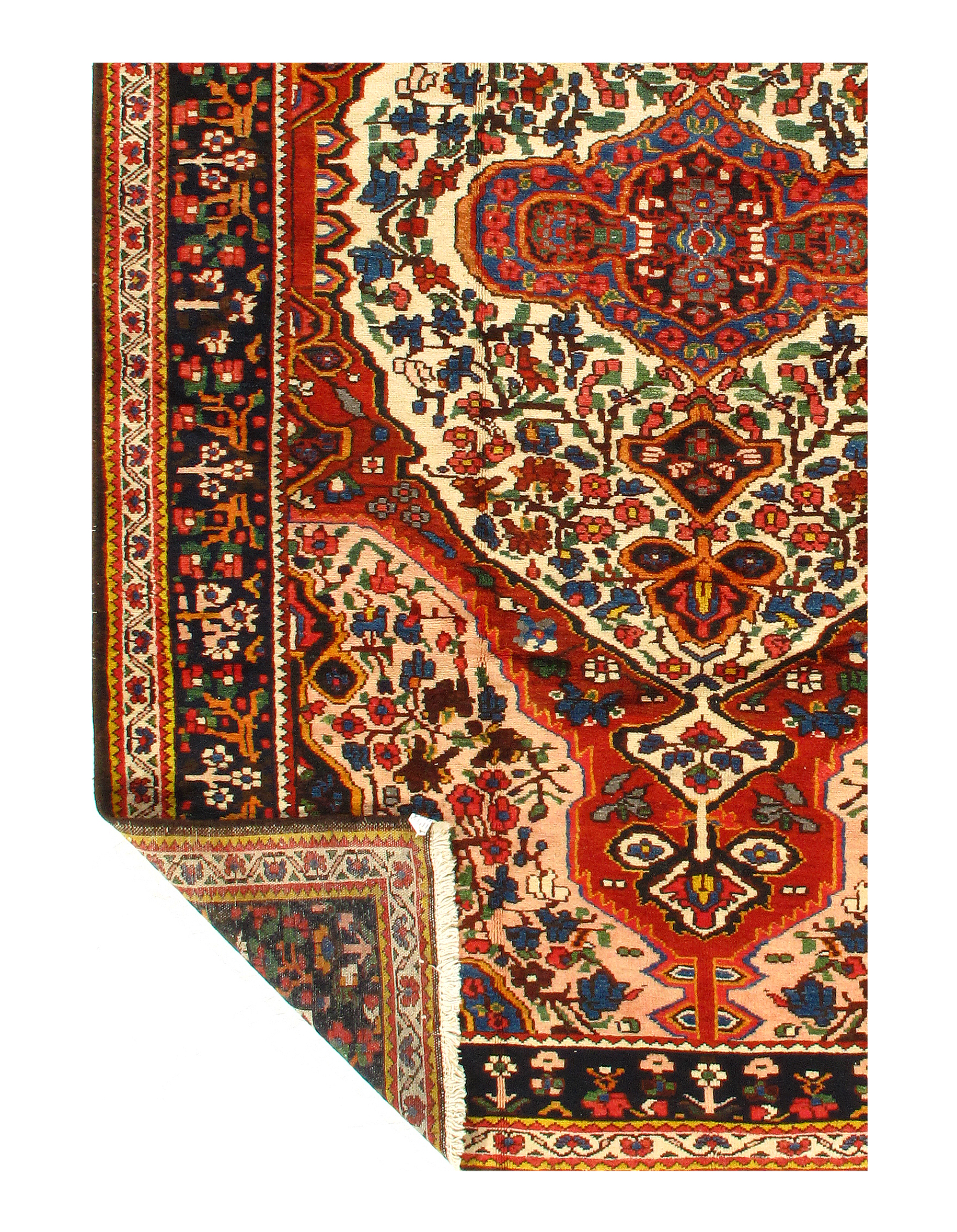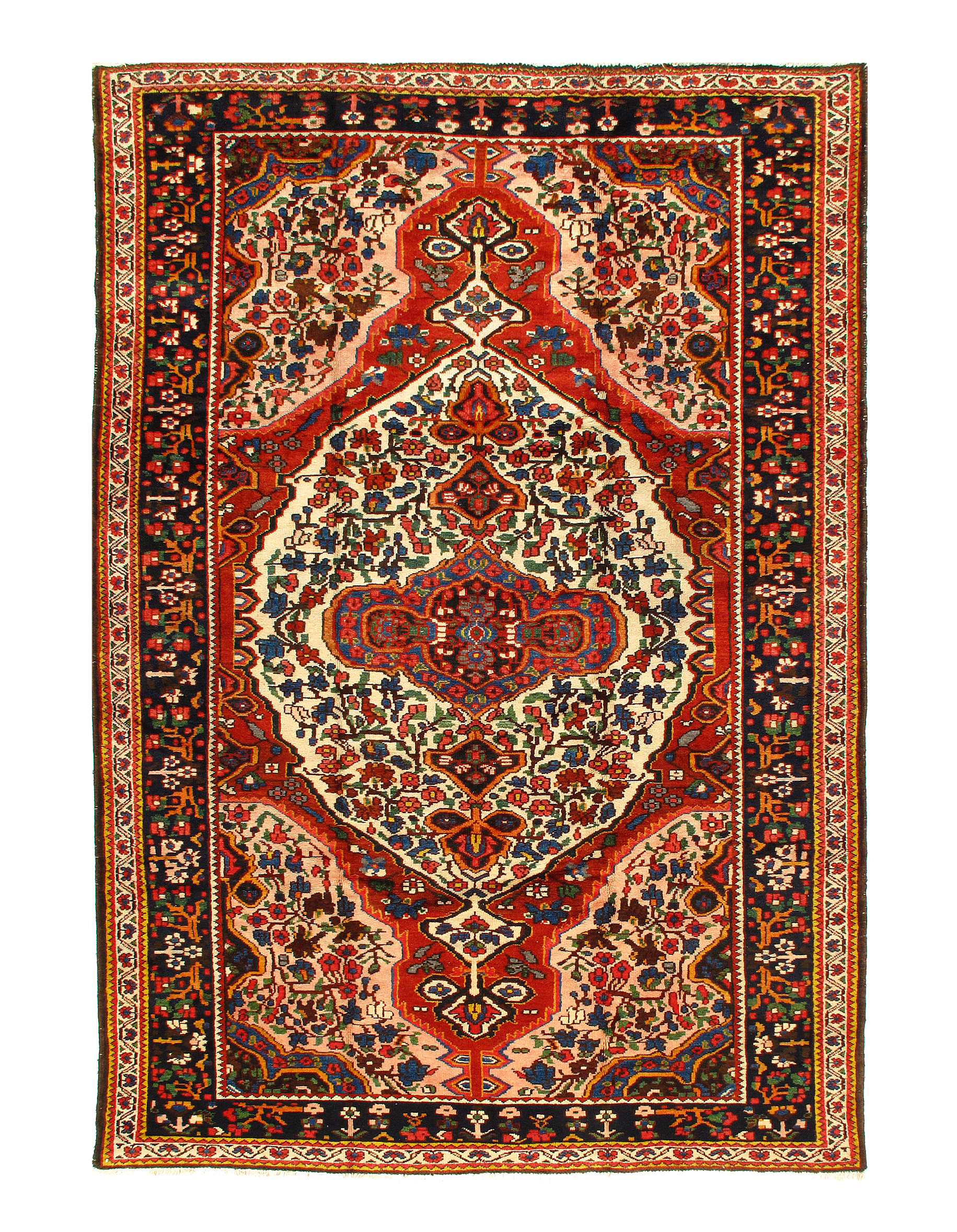 Bakhtiari oriental rugs woven before 1950 were examples of tribal rugs, which are traditionally smaller rugs, with wool yarns hand knotted onto a wool foundation. The nomadic lifestyle of these sheep herding tribes, moving their stock from winter to summer pasture, dictated the necessity of smaller and easily movable looms, using the wool from their sheep for the foundation and pile of their rugs.