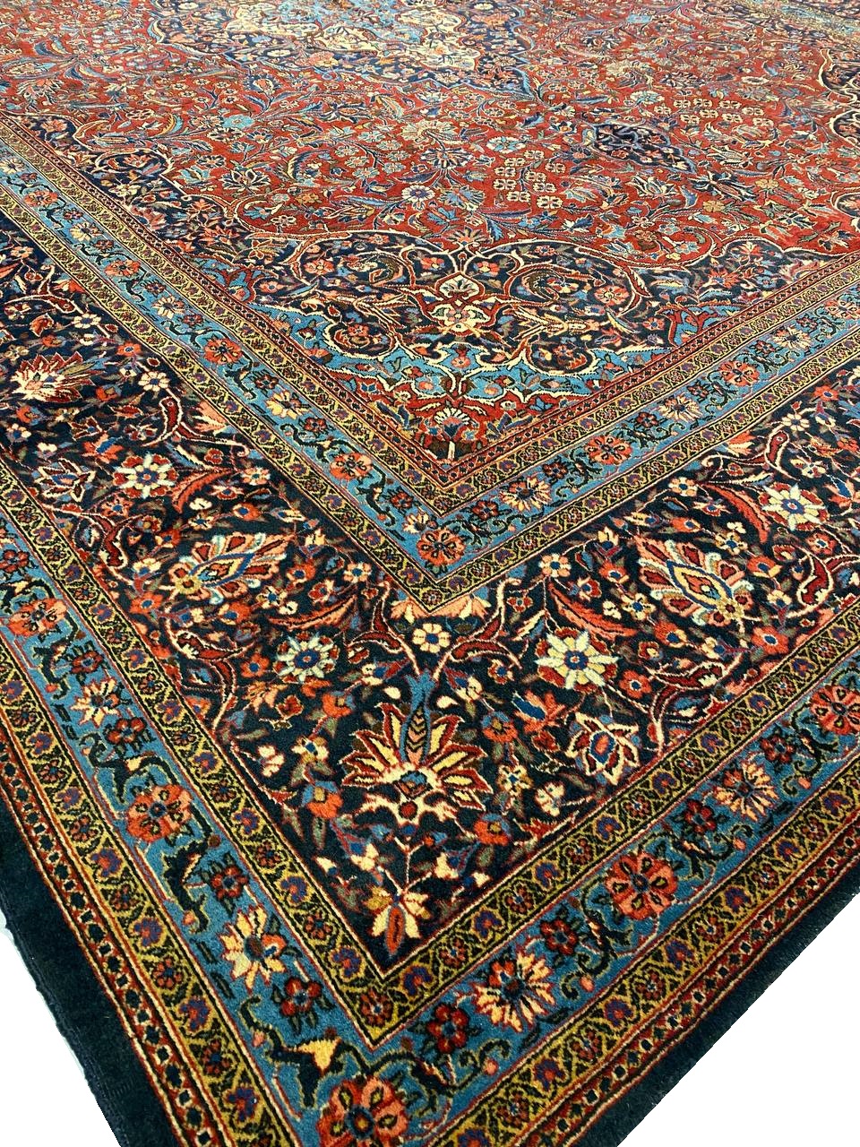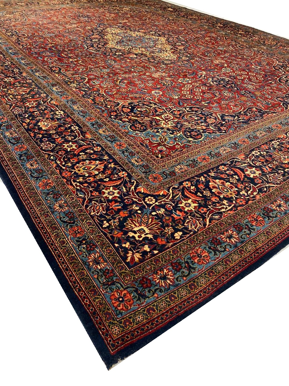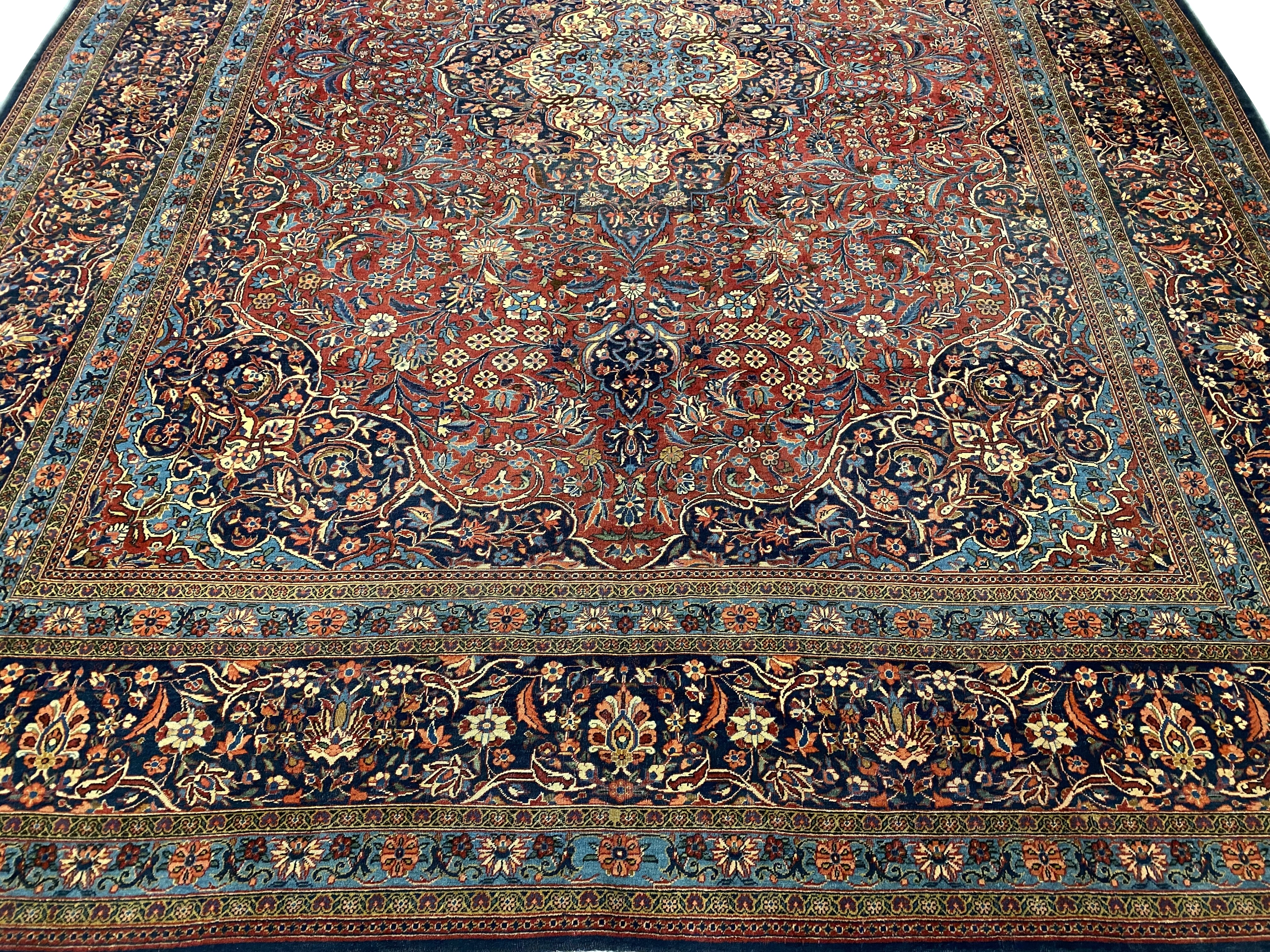 Beautiful and Finely Woven Antique Persian Kashan Rug, Country Of Origin: Persia, Circa Date: Late 19th Century – Attributed to Kashan’s elusive Mohtashem atelier, this inscribed antique Persian carpet features an incomparable medallion-and-pendant cartoon spread over an immense palace-sized field. The distinctive coffered composition focuses on a superb ogival medallion embellished with re-curving calyces and undulating ribbons. An expanse of spiraling vine-scrolls adorns the fiery brick-colored ground that encircles the stunning medallion and cuts into the decorative inner borders, which are filled with a lush network of millefleur forests that complement the superlative borders. Ogival arches and ornamental niches give the regal composition an architectural formality infused with Persian geometry. The expansive field of this beautiful antique Persian Kashan rug is framed by outstanding flower head borders that are drawn with an extraordinary level of finesse and detail. Subtle color changes, minute outlines and expert compositional details exaggerate the extreme beauty of this antique rug from Kashan.