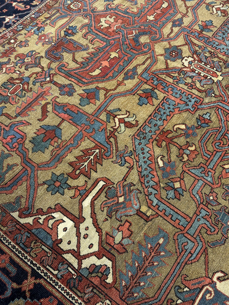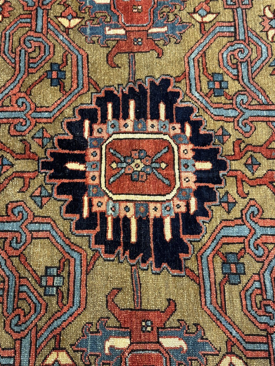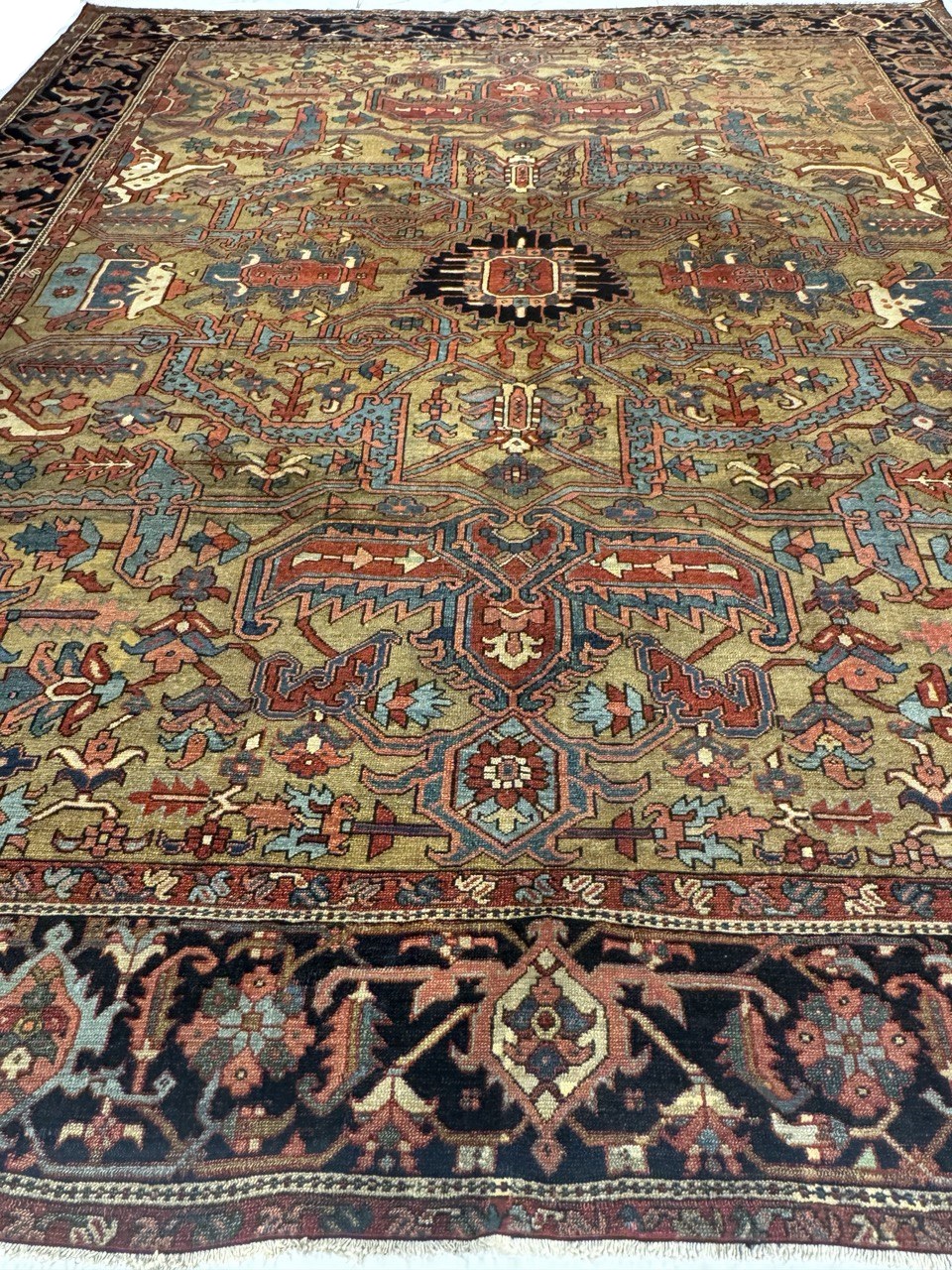 Distressed Antique Persian Serapi Rug with Relaxed Federal Style 10'2'' x 11'11''. Emanating exquisite grace and architectural design elements with a lovingly time-worn composition, this hand-knotted wool antique Persian Serapi rug can beautifully blend modern, contemporary, and traditional interiors. It features an central octogram medallion anchored with a palmette pendant at either end surrounded by a rectilinear geometric botanical pattern. It is enclosed with a turtle scroll vine border flanked with an inner and outer star meander guard border. With its relaxed Federal charm and rustic sensibility, this antique Persian palace rug emanates so much character and will boost the coziness factor in nearly any space. Bespeaking age and history, this lovingly time-worn Persian rug is the perfect complement to interiors with similar richness and rustic vibes including natural wood furnished chalets, estates, cottages, and mountainside abodes as found in Colorado, Lake Tahoe, or the Adirondacks. Distressed. Desirable Age Wear. Abrash. Hand-knotted wool.